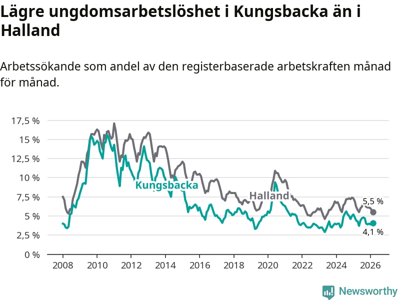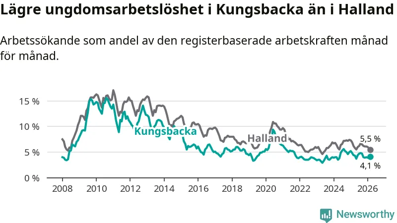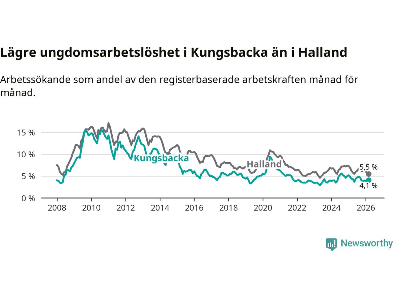 Precis som den totala arbetslösheten ligger ungdomsarbetslösheten i Kungsbacka lägre än i Halland som helhet. Skillnaden mellan kommunen och länet är 1,4 procentenheter.