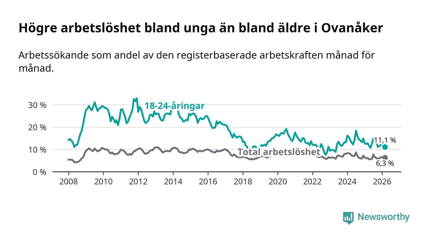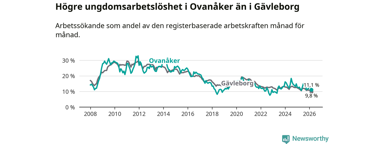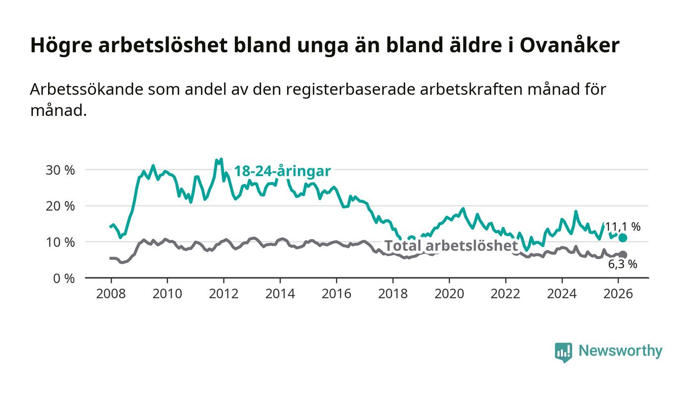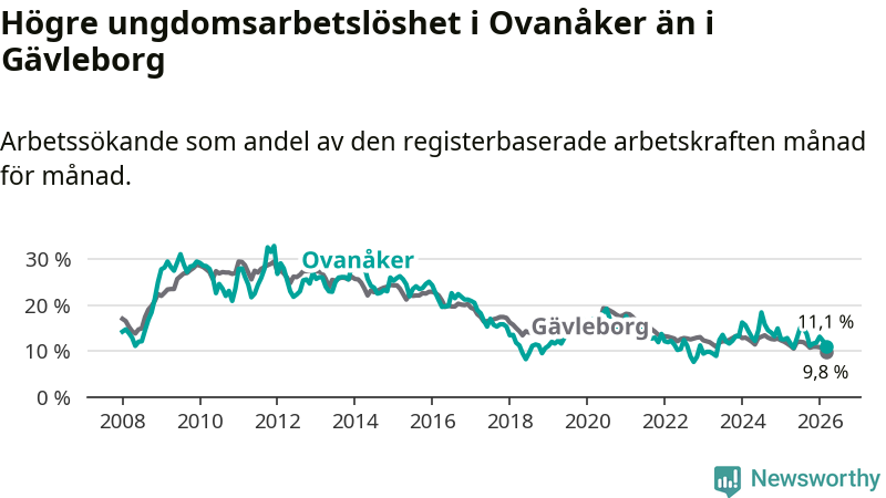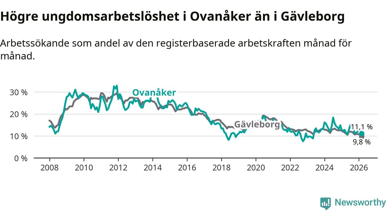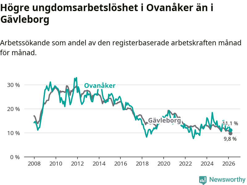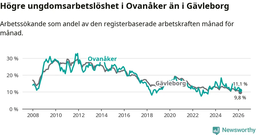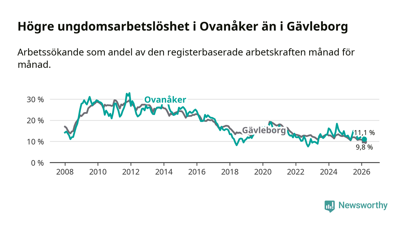 Medan Ovanåker har lägre total arbetslöshet än Gävleborg, ligger ungdomsarbetslösheten 1,3 procentenheter högre i Ovanåker.