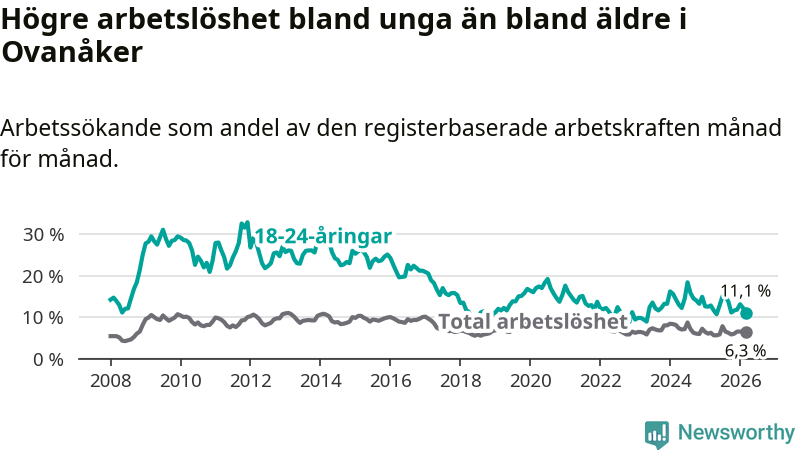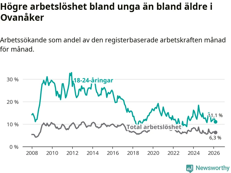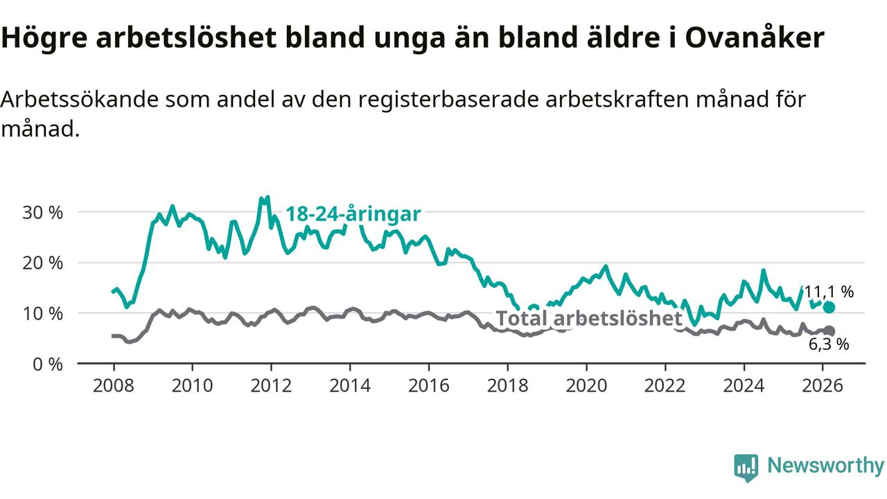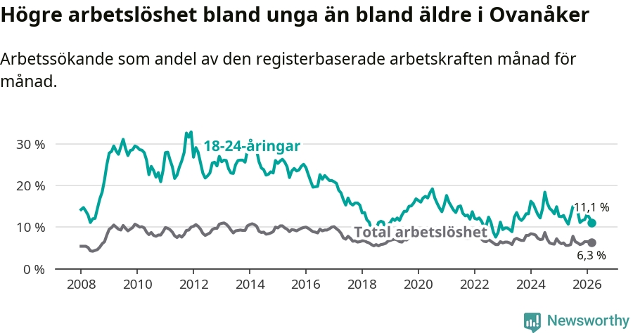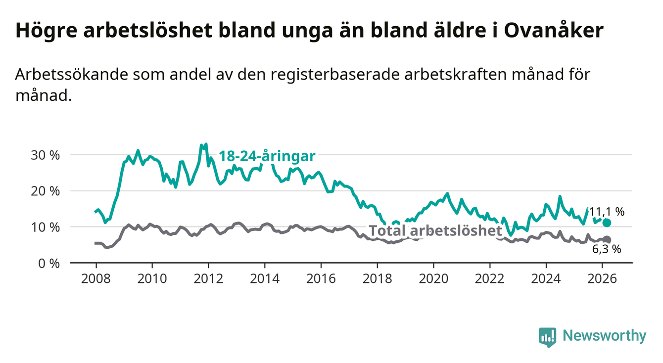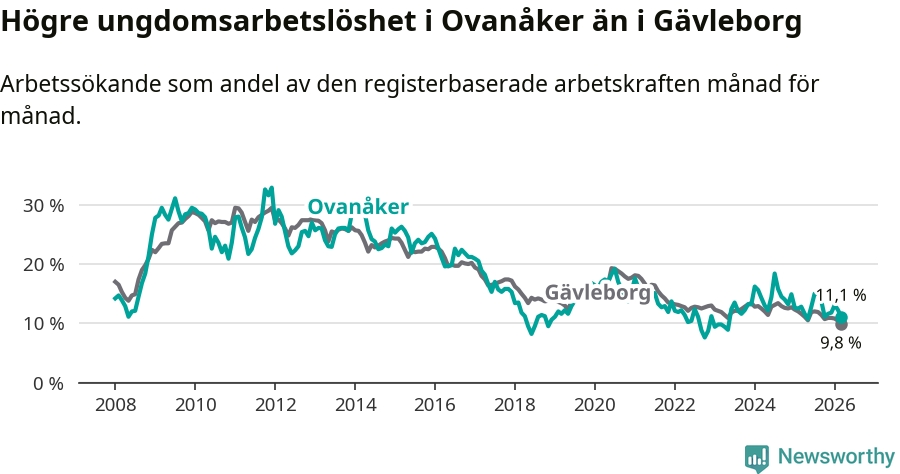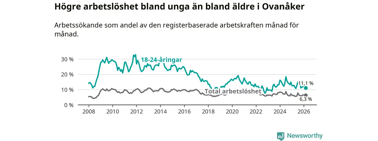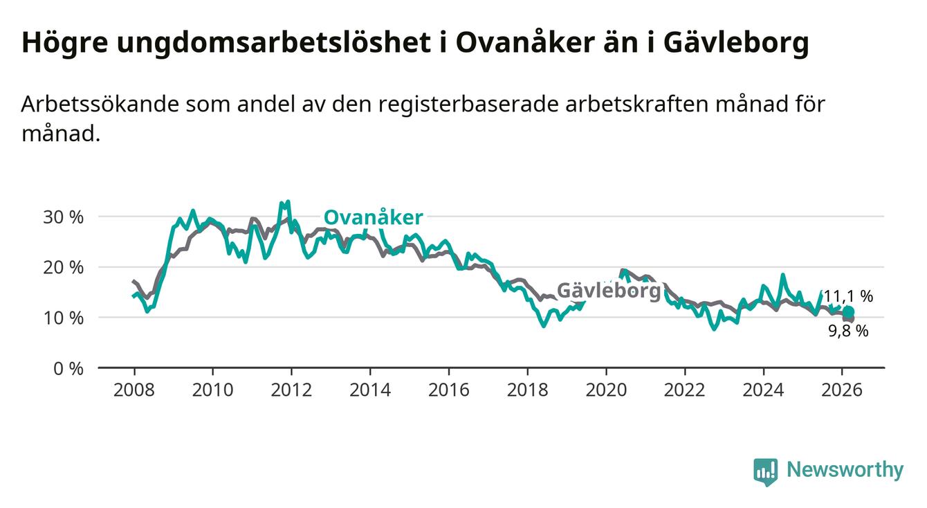 Medan Ovanåker har lägre total arbetslöshet än Gävleborg, ligger ungdomsarbetslösheten 1,3 procentenheter högre i Ovanåker.