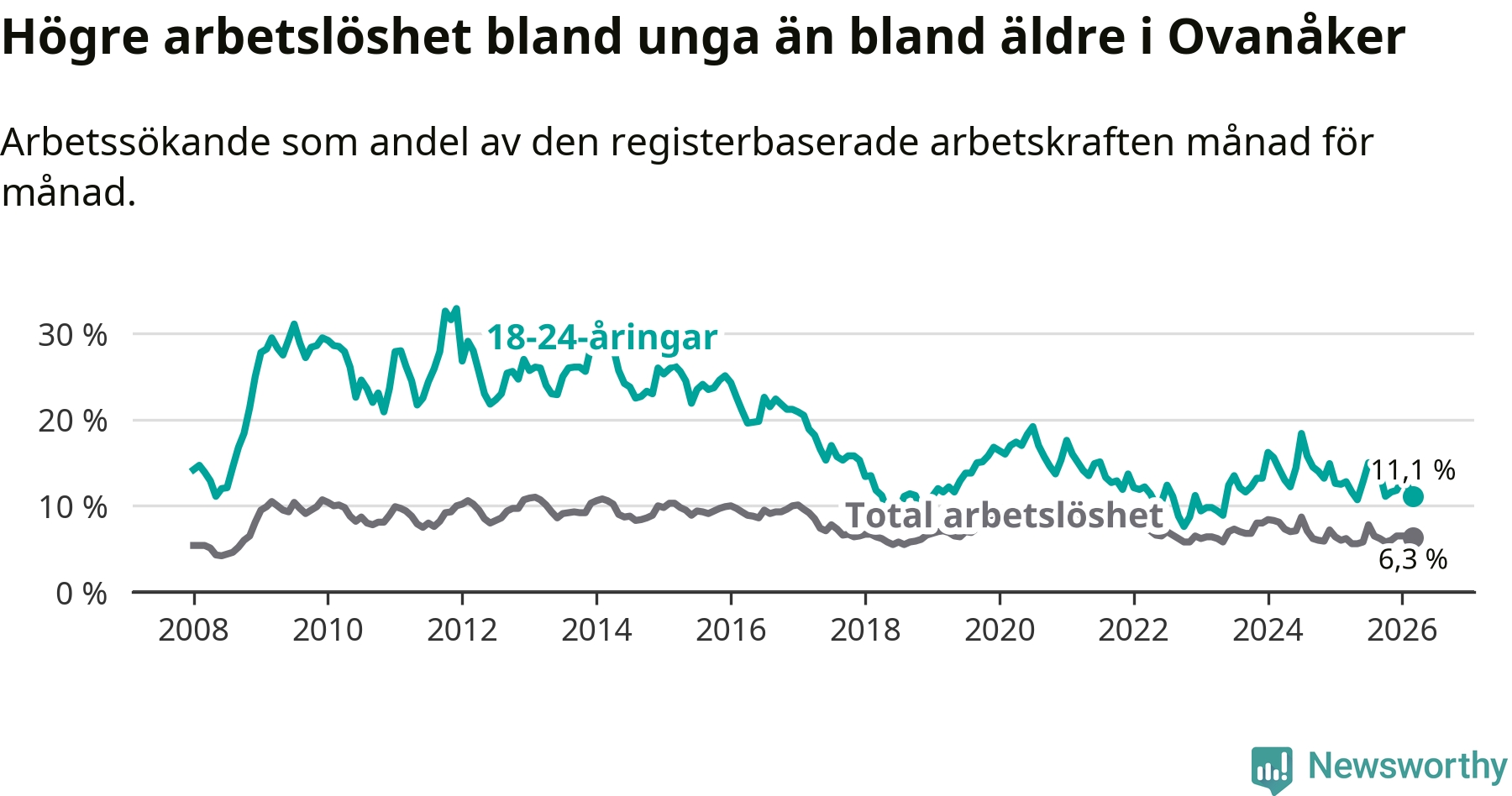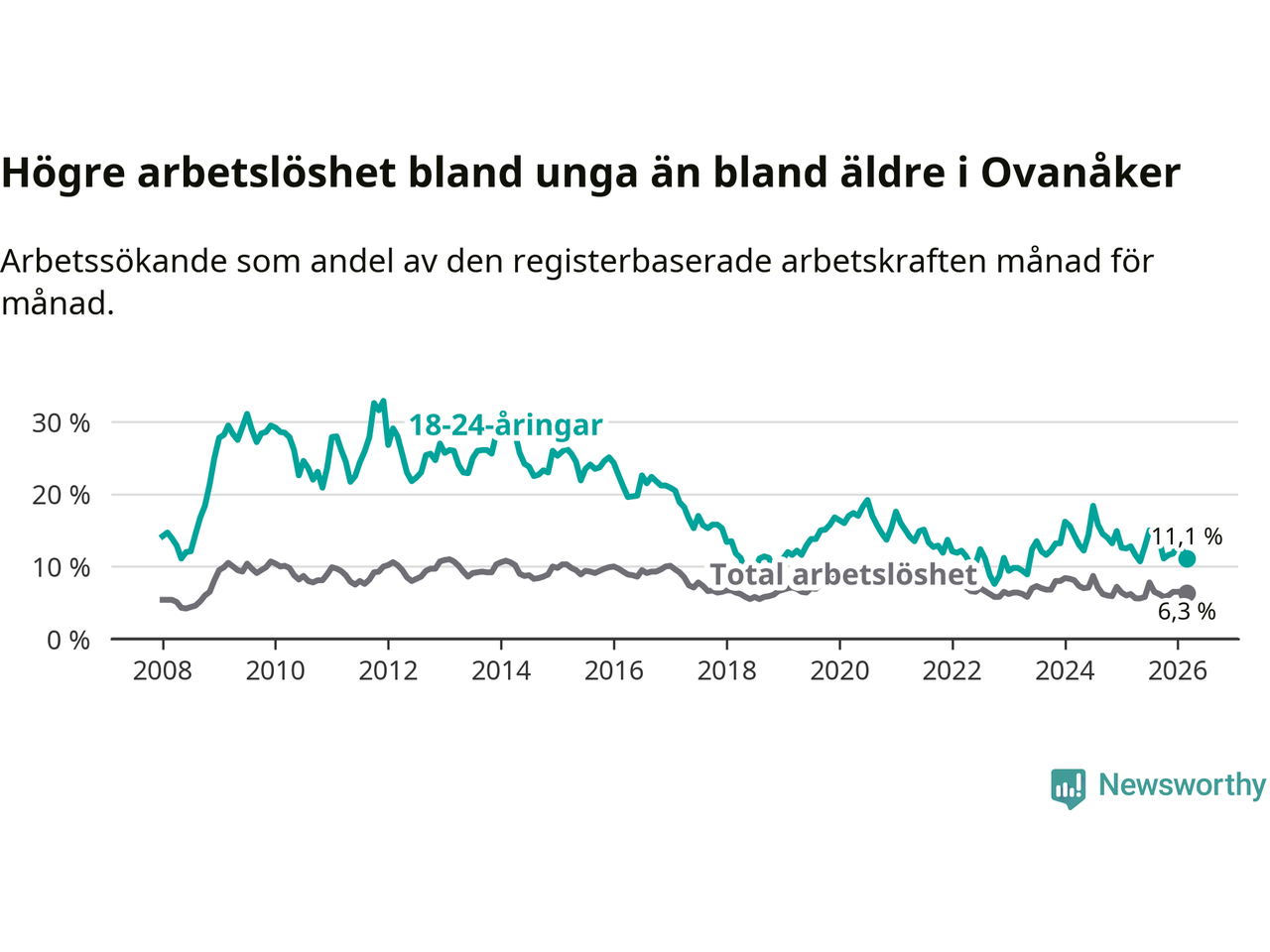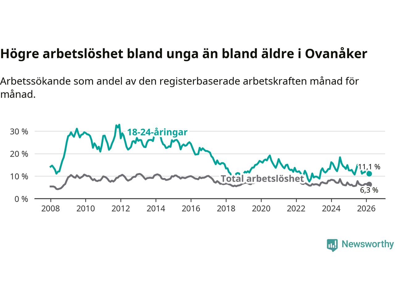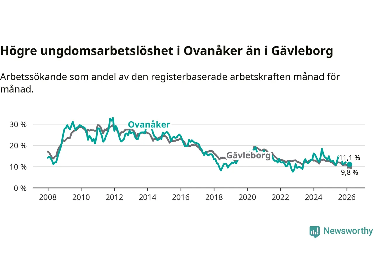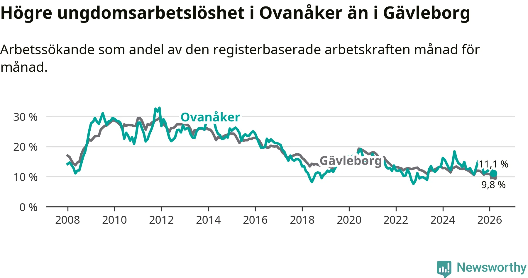 Medan Ovanåker har lägre total arbetslöshet än Gävleborg, ligger ungdomsarbetslösheten 1,3 procentenheter högre i Ovanåker.
