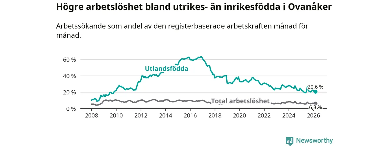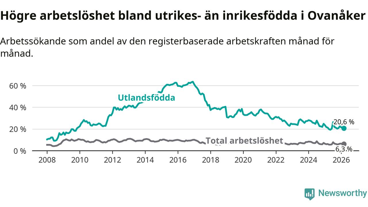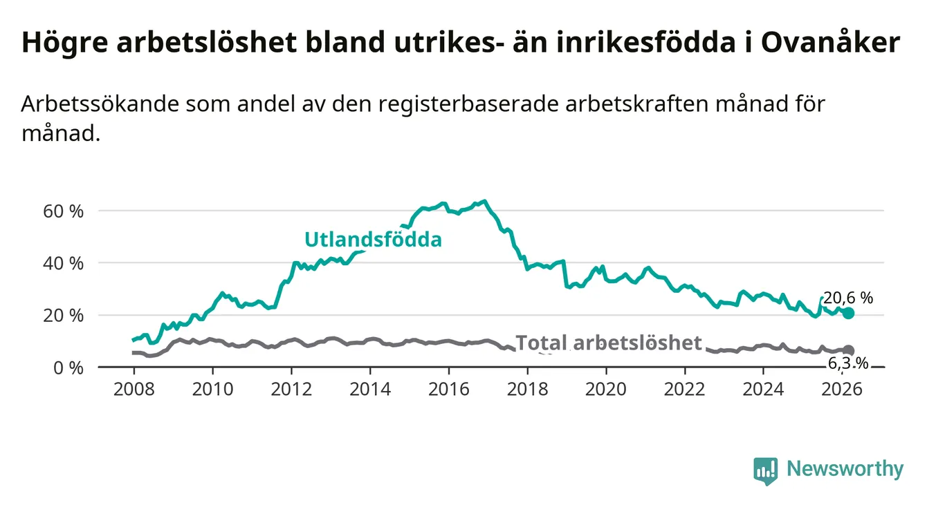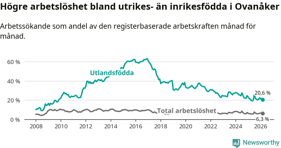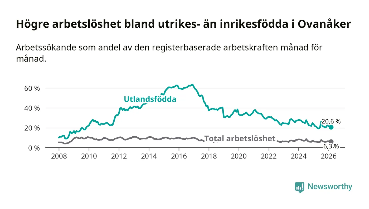 Skillnaden i arbetslöshet mellan utrikesfödda och hela befolkningen är 14,3 procentenheter i Ovanåker. Det är en mindre skillnad än för ett år sedan (−0,8 procentenheter).
