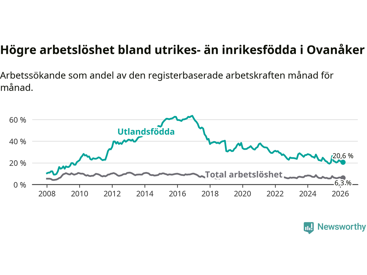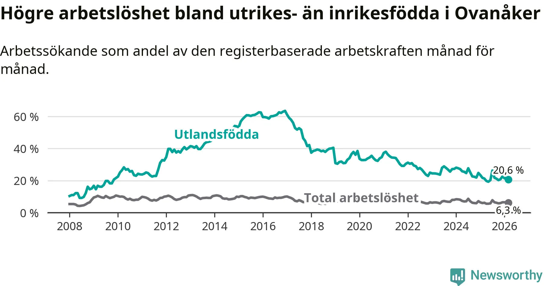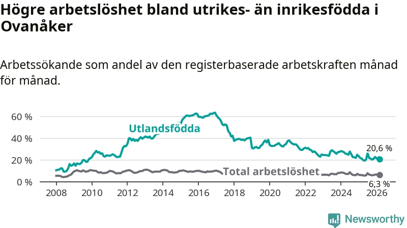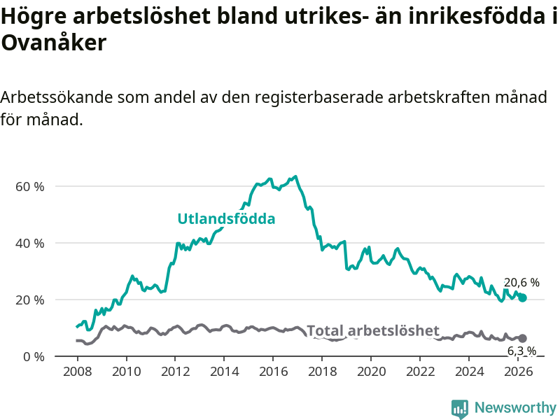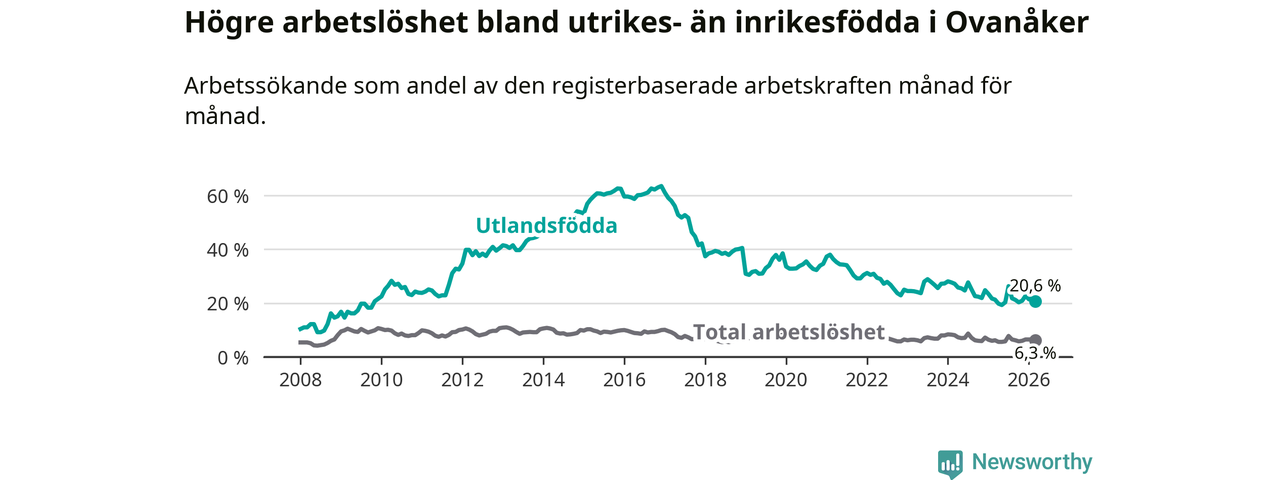 Skillnaden i arbetslöshet mellan utrikesfödda och hela befolkningen är 14,3 procentenheter i Ovanåker. Det är en mindre skillnad än för ett år sedan (−0,8 procentenheter).