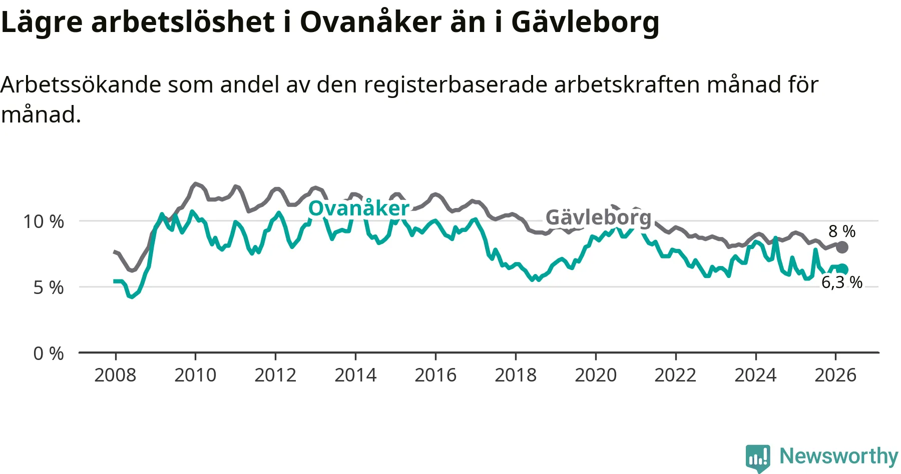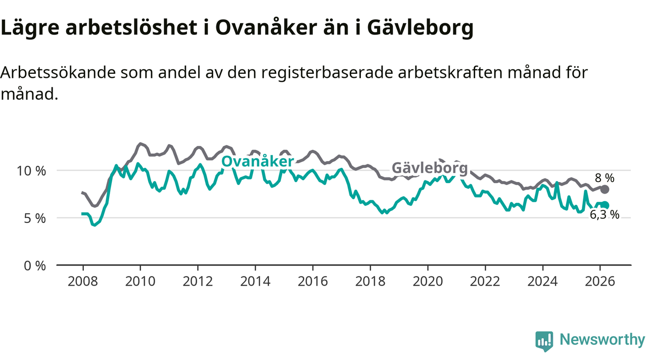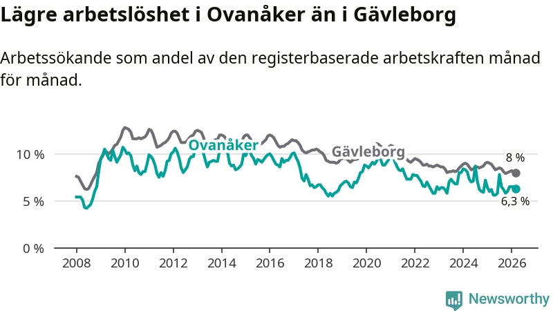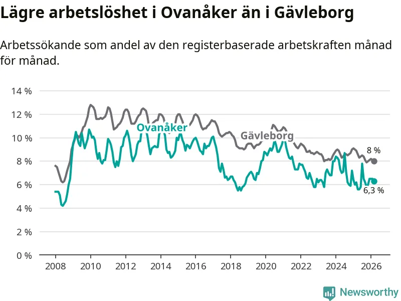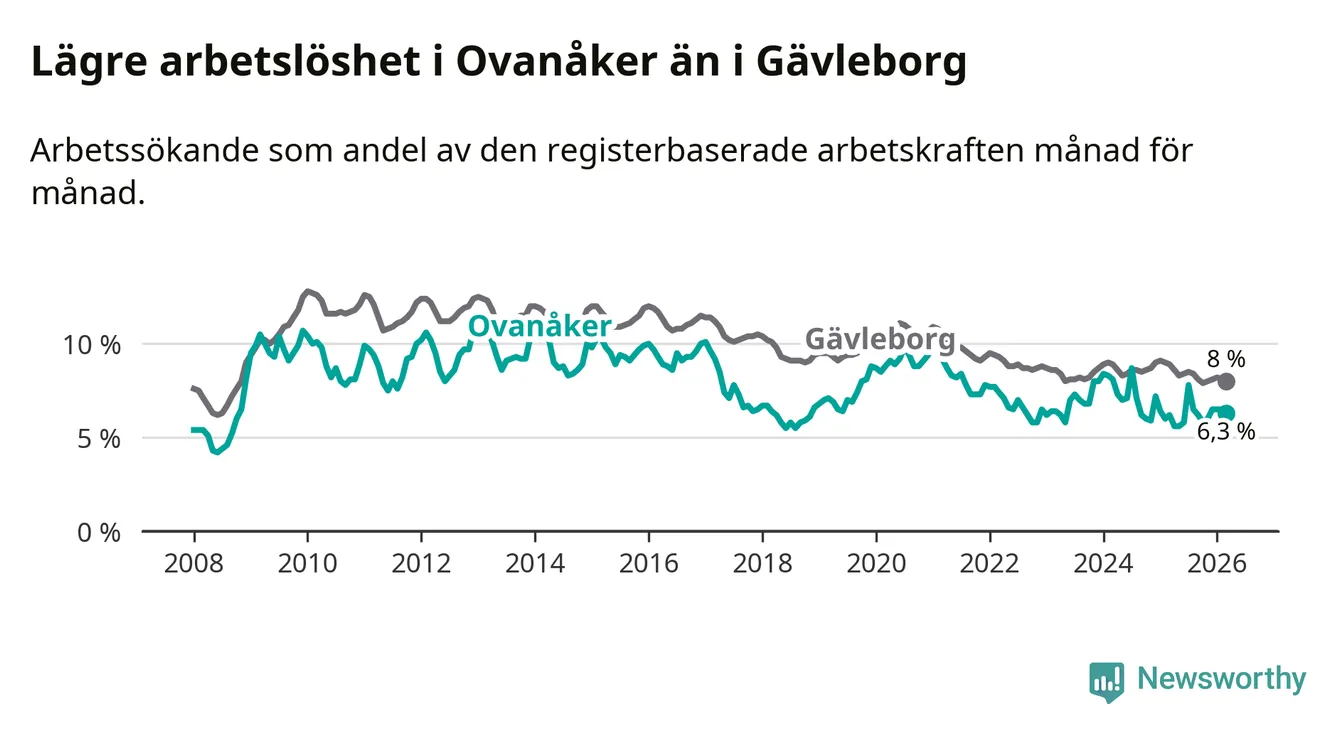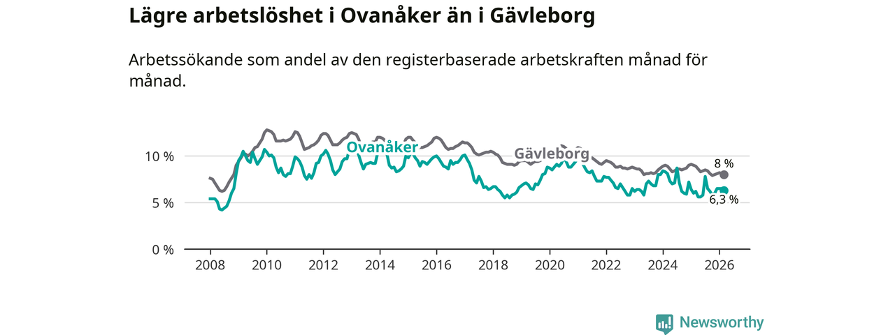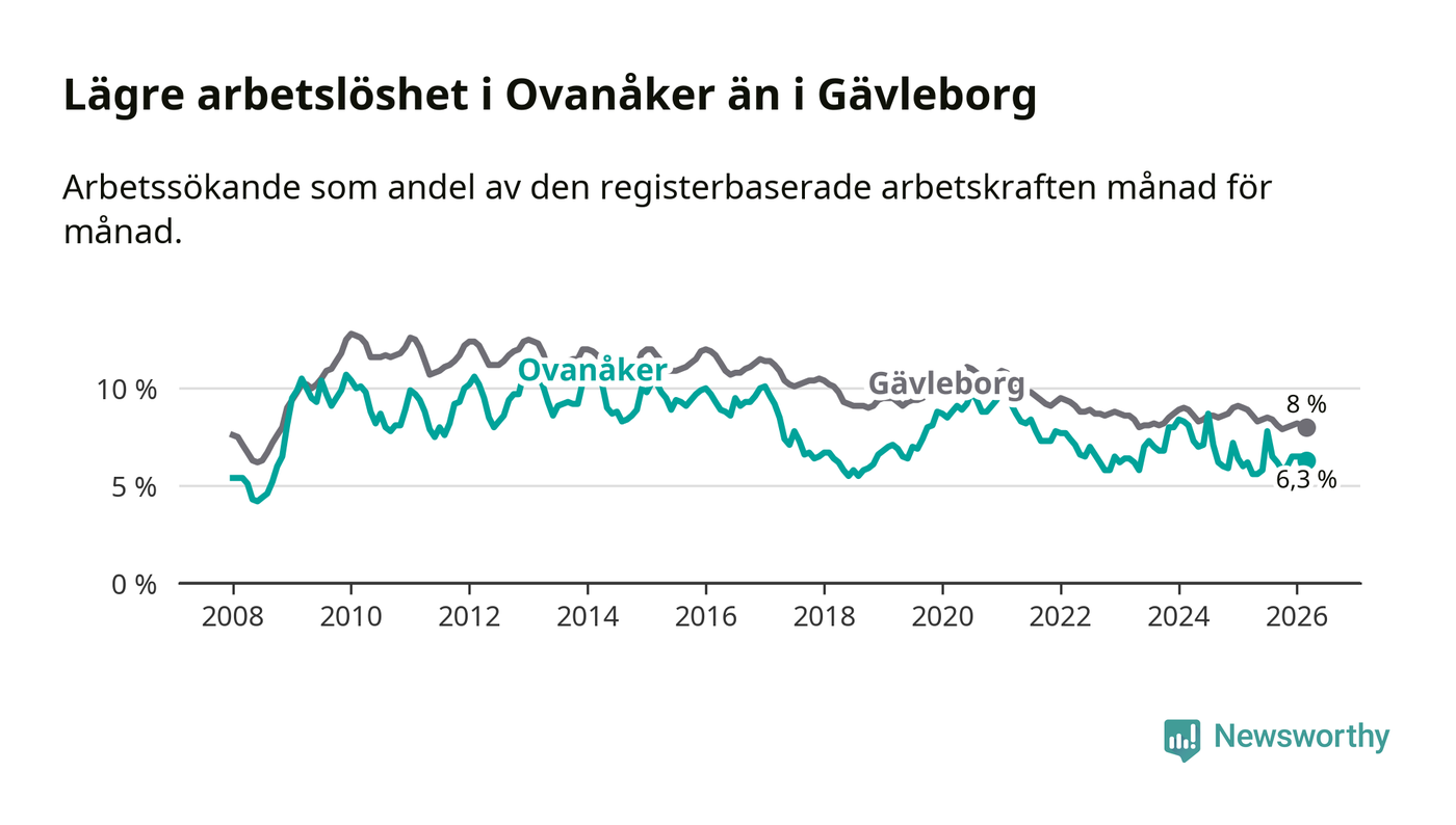 Ovanåker går därmed mot strömmen i förhållande till andra kommuner i Gävleborgs län. I de flesta andra kommuner i länet går arbetslösheten nedåt. Störst är minskningen i Bollnäs och Söderhamn, där arbetslösheten sjunker med 1,5 procentenheter. I tabellen längre ner ser du utvecklingen i samtliga kommuner i länet.