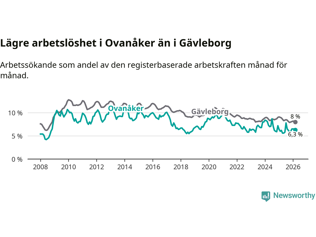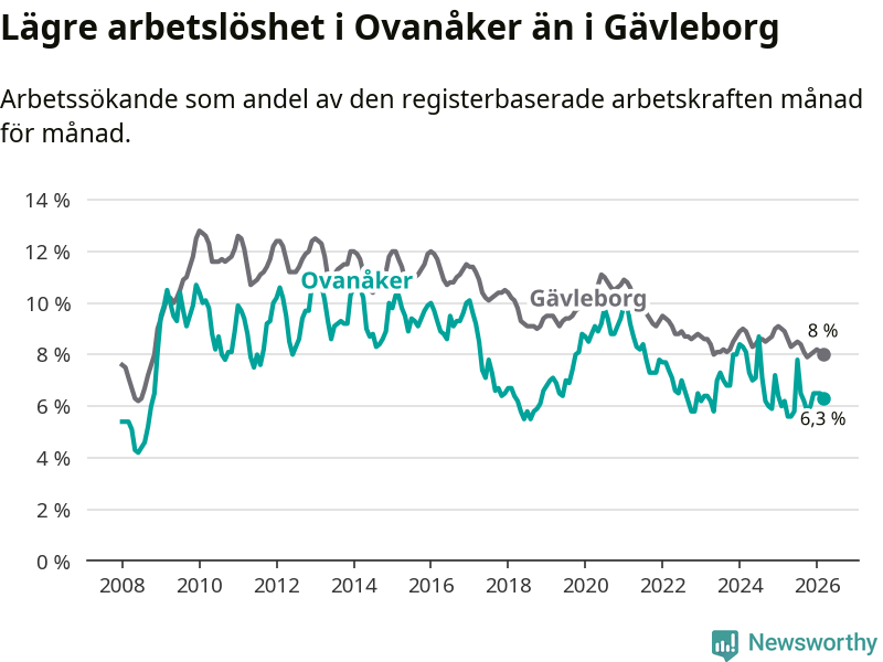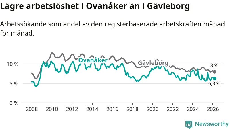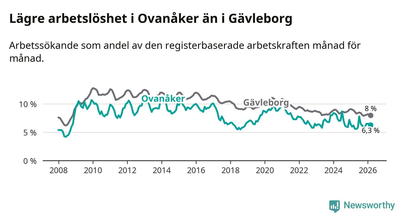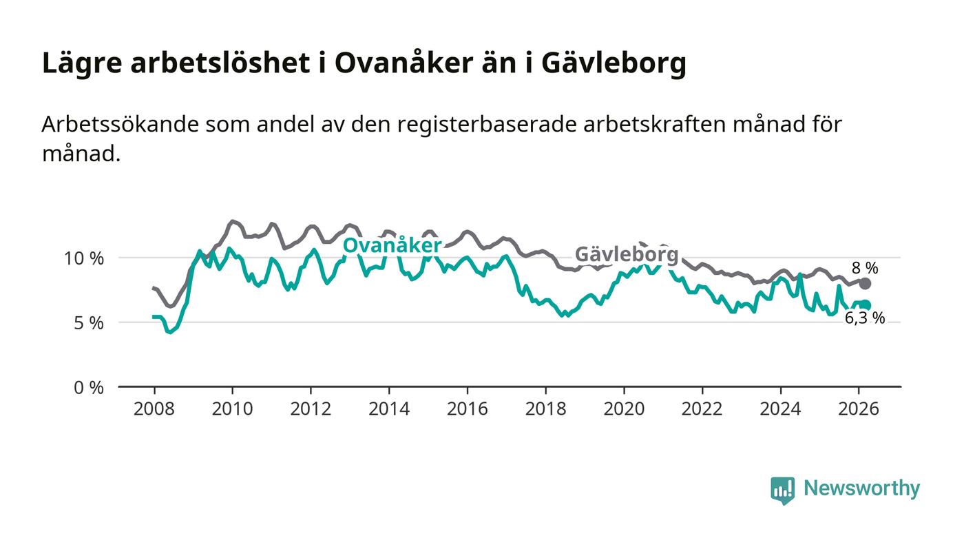 Även om arbetslösheten i Ovanåker alltså ökar, så ligger den fortfarande under snittet i hela Gävleborgs län (6,3 procent i kommunen, jämfört med 8,0 procent i hela länet). Hudiksvall har den lägsta arbetslösheten i länet (5,8 procent), medan Söderhamn har den högsta (9,0 procent). För att Ovanåker skulle komma ner i samma arbetslöshetsnivå som Hudiksvall skulle 25 personer behöva sysselsättas.