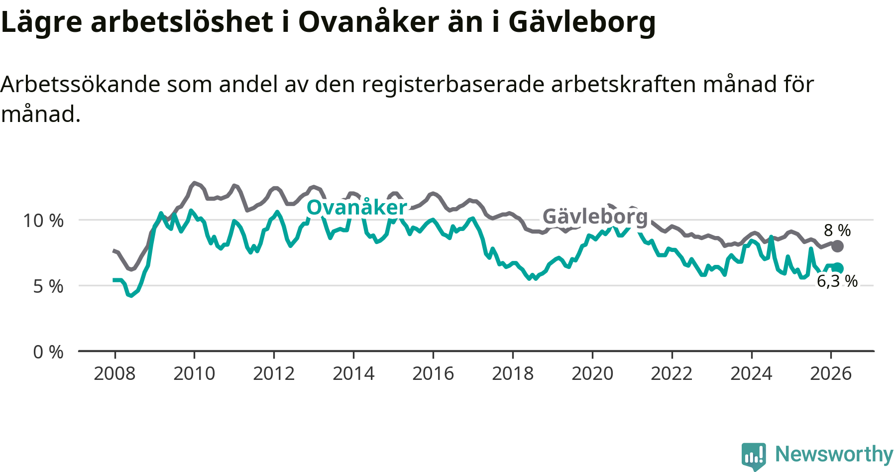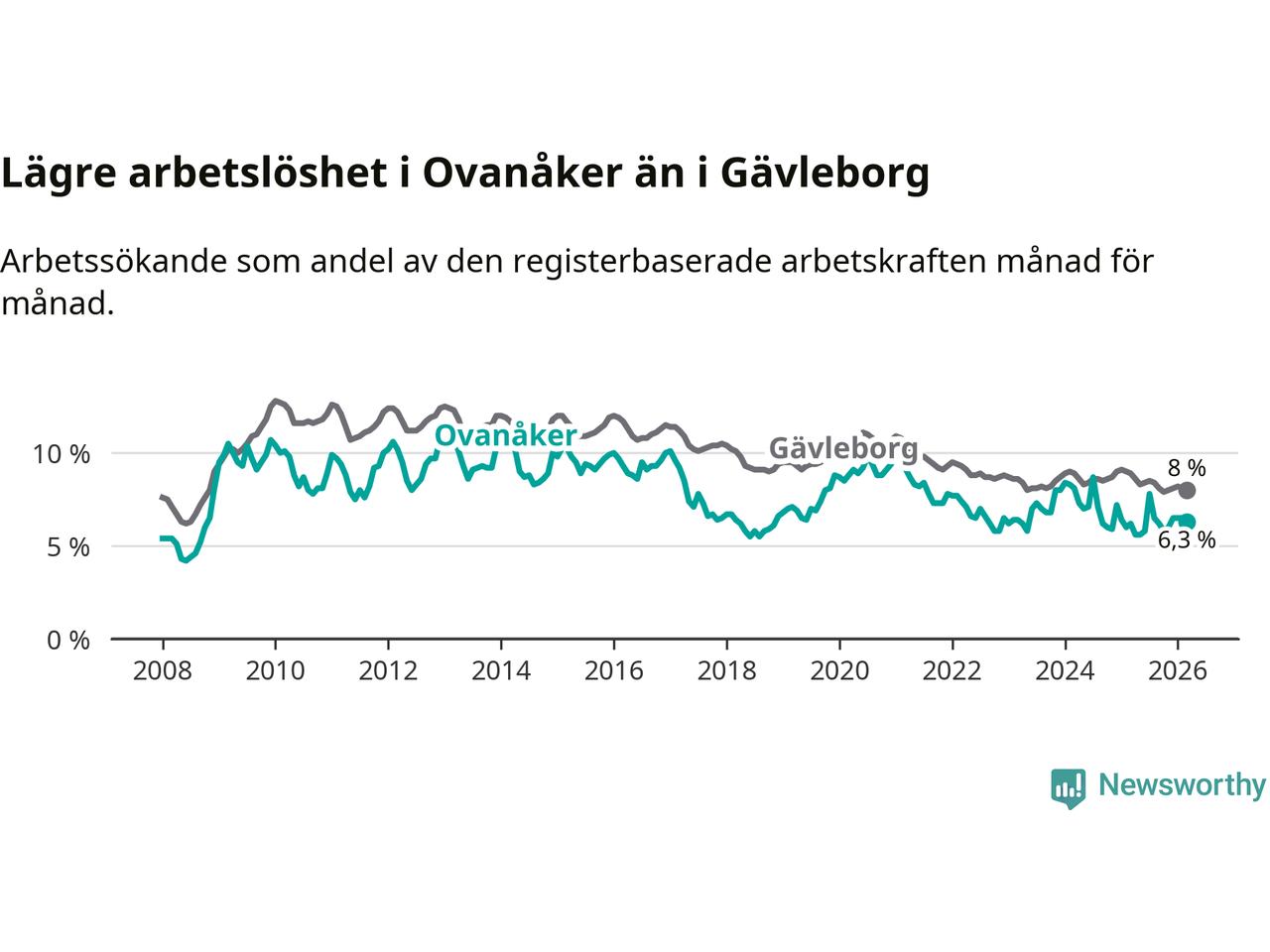 Graf: Arbetslöshet i Ovanåkers kommun och Gävleborgs län