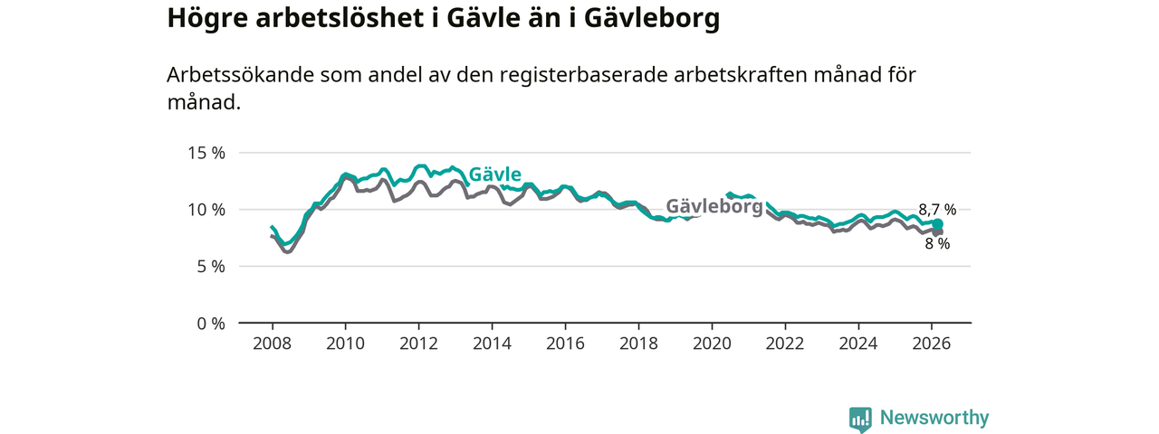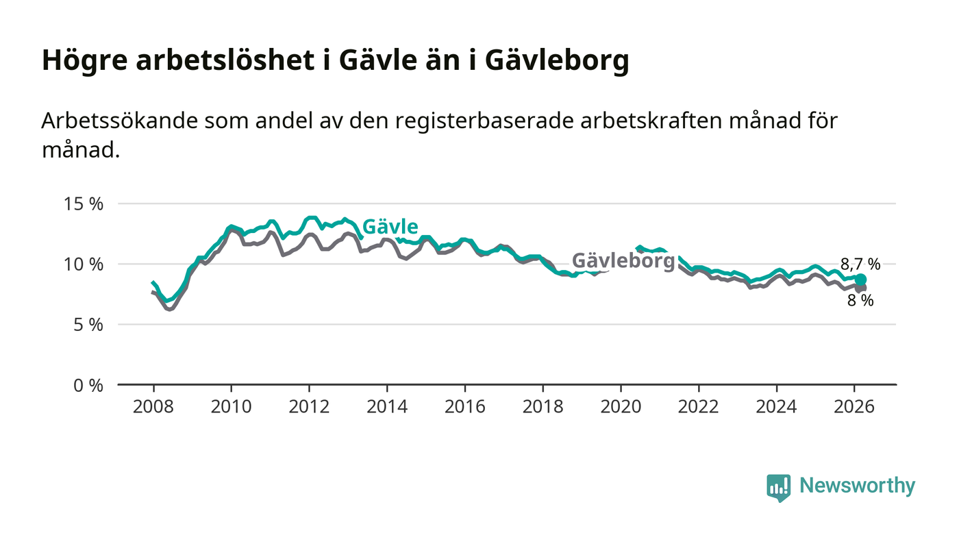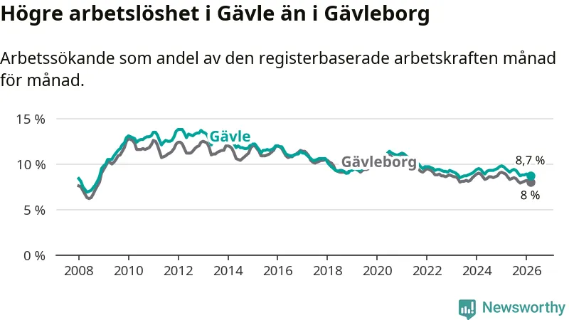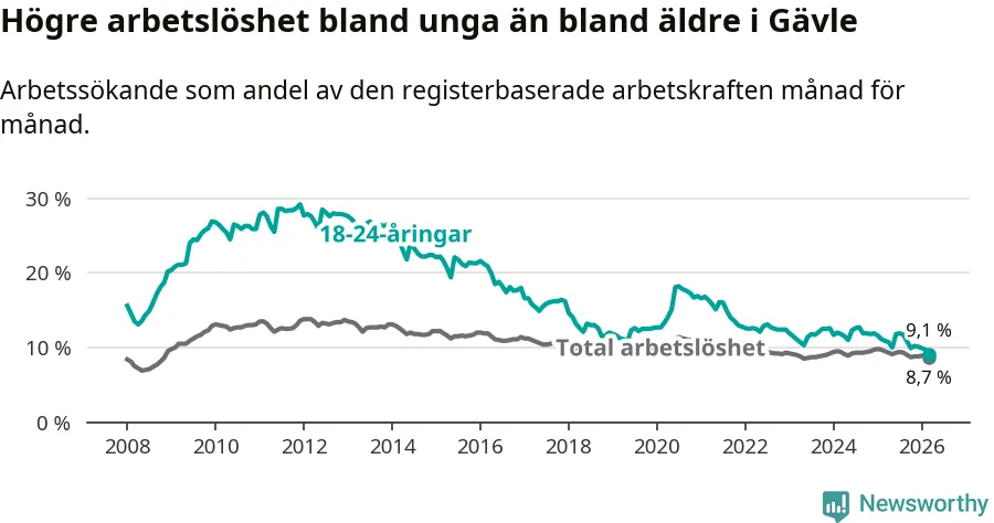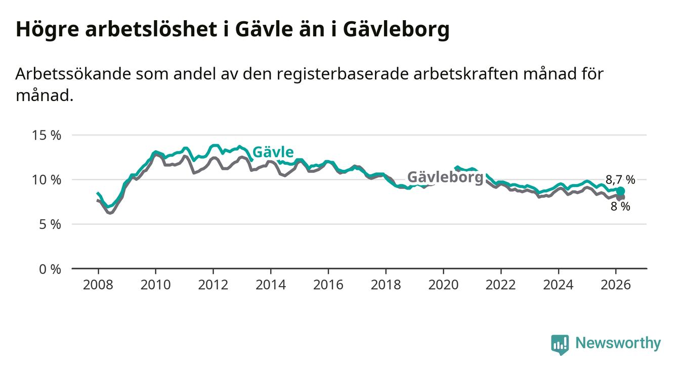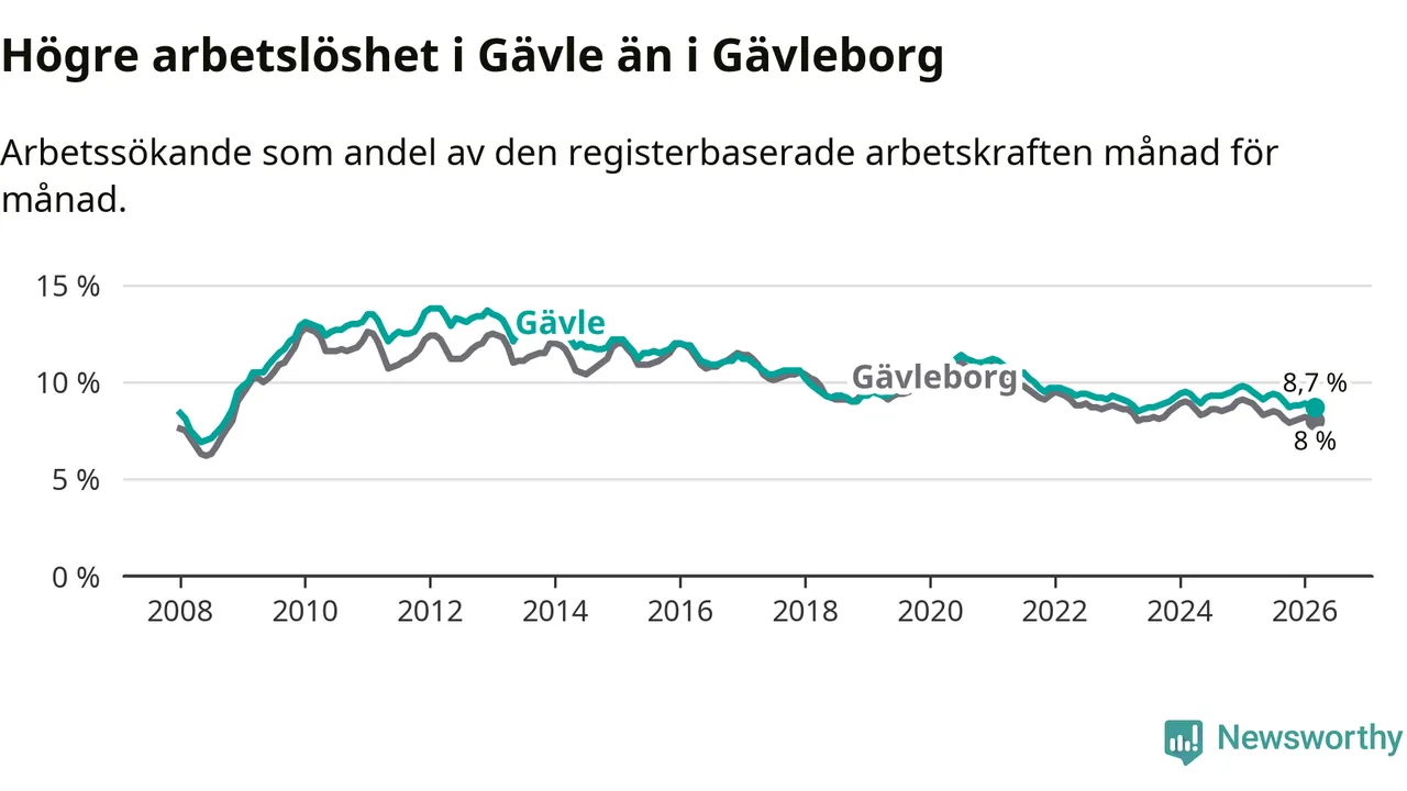 Under mars månad rapporterade Gävle kommun en total arbetslöshet på 8,7 procent. Det är en minskning jämfört med samma tidpunkt i fjol (−0,8 procentenheter). Även i Gävleborgs län sjunker arbetslösheten .