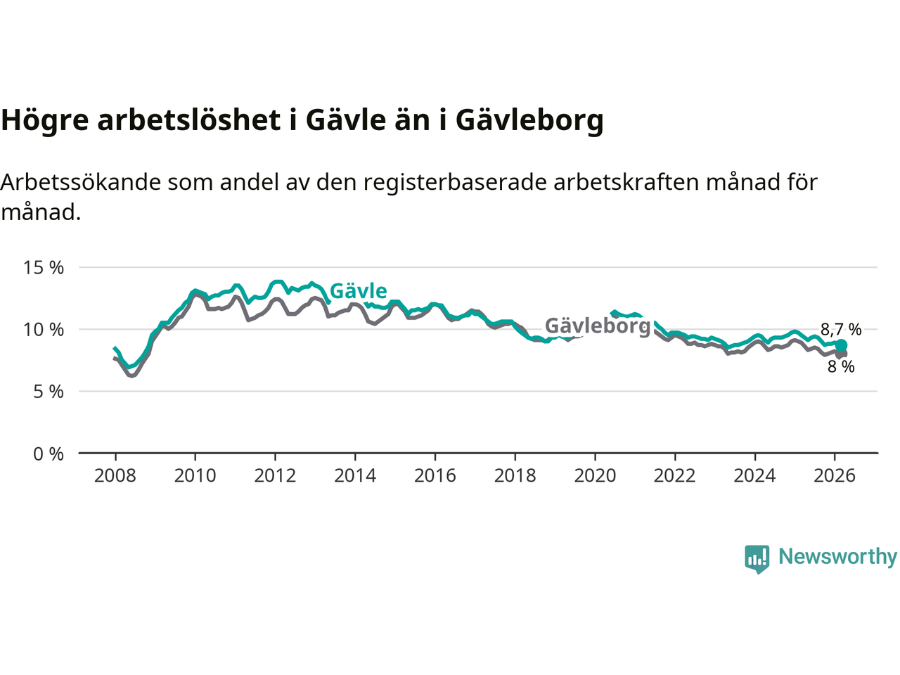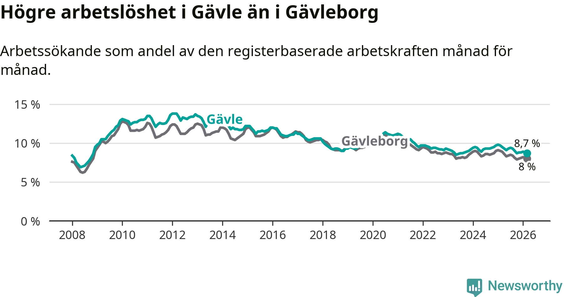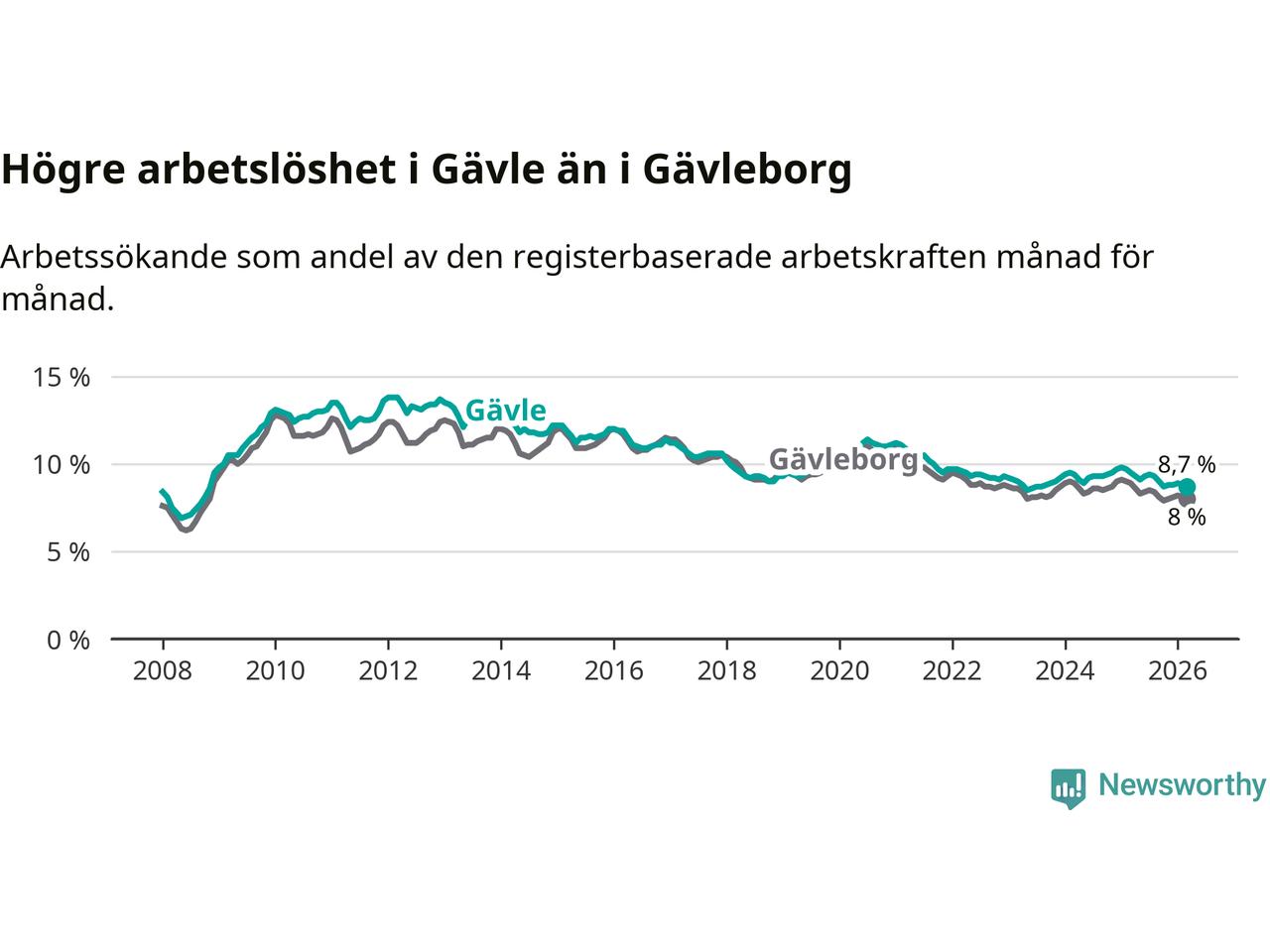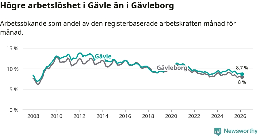 Under mars månad rapporterade Gävle kommun en total arbetslöshet på 8,7 procent. Det är en minskning jämfört med samma tidpunkt i fjol (−0,8 procentenheter). Även i Gävleborgs län sjunker arbetslösheten .