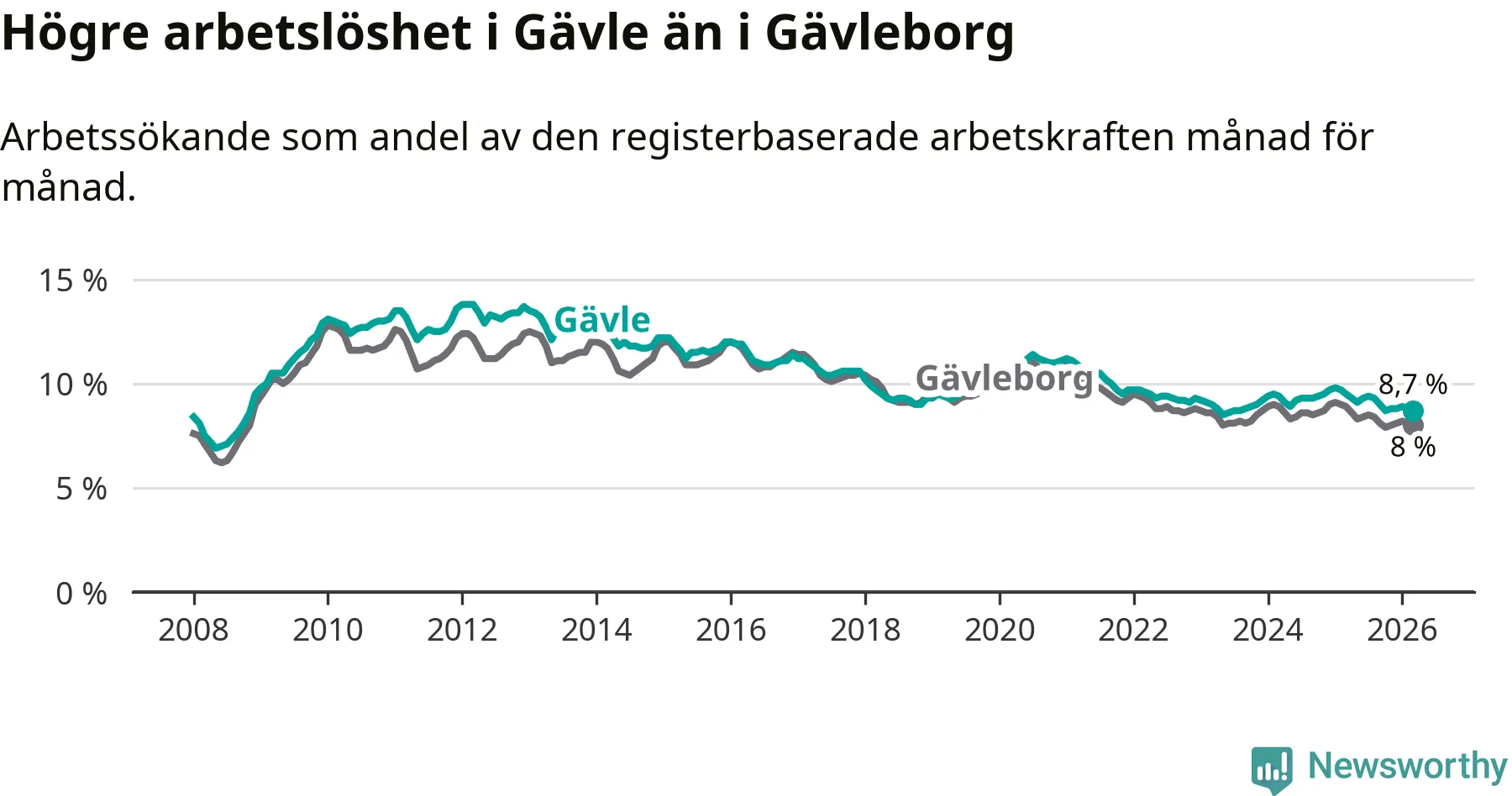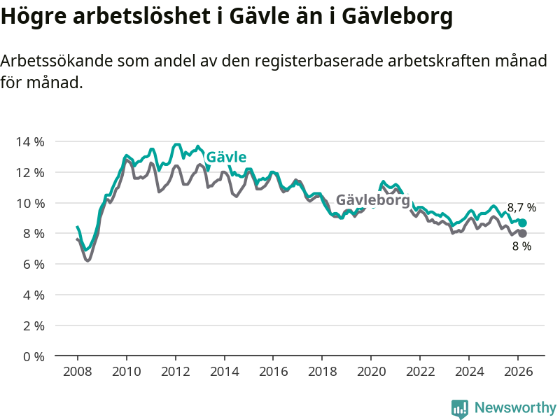 Även om arbetslösheten i Gävle alltså minskar, så ligger den fortfarande över snittet i hela Gävleborgs län (8,7 procent i kommunen, jämfört med 8,0 procent i hela länet). Hudiksvall har den lägsta arbetslösheten i länet (5,8 procent), medan Söderhamn har den högsta (9,0 procent). För att Gävle skulle komma ner i samma arbetslöshetsnivå som Hudiksvall skulle 1 545 personer behöva sysselsättas.