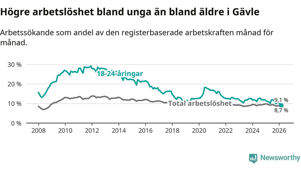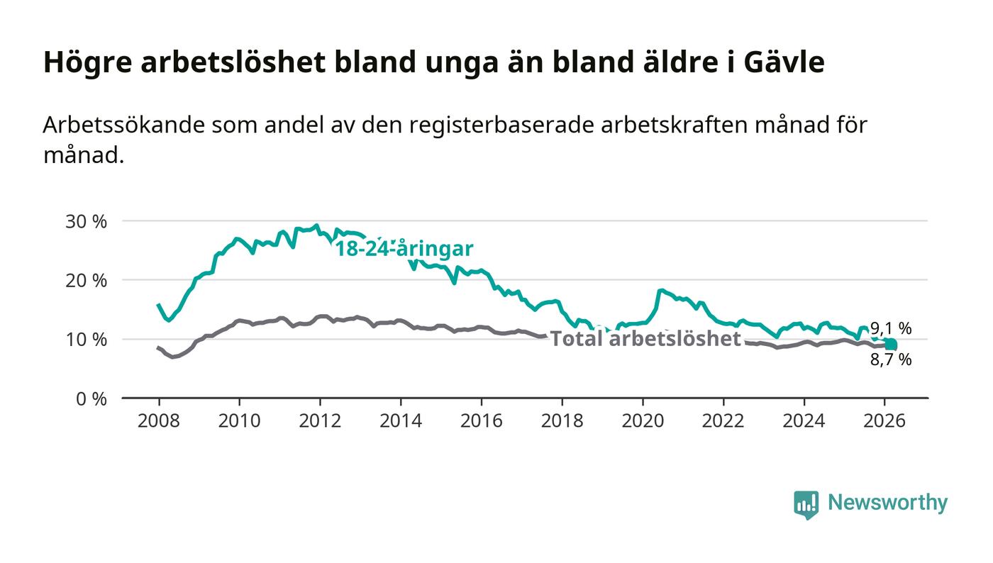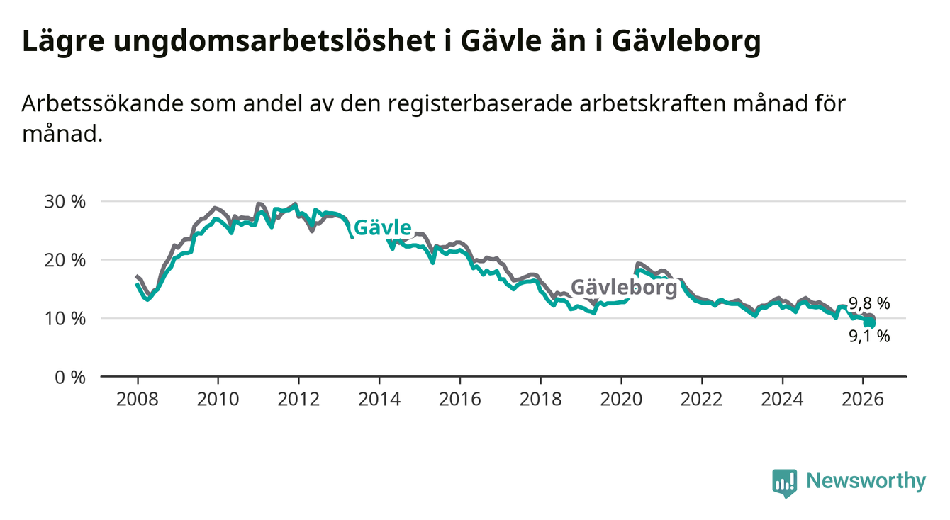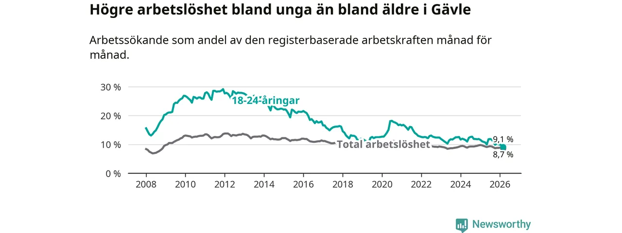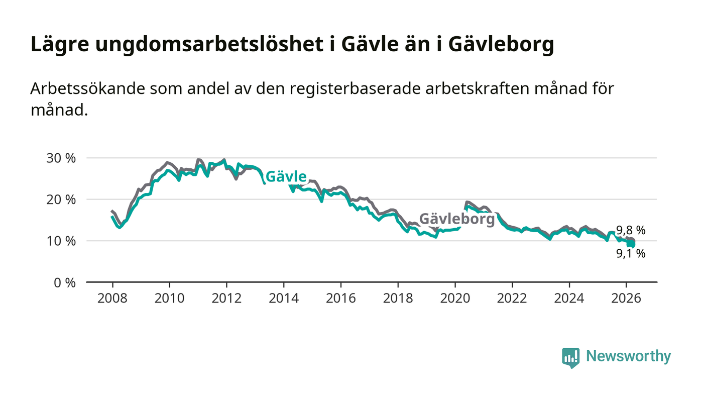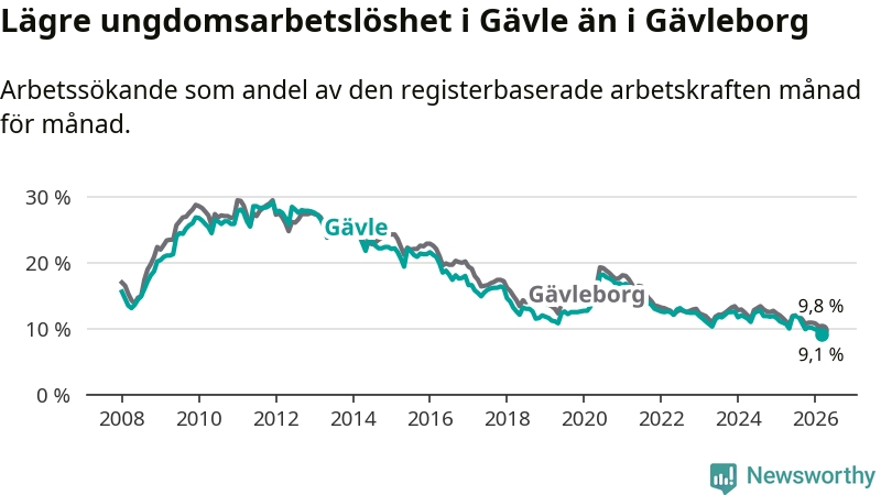 Medan Gävle har högre total arbetslöshet än Gävleborg, ligger ungdomsarbetslösheten 0,7 procentenheter lägre i Gävle.