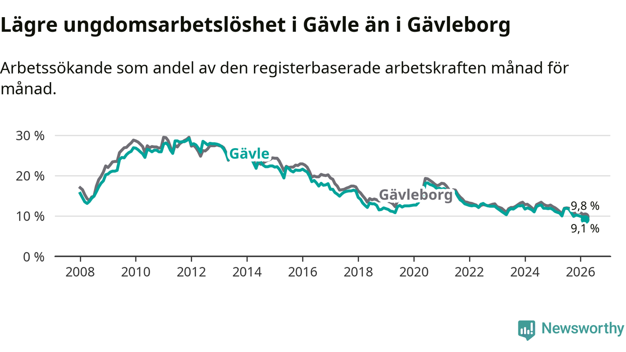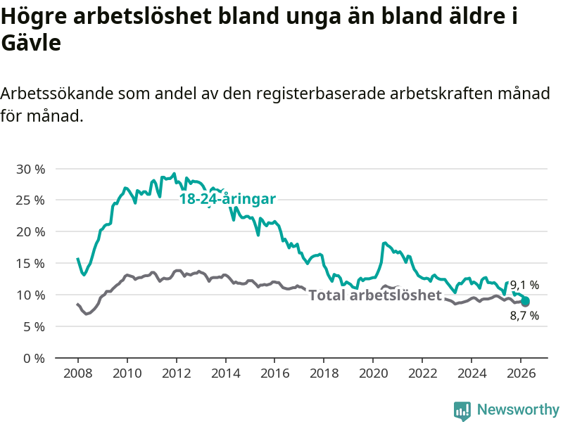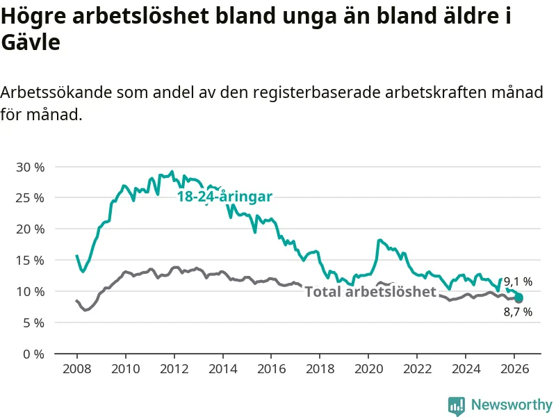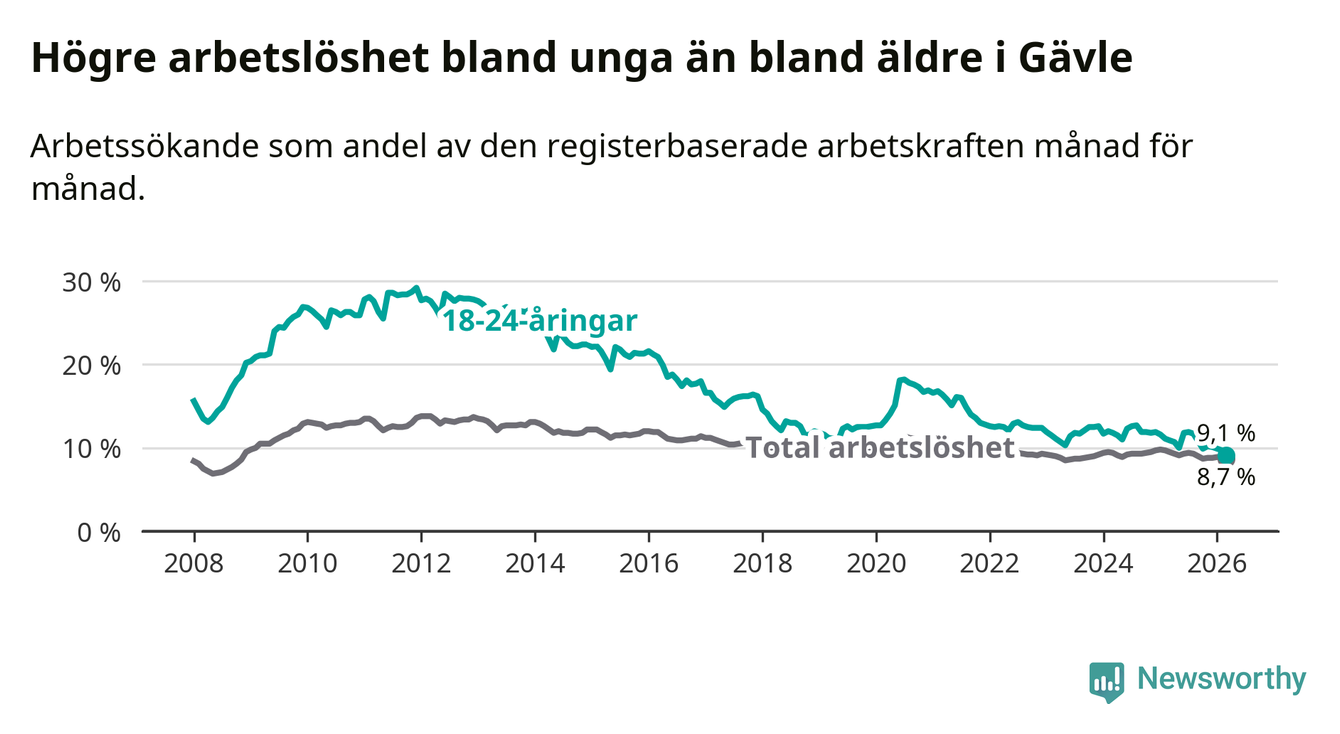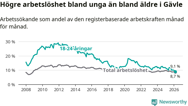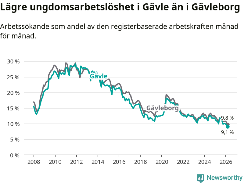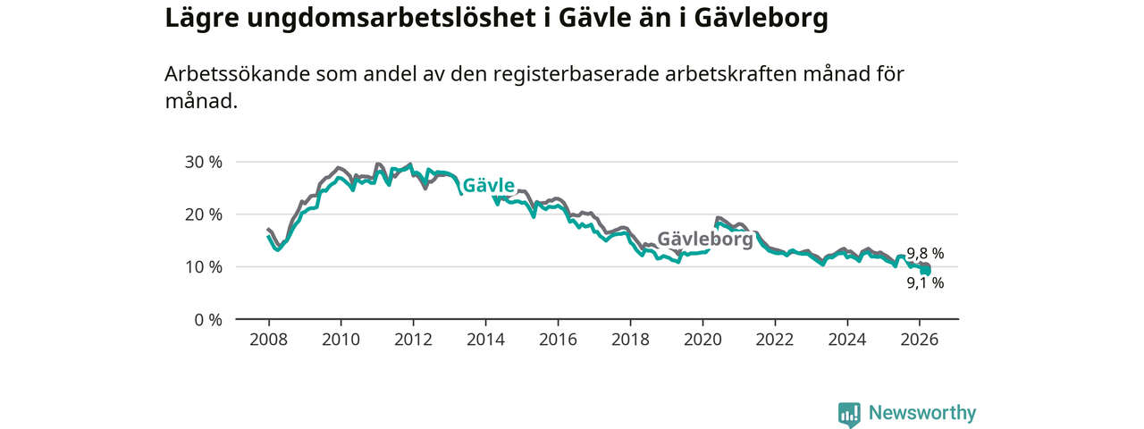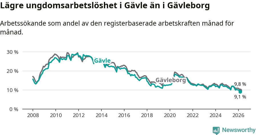 Medan Gävle har högre total arbetslöshet än Gävleborg, ligger ungdomsarbetslösheten 0,7 procentenheter lägre i Gävle.
