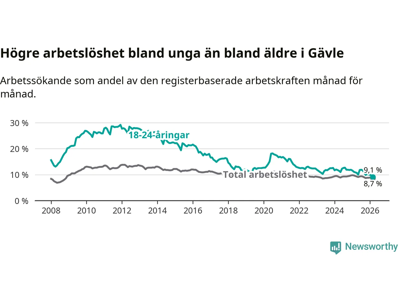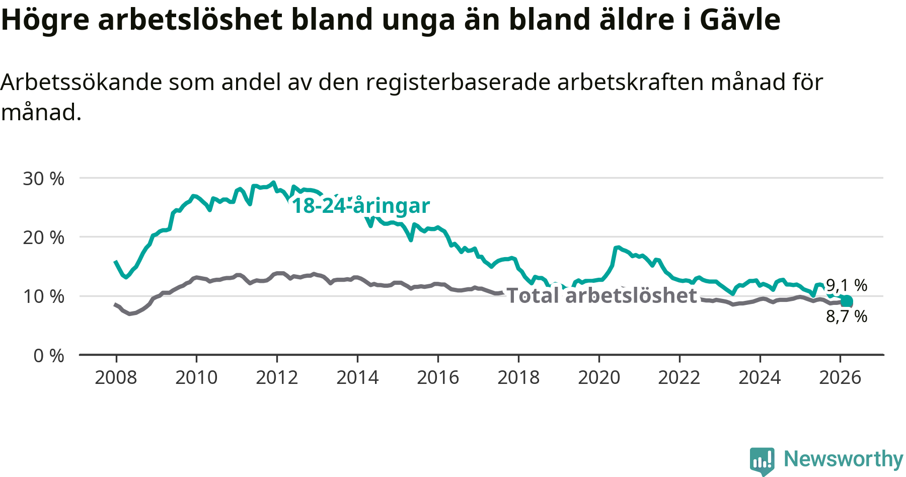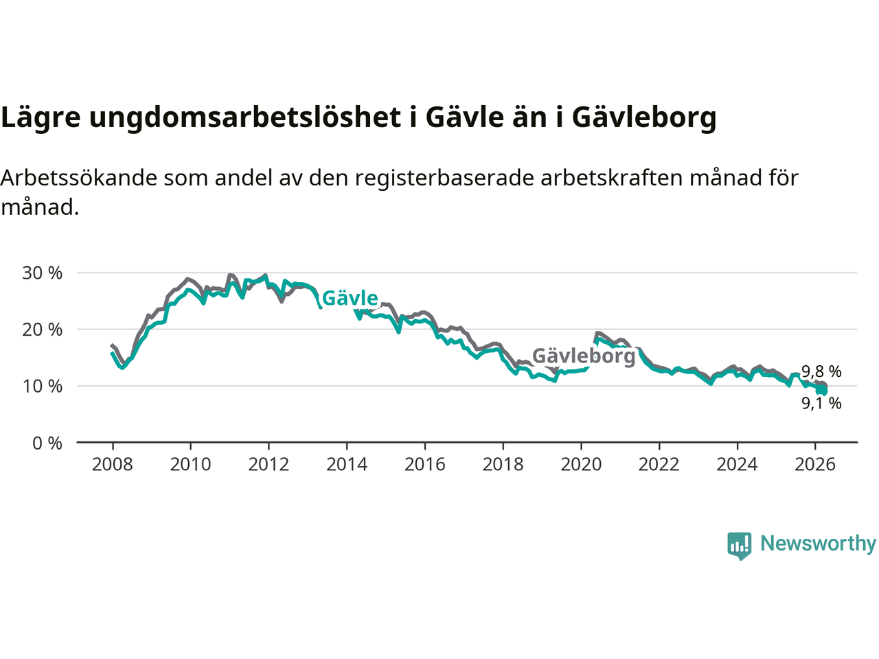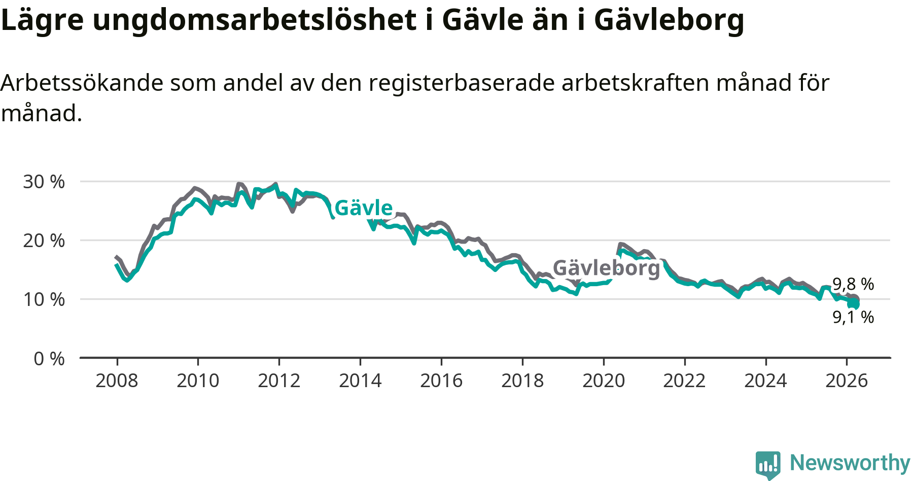 Medan Gävle har högre total arbetslöshet än Gävleborg, ligger ungdomsarbetslösheten 0,7 procentenheter lägre i Gävle.