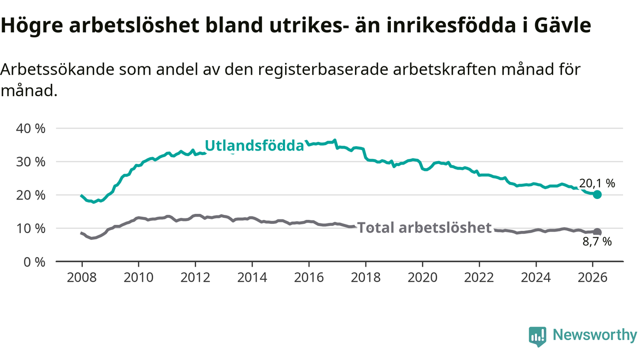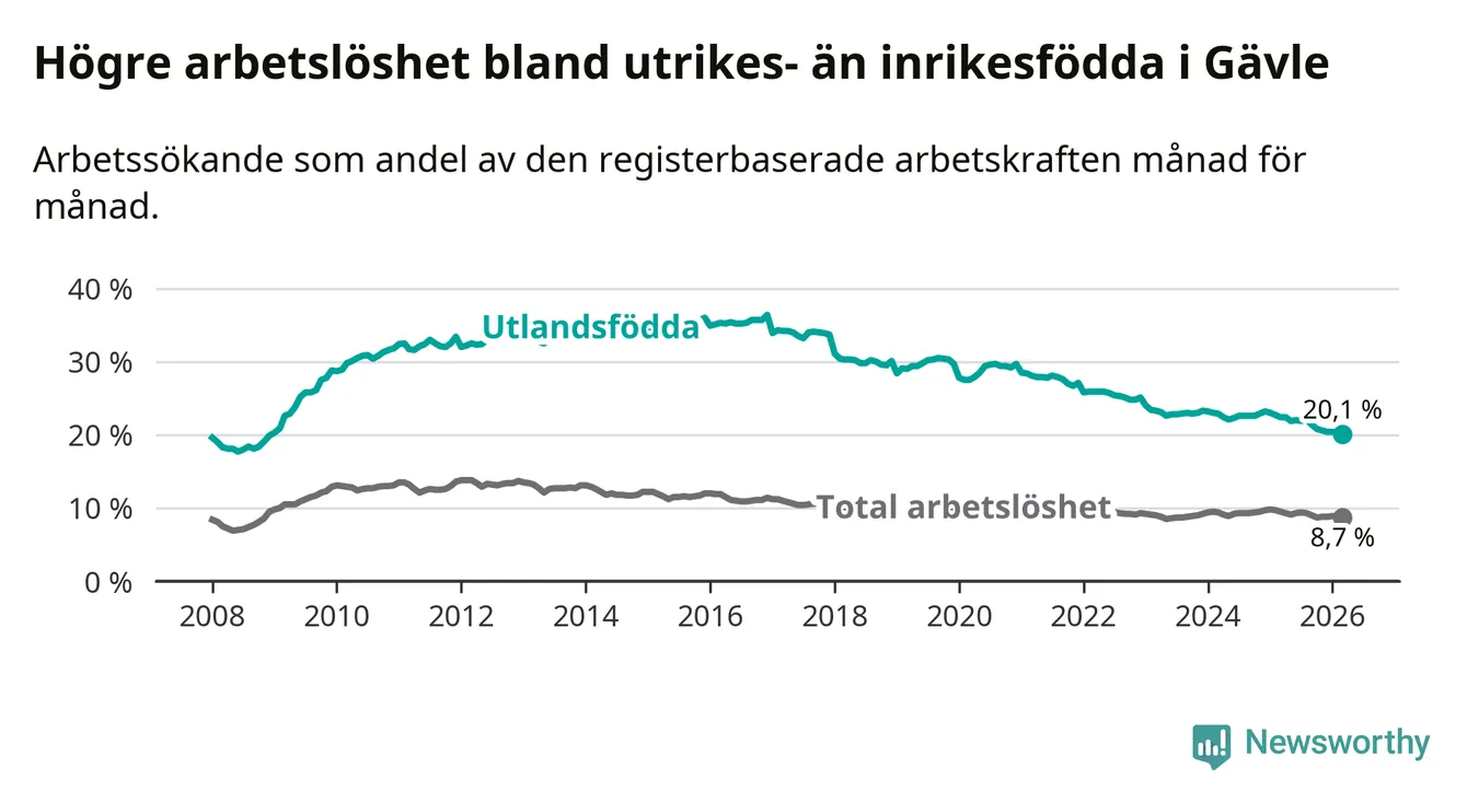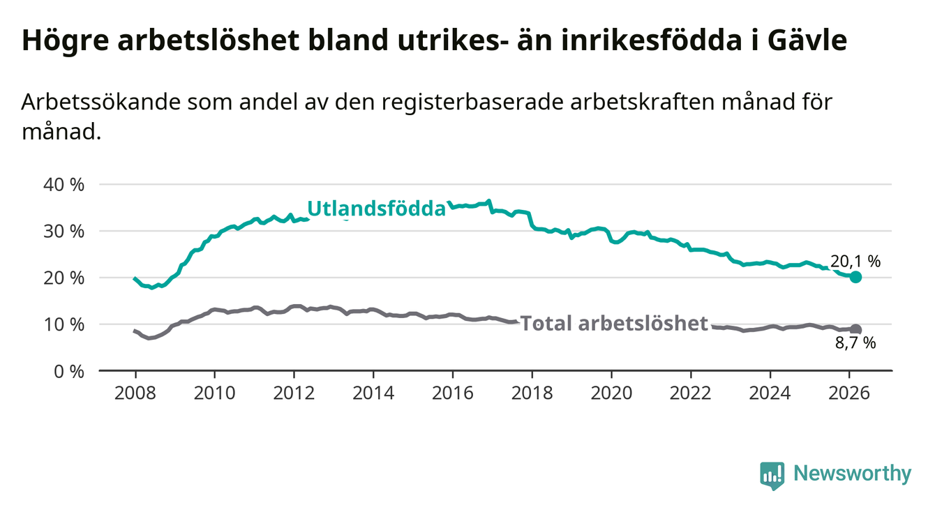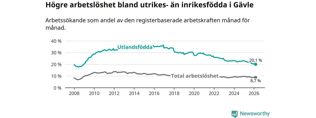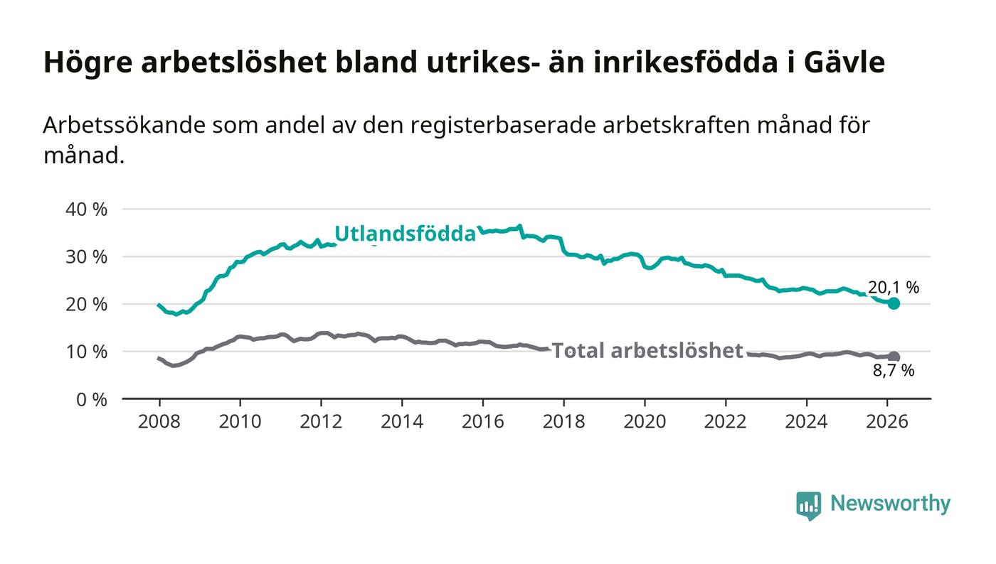 Arbetslösheten bland utlandsfödda var 20,1 procent i Gävle under mars månad, motsvarande 2 265 av 11 269 personer. Det är 2,3 procentenheter färre än vid samma tidpunkt i fjol (−175 om man räknar personer). Därmed är de utlandsföddas arbetslöshet lägre än vid samma tidpunkt i fjol för elfte månaden i följd. Sedan april 2025 har arbetslösheten bland utlandsfödda minskat från 22,4 till 20,1 procent. Den nuvarande arbetslöshetsnivån är den lägsta sedan december 2008.