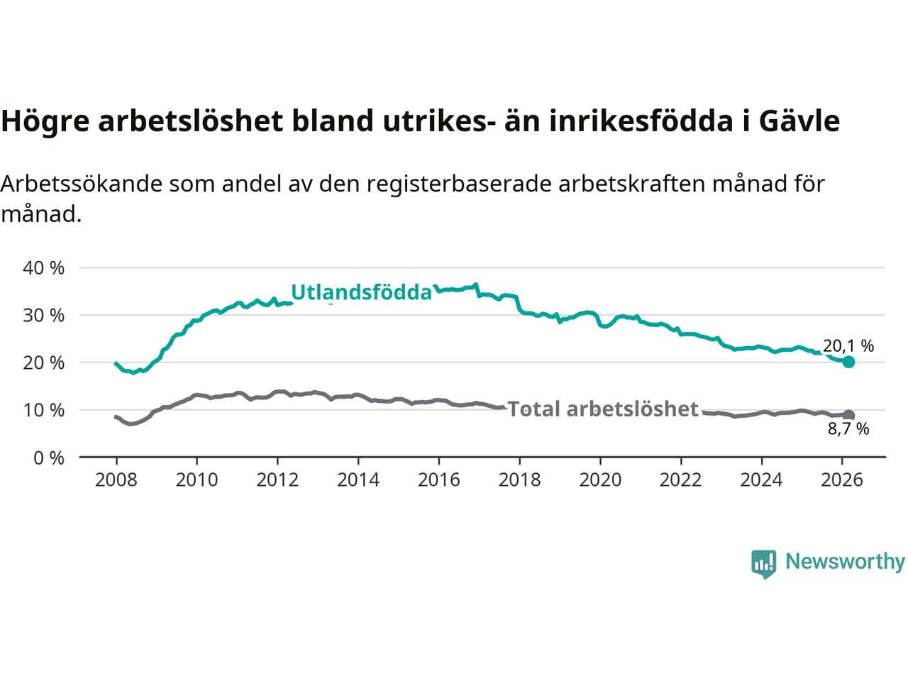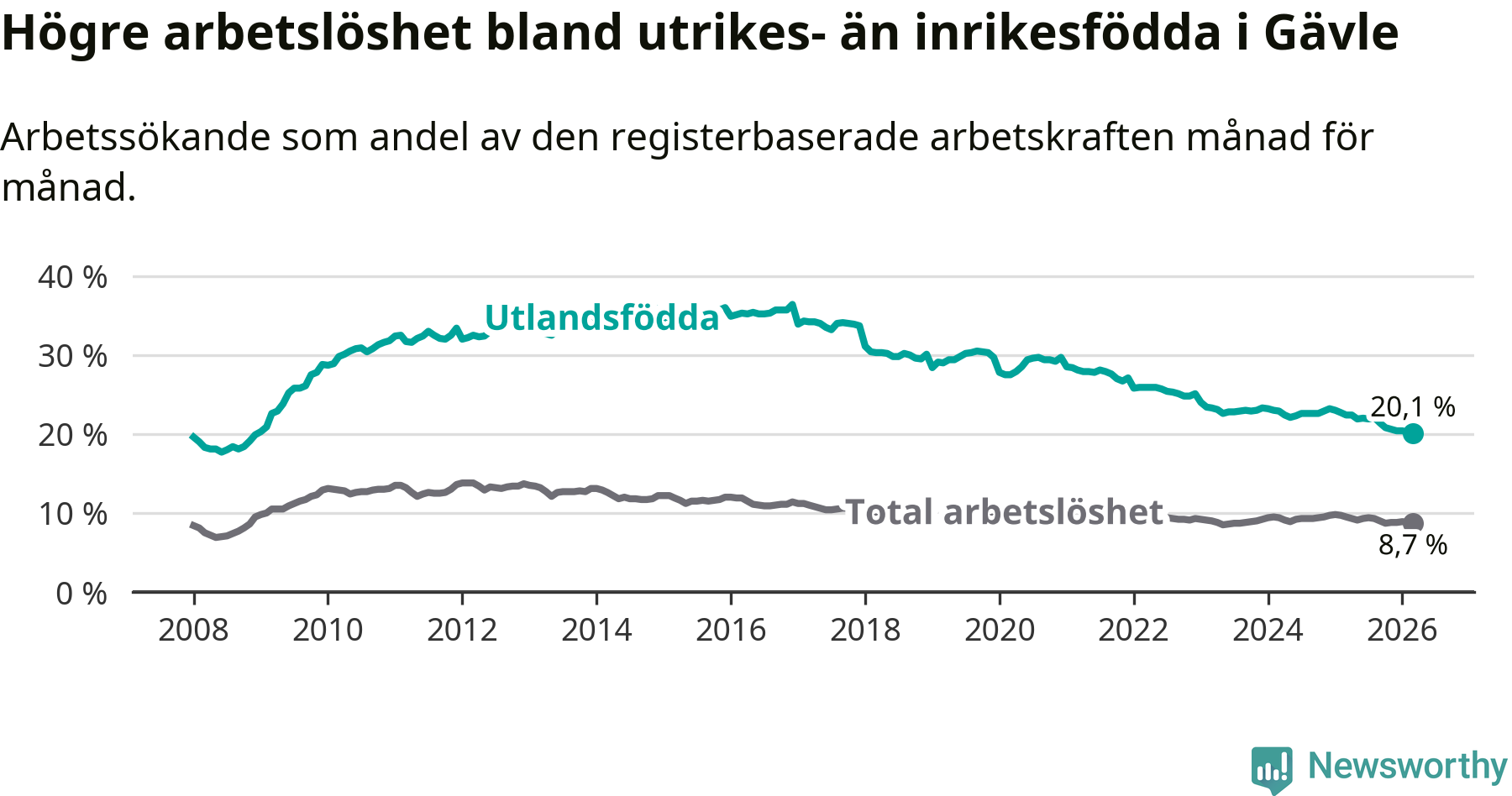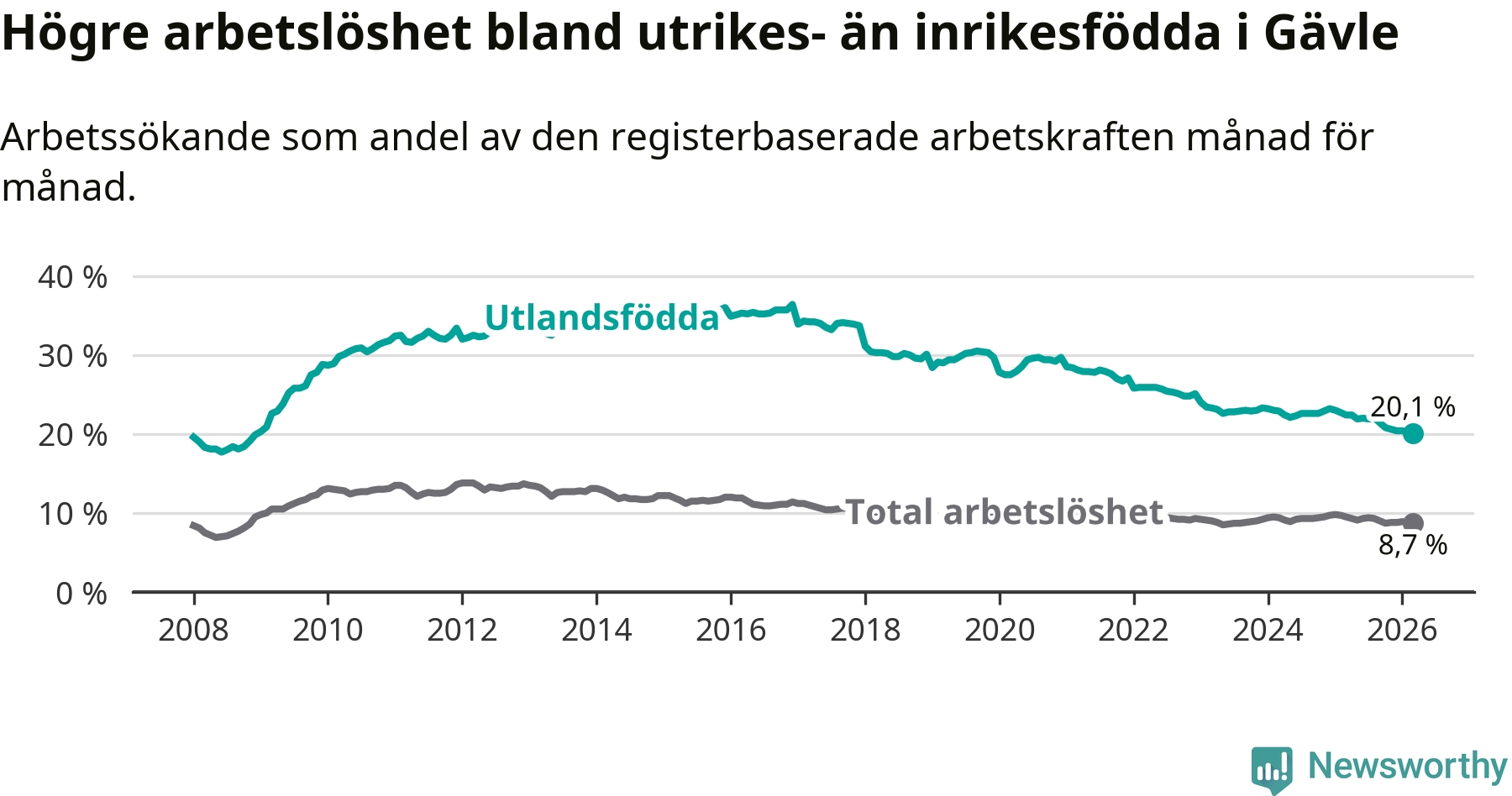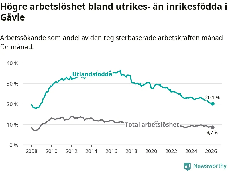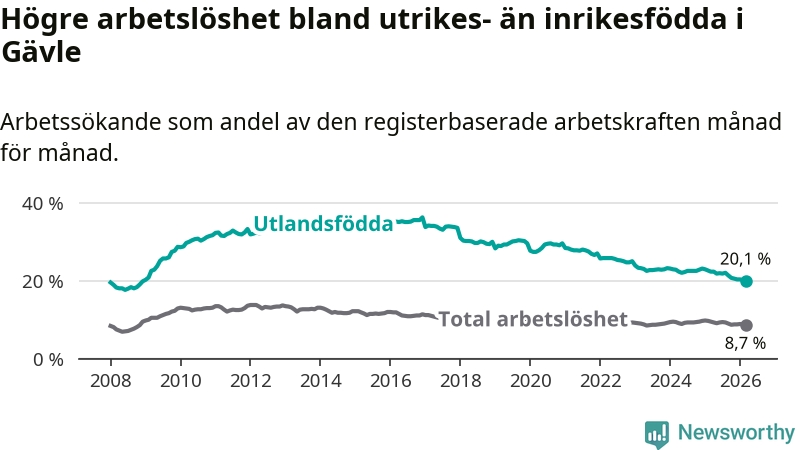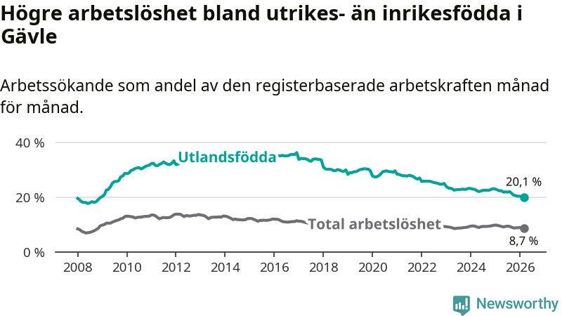 Arbetslösheten bland utlandsfödda var 20,1 procent i Gävle under mars månad, motsvarande 2 265 av 11 269 personer. Det är 2,3 procentenheter färre än vid samma tidpunkt i fjol (−175 om man räknar personer). Därmed är de utlandsföddas arbetslöshet lägre än vid samma tidpunkt i fjol för elfte månaden i följd. Sedan april 2025 har arbetslösheten bland utlandsfödda minskat från 22,4 till 20,1 procent. Den nuvarande arbetslöshetsnivån är den lägsta sedan december 2008.
