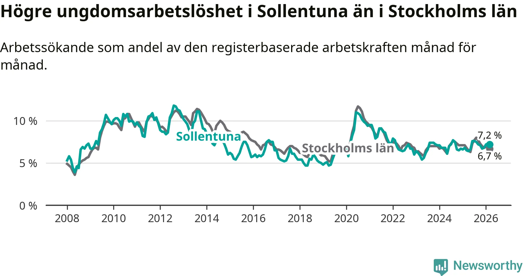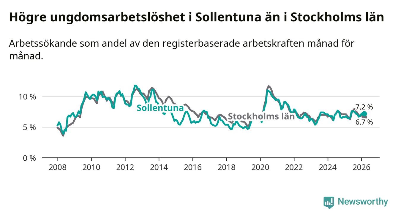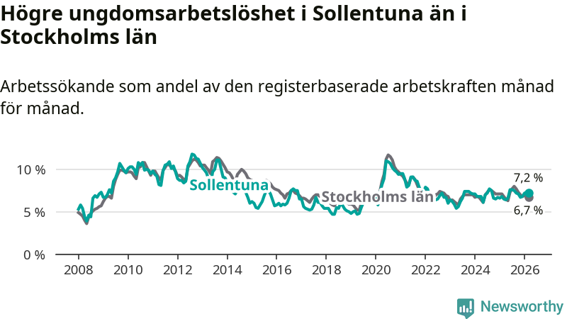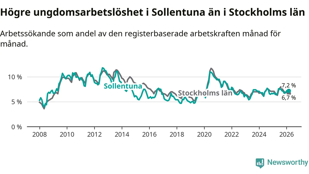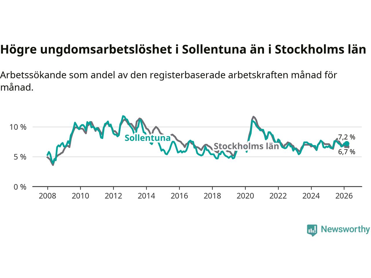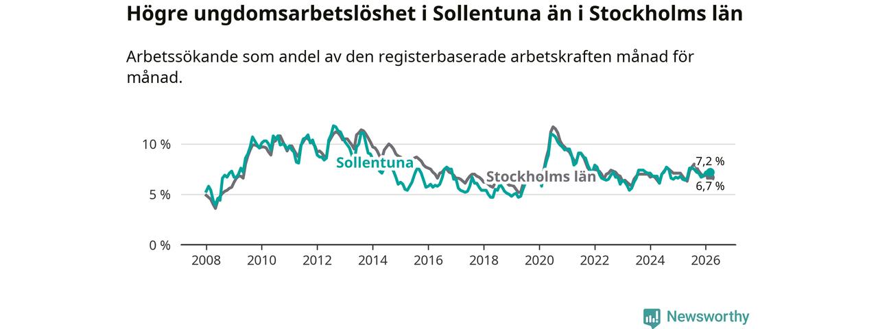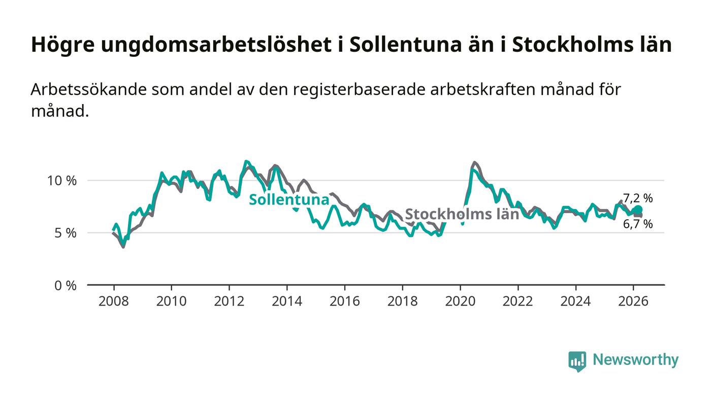 Medan Sollentuna har ungefär samma total arbetslöshet som Stockholms län, ligger ungdomsarbetslösheten 0,5 procentenheter högre i Sollentuna.