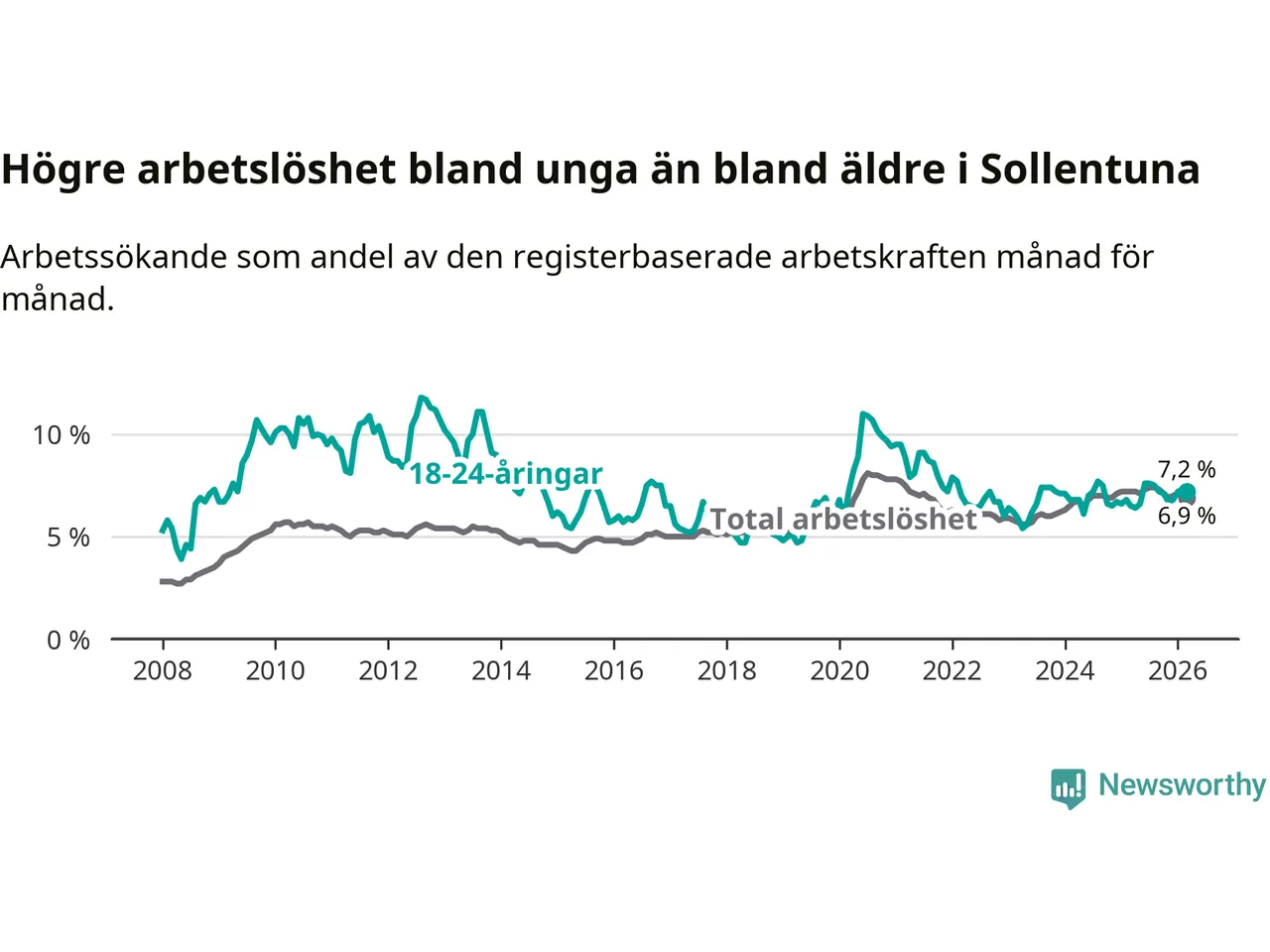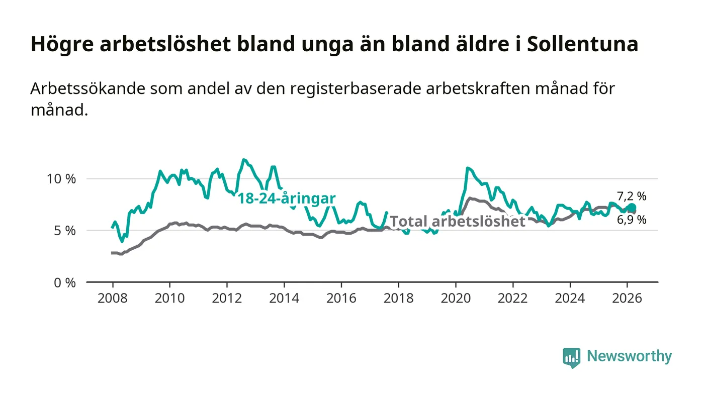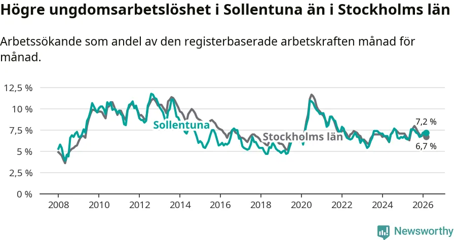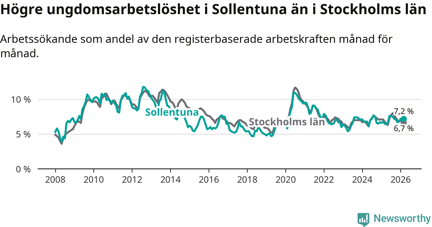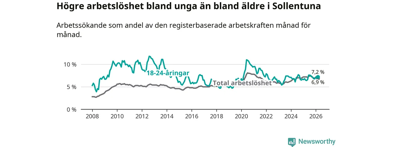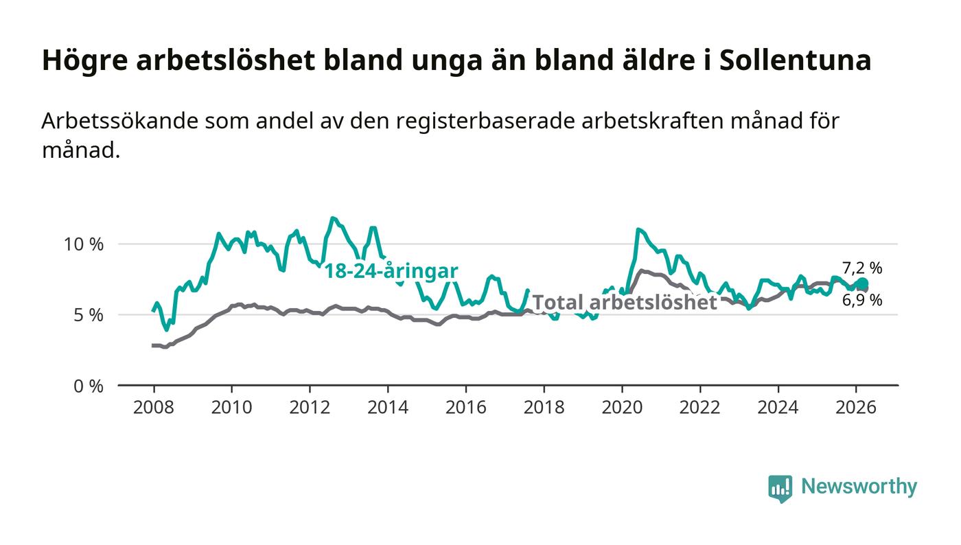Medan Sollentuna har ungefär samma total arbetslöshet som Stockholms län, ligger ungdomsarbetslösheten 0,5 procentenheter högre i Sollentuna.
