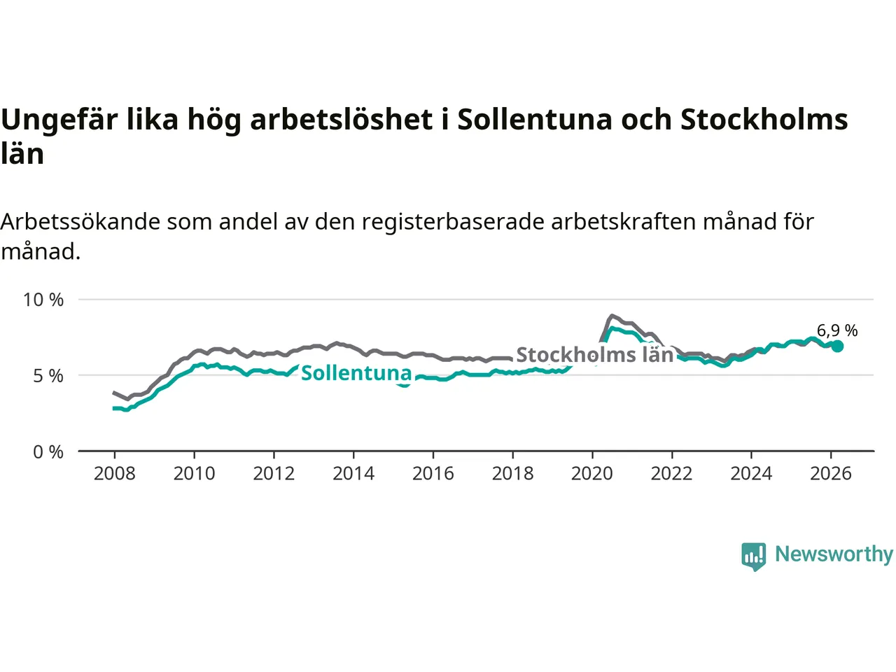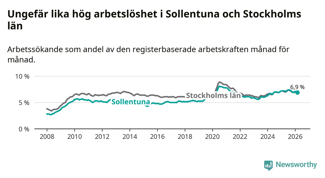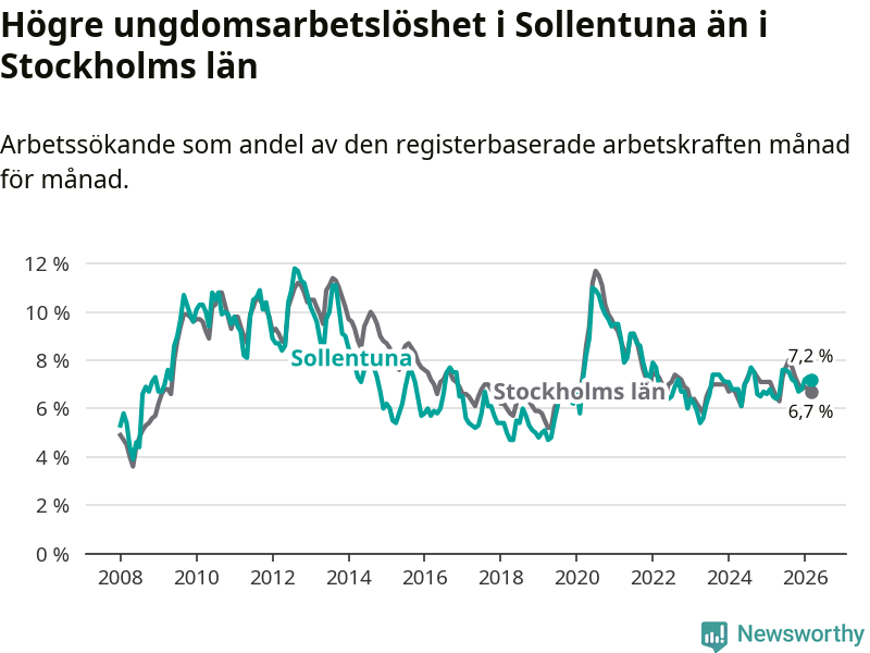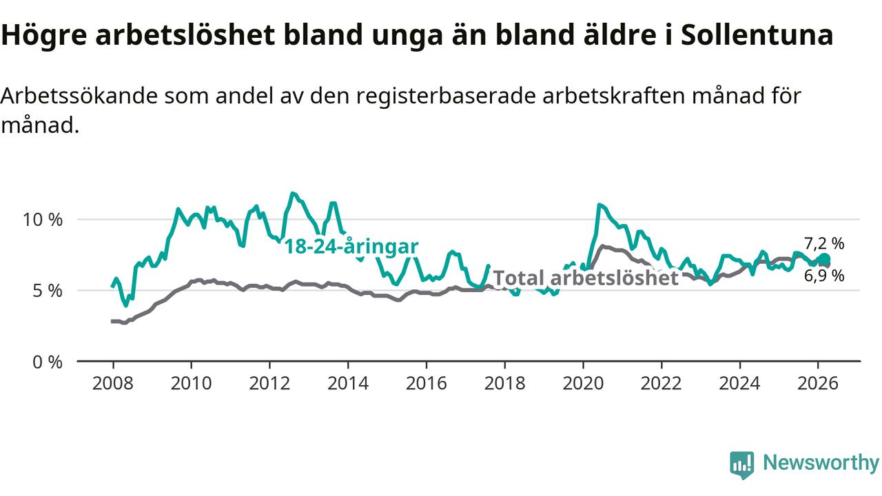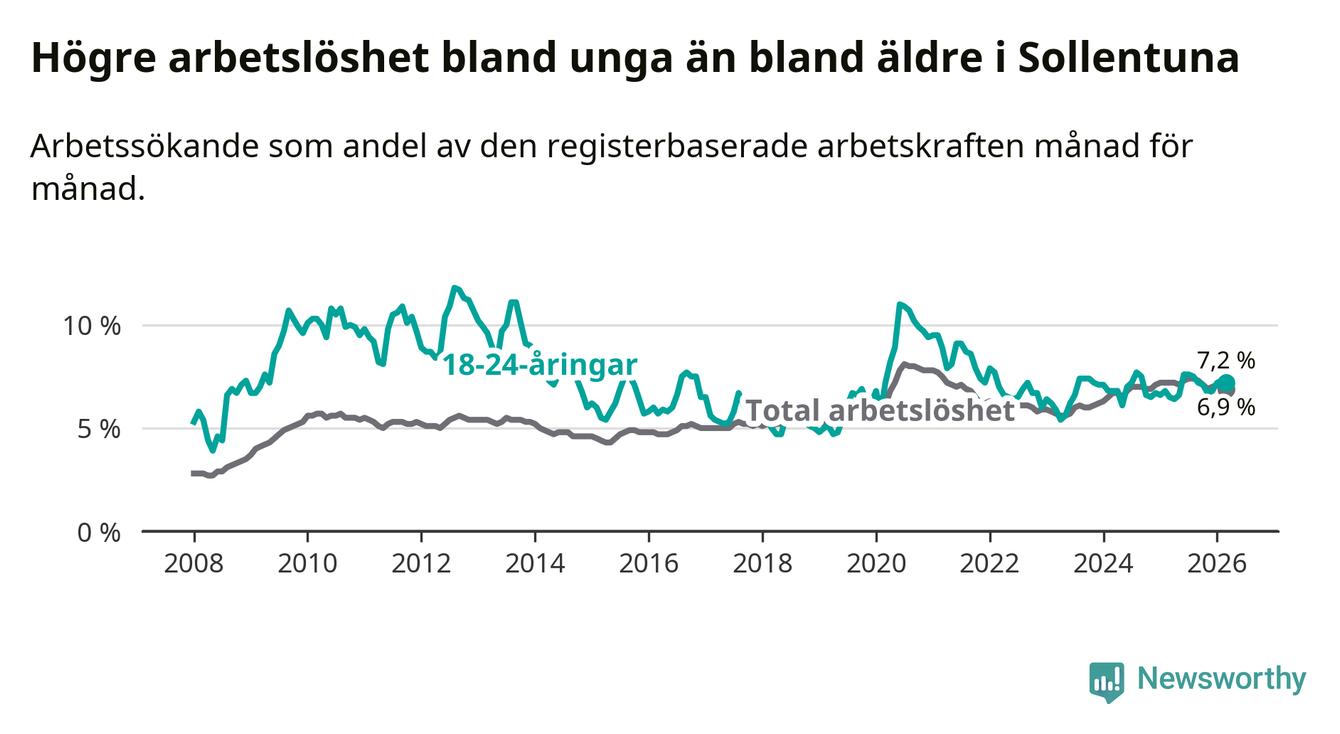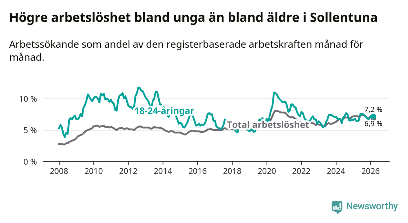 Medan Sollentuna har ungefär samma total arbetslöshet som Stockholms län, ligger ungdomsarbetslösheten 0,5 procentenheter högre i Sollentuna.