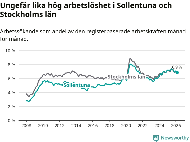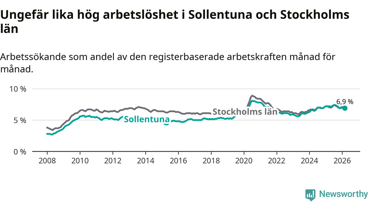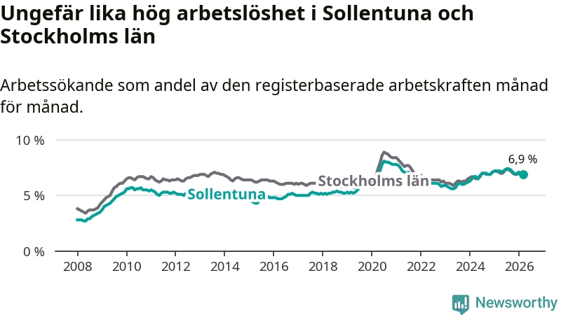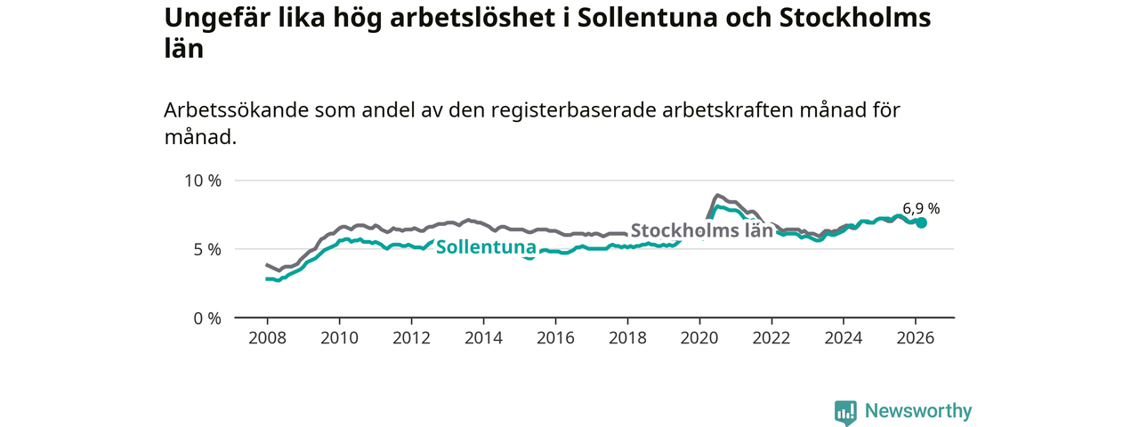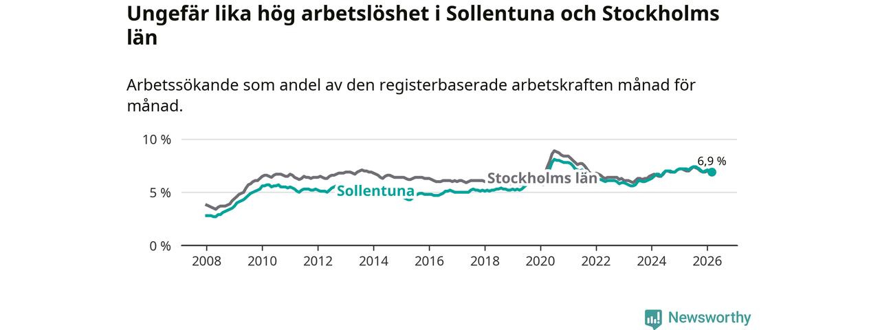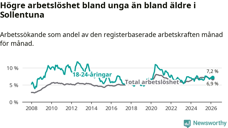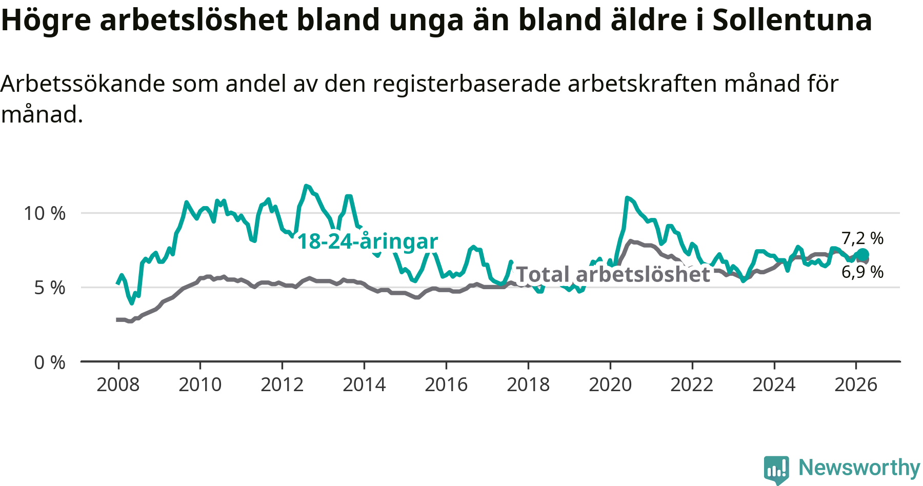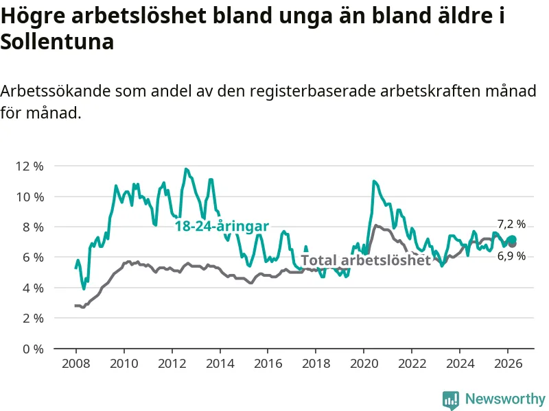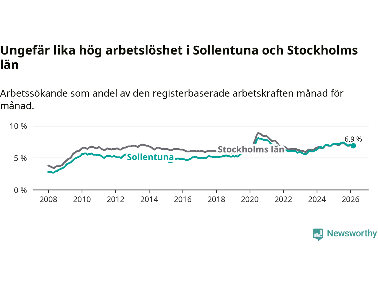 Medan Sollentuna har ungefär samma total arbetslöshet som Stockholms län, ligger ungdomsarbetslösheten 0,5 procentenheter högre i Sollentuna.