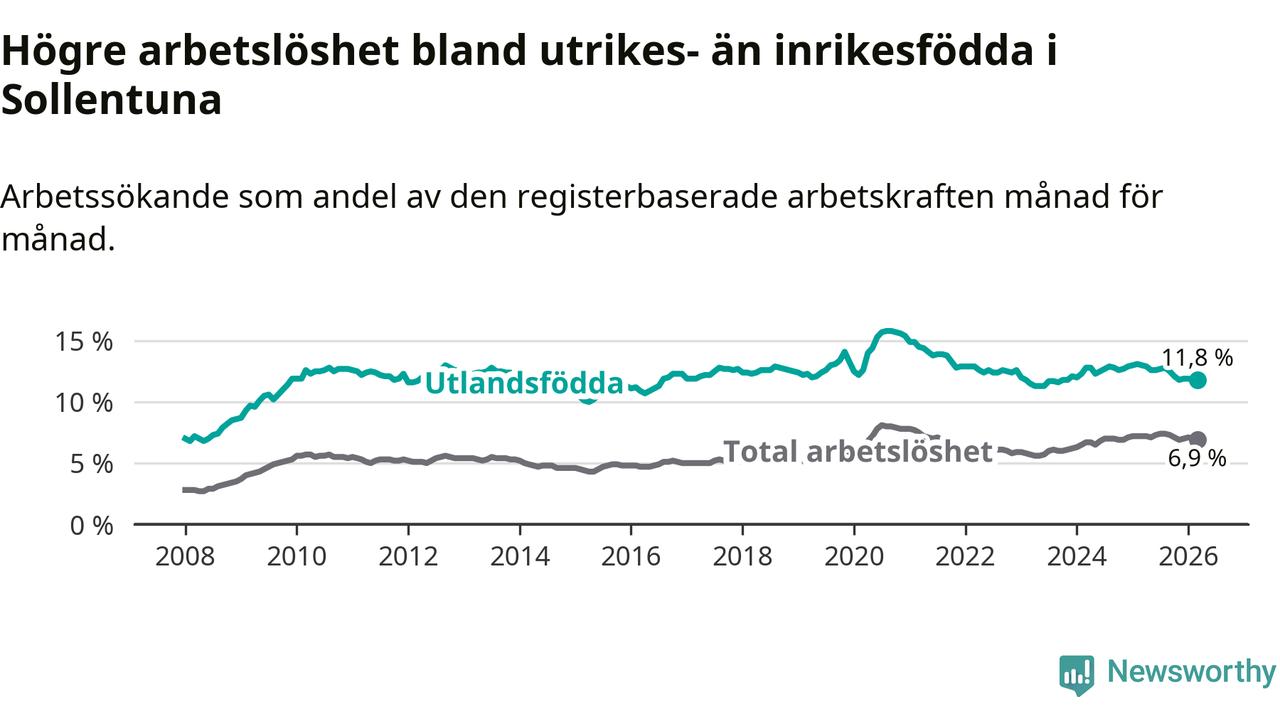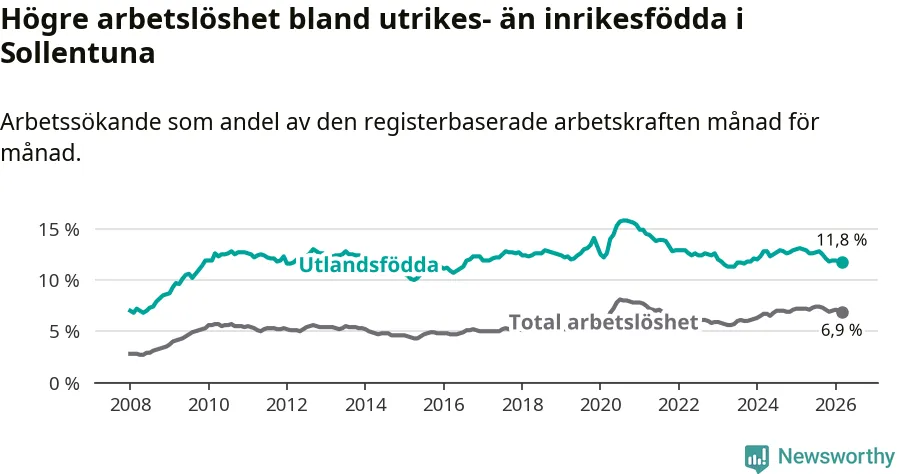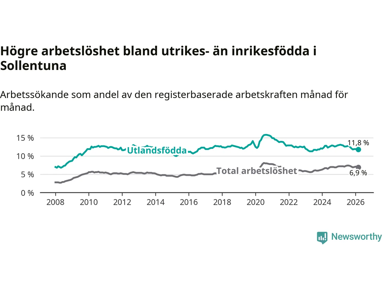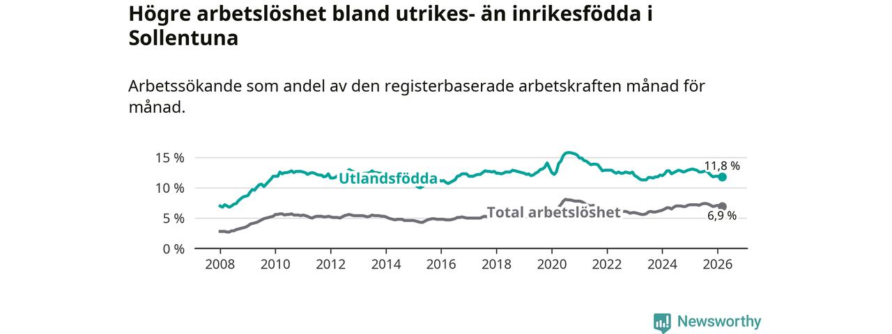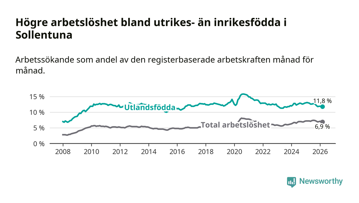 Skillnaden i arbetslöshet mellan utrikesfödda och hela befolkningen är 4,9 procentenheter i Sollentuna. Det är en mindre skillnad än för ett år sedan (−0,9 procentenheter).