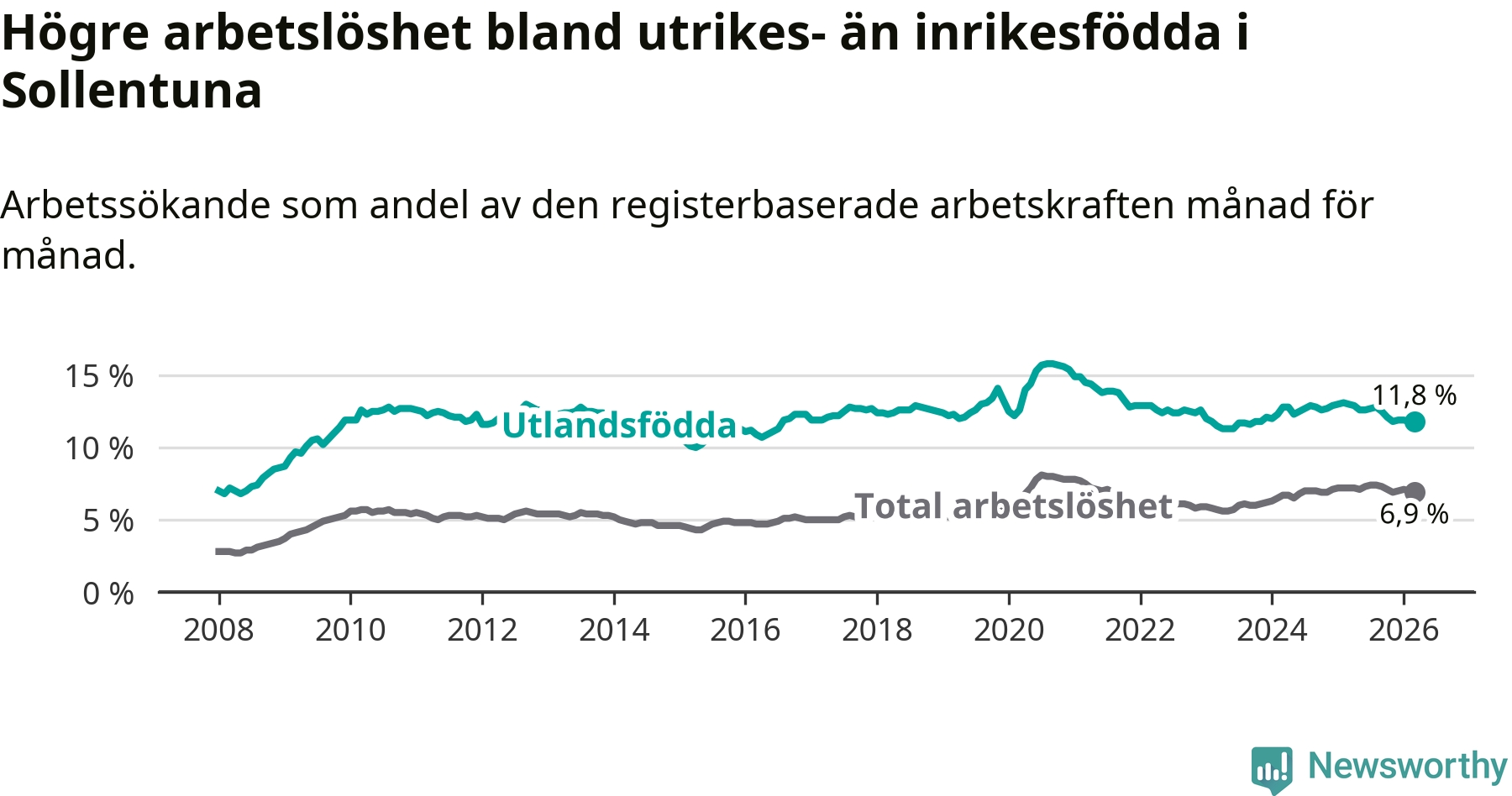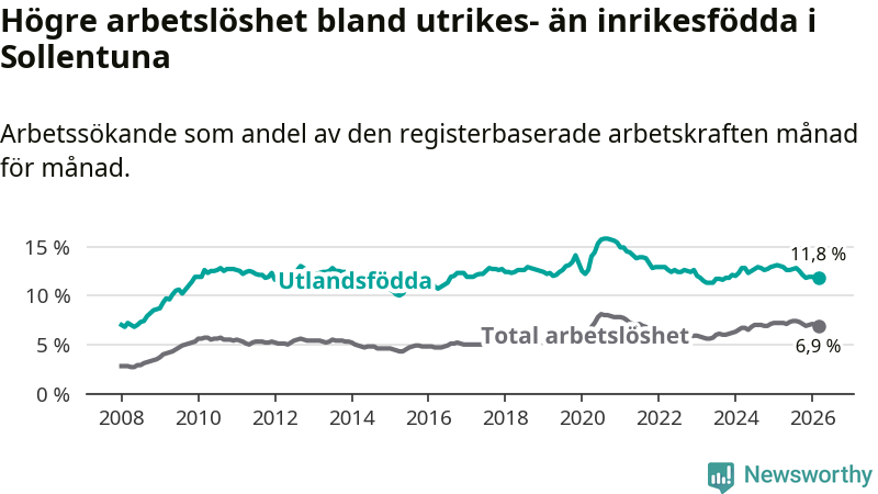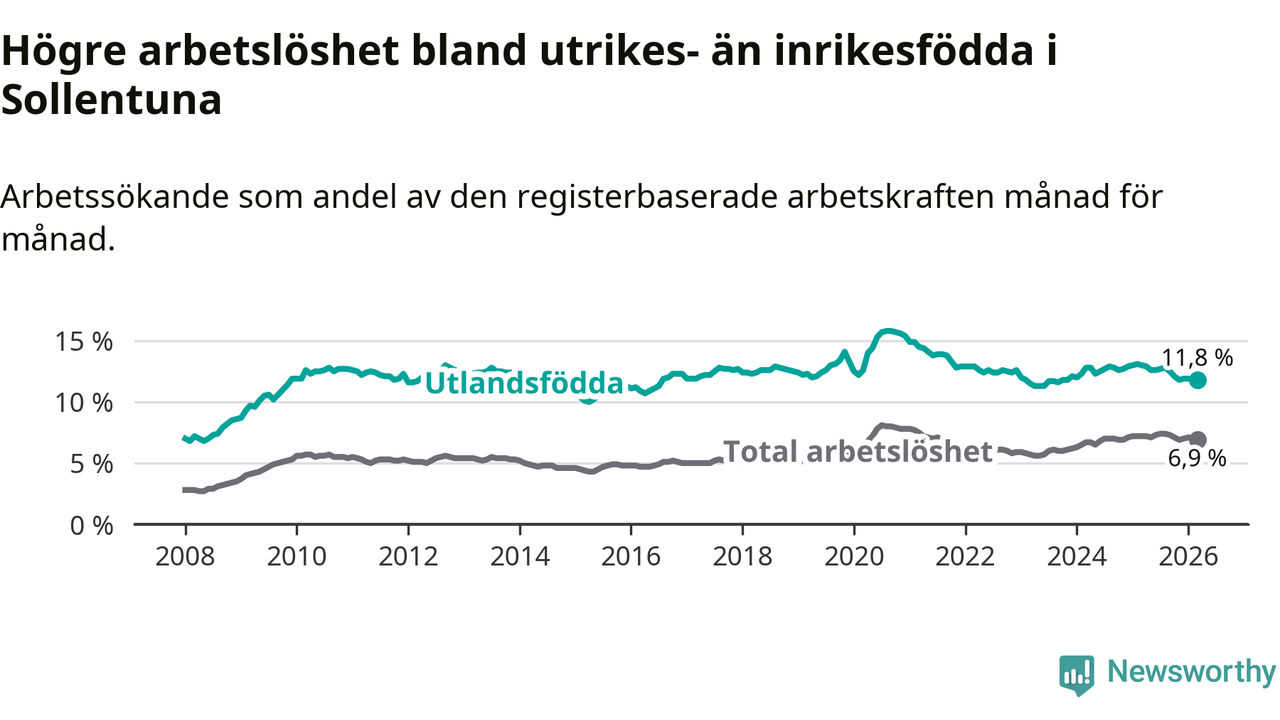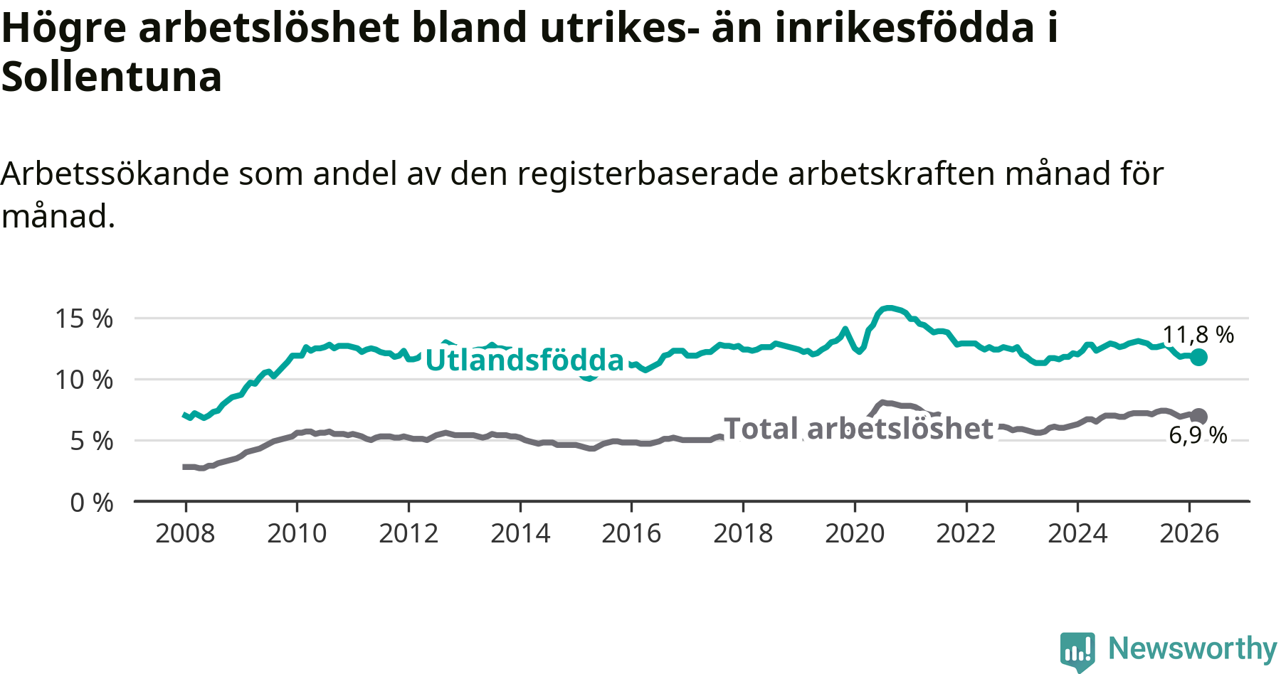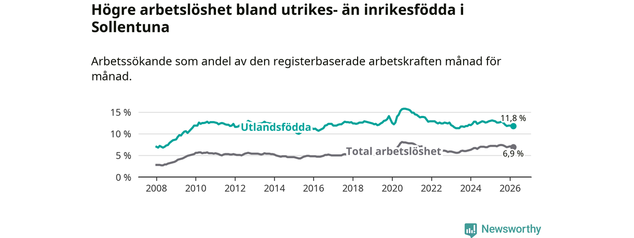Skillnaden i arbetslöshet mellan utrikesfödda och hela befolkningen är 4,9 procentenheter i Sollentuna. Det är en mindre skillnad än för ett år sedan (−0,9 procentenheter).
