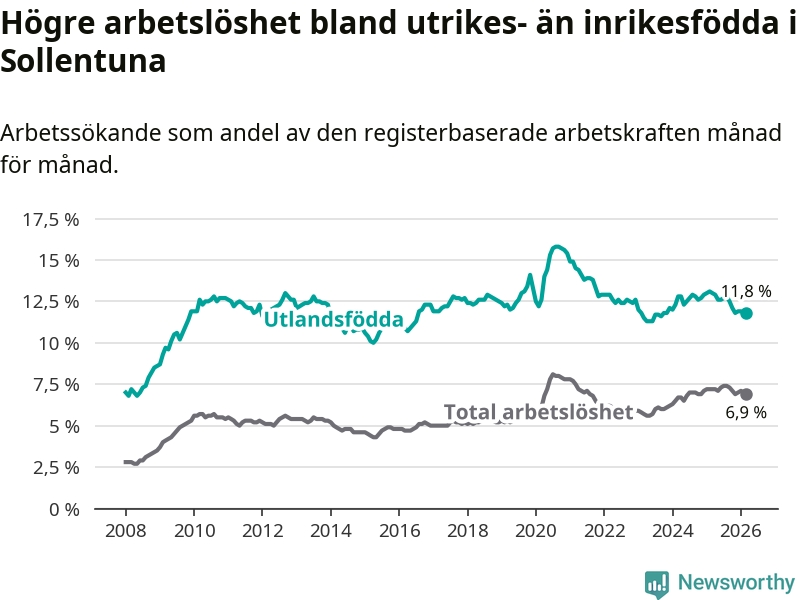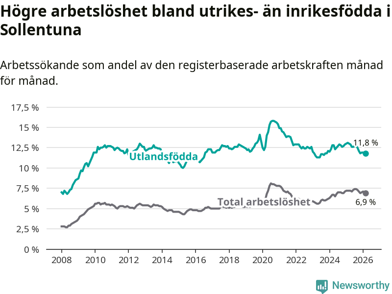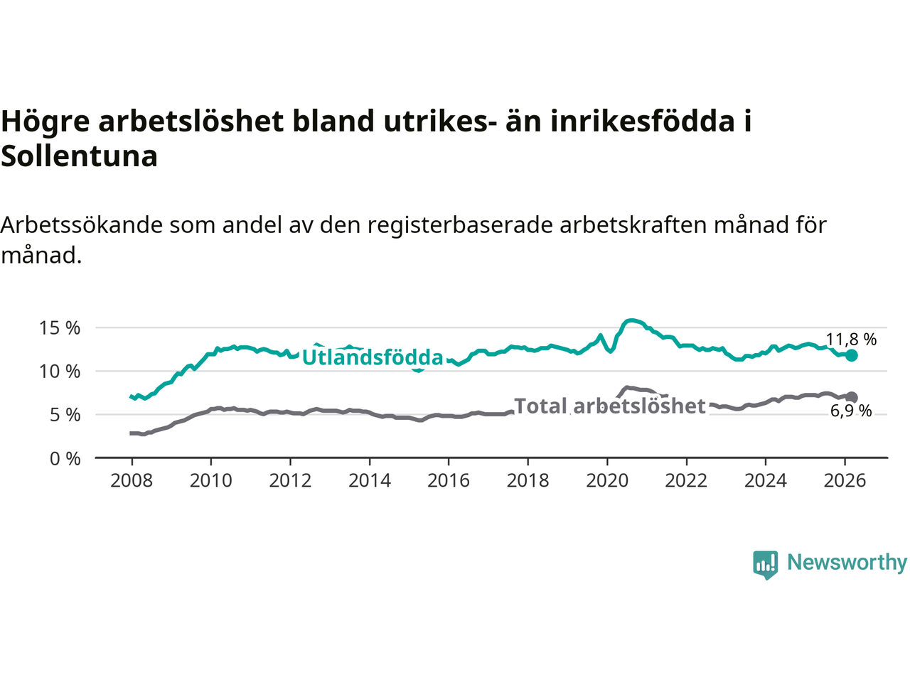 Arbetslösheten bland utlandsfödda var 11,8 procent i Sollentuna under mars månad, motsvarande 1 742 av 14 763 personer. Det är 1,2 procentenheter färre än vid samma tidpunkt i fjol (−101 om man räknar personer). Därmed är de utlandsföddas arbetslöshet lägre än vid samma tidpunkt i fjol för åttonde månaden i följd.