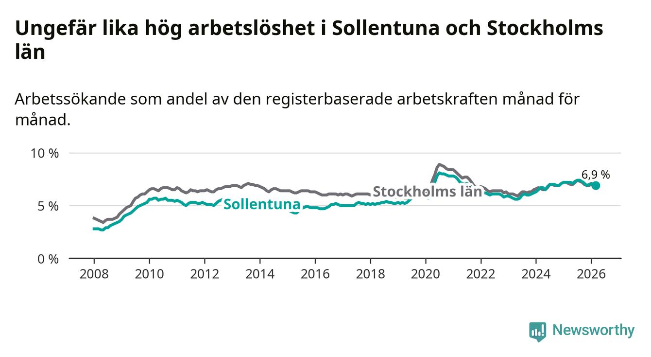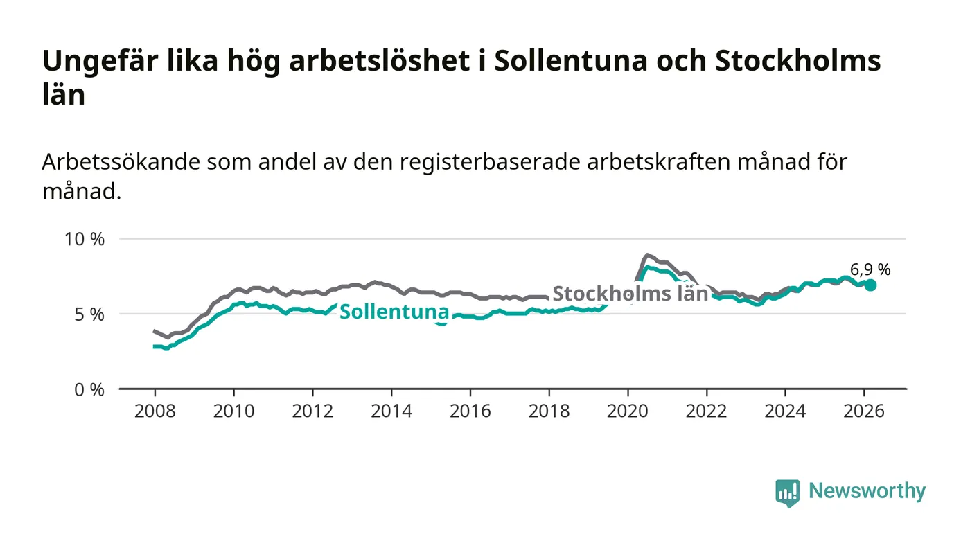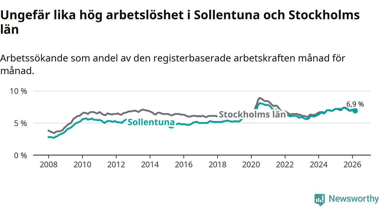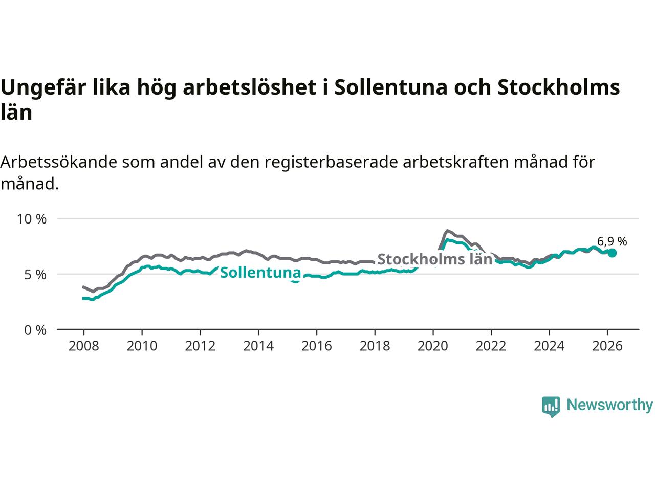 Under mars månad rapporterade Sollentuna kommun en total arbetslöshet på 6,9 procent. Det är en minskning jämfört med samma tidpunkt i fjol (−0,3 procentenheter). Även i Stockholms län sjunker arbetslösheten något.