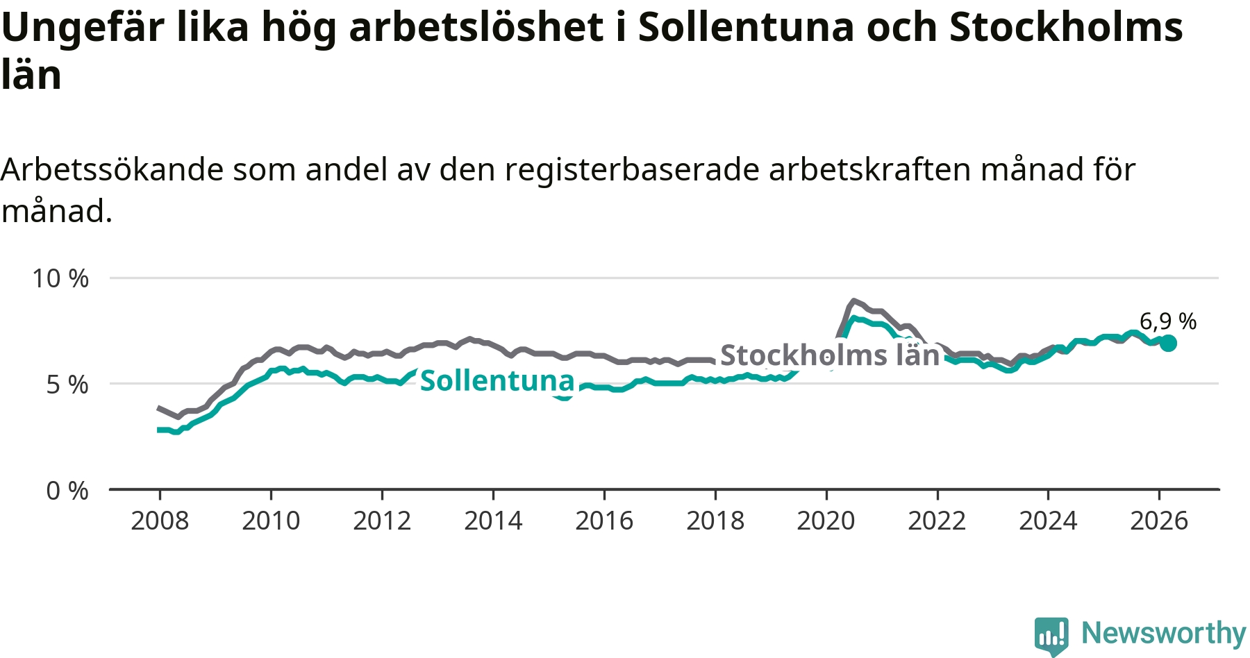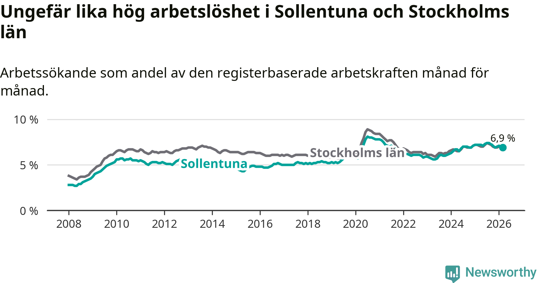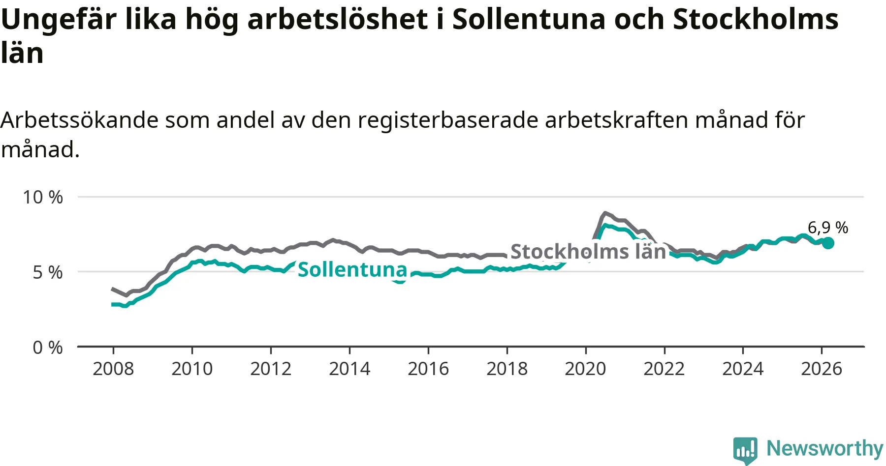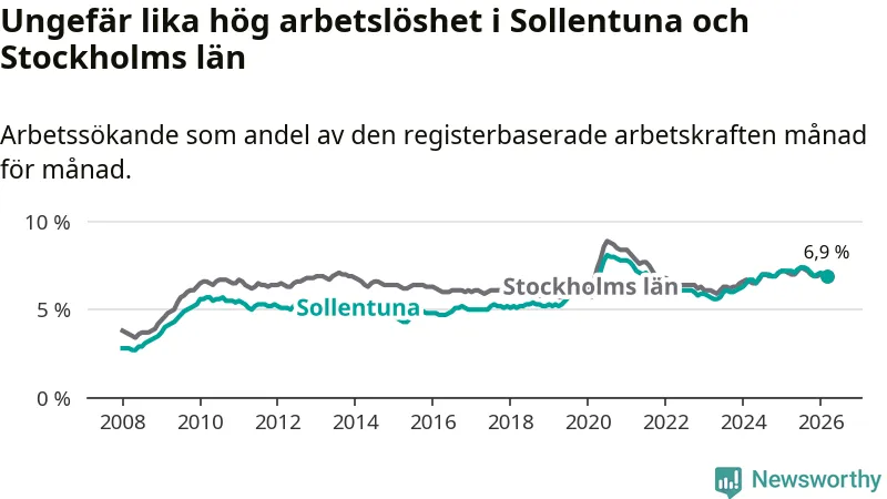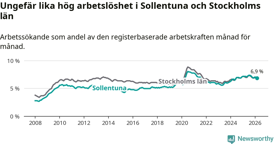 Under mars månad rapporterade Sollentuna kommun en total arbetslöshet på 6,9 procent. Det är en minskning jämfört med samma tidpunkt i fjol (−0,3 procentenheter). Även i Stockholms län sjunker arbetslösheten något.