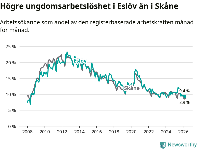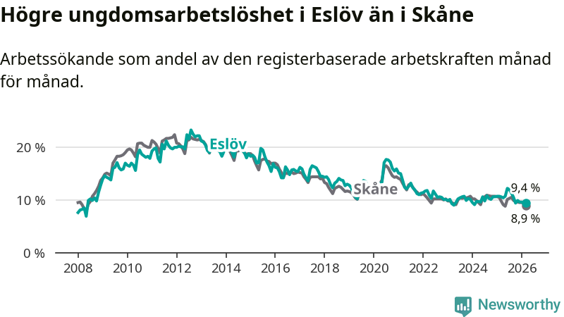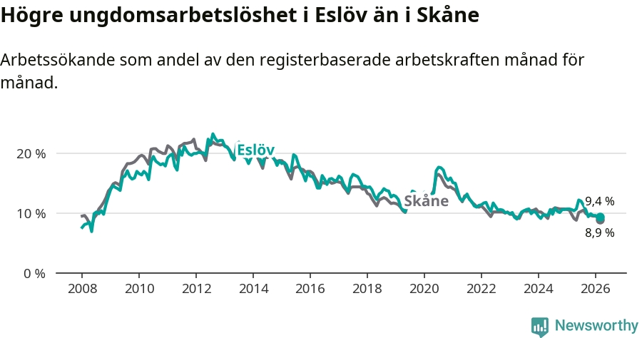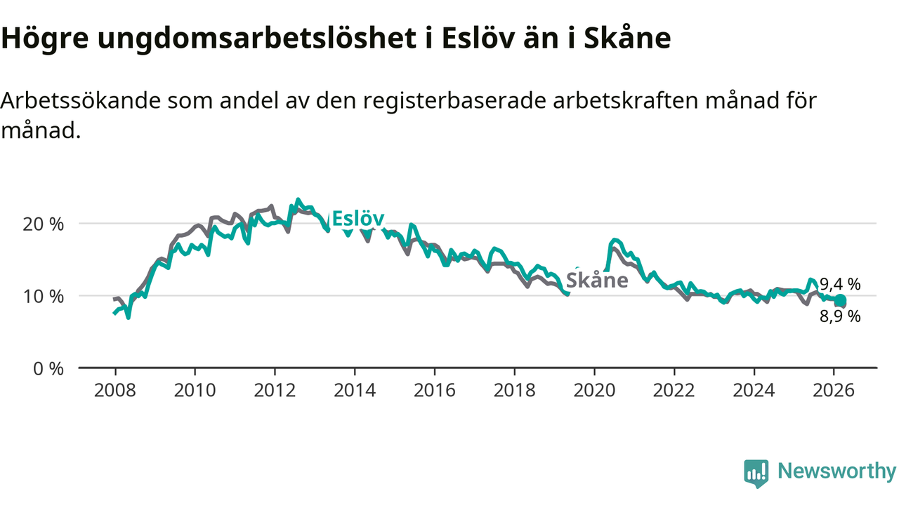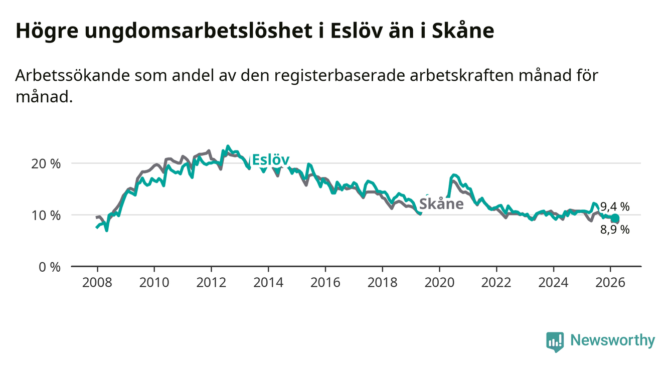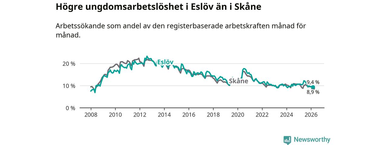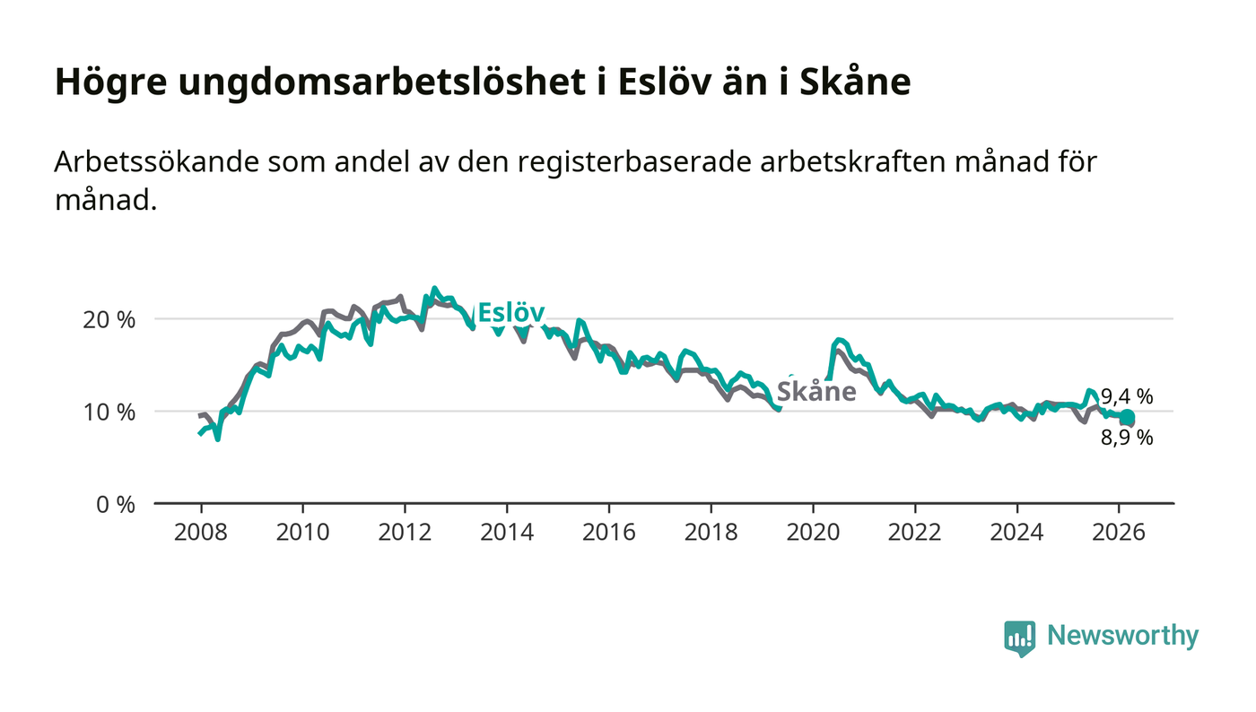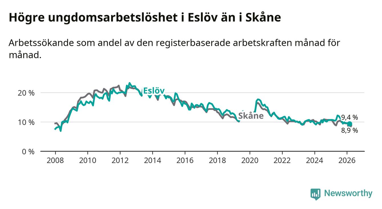 Medan Eslöv har lägre total arbetslöshet än Skåne, ligger ungdomsarbetslösheten 0,5 procentenheter högre i Eslöv.