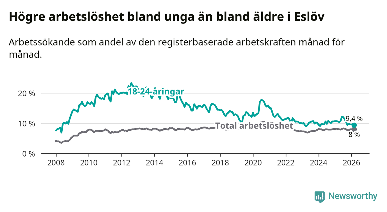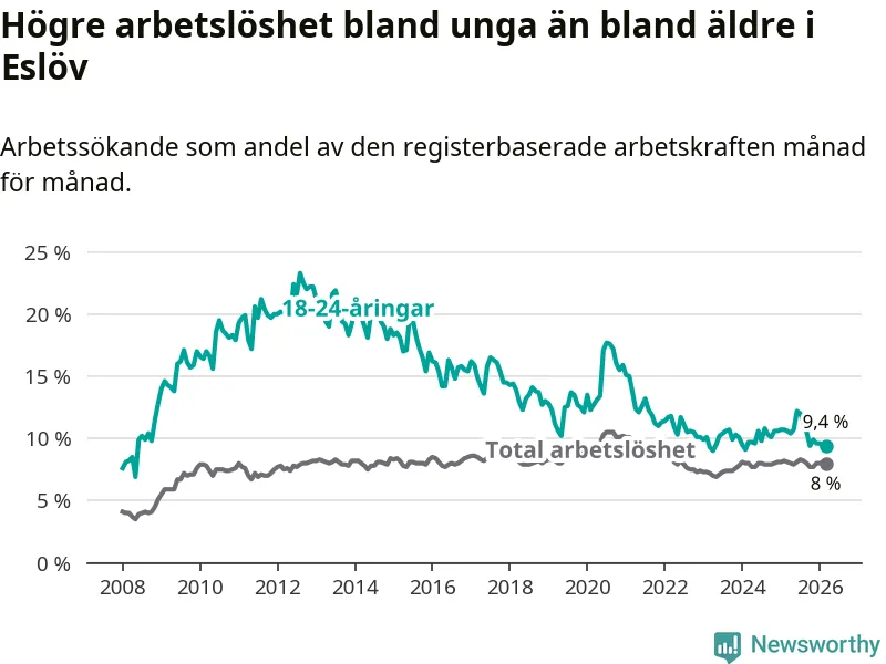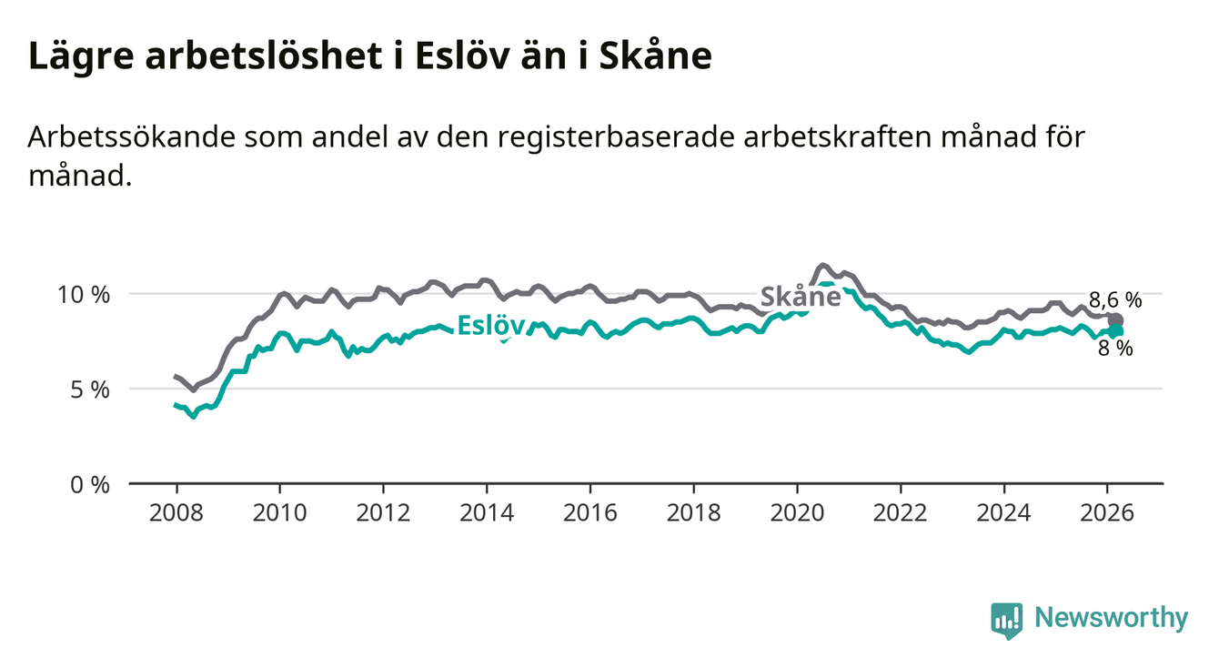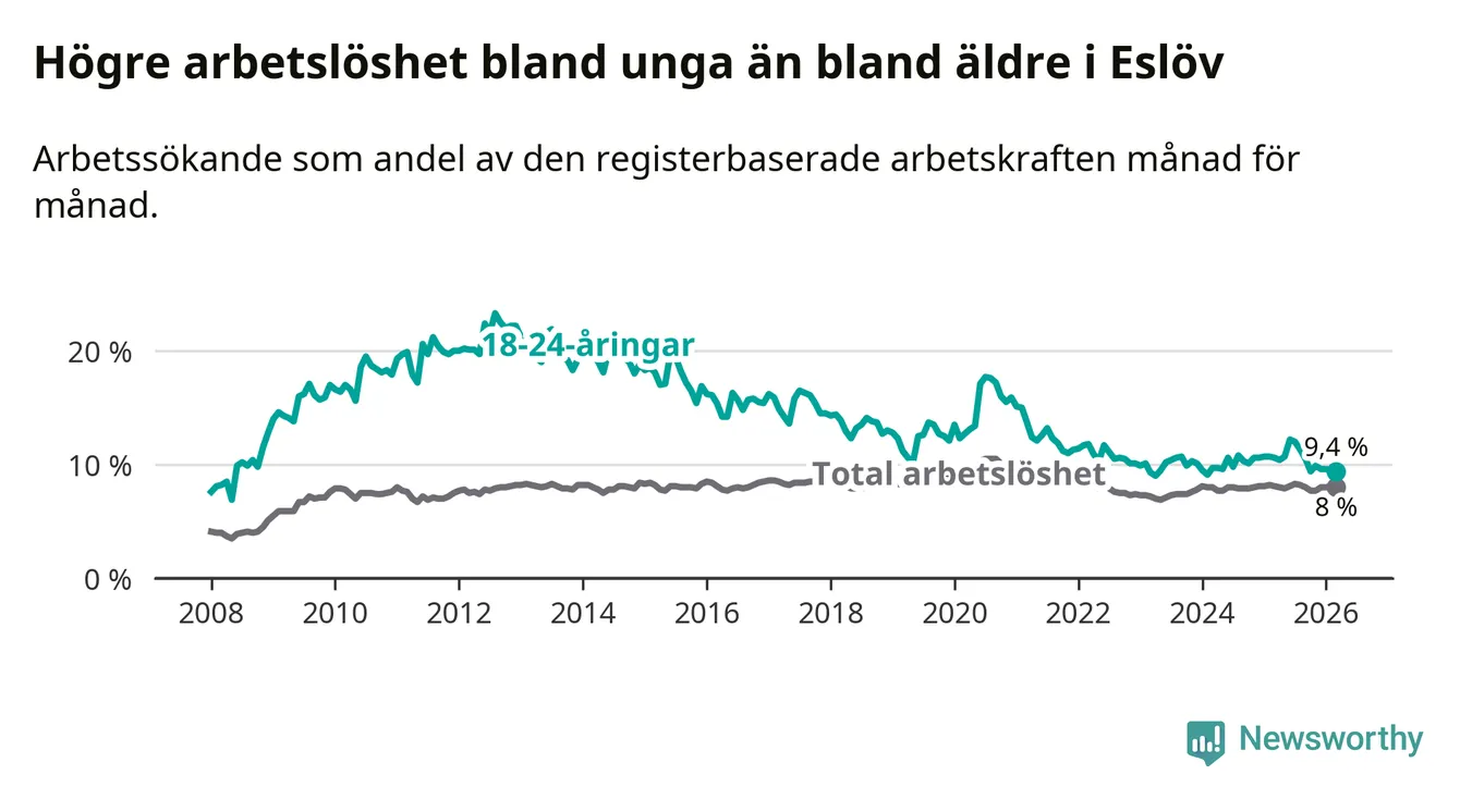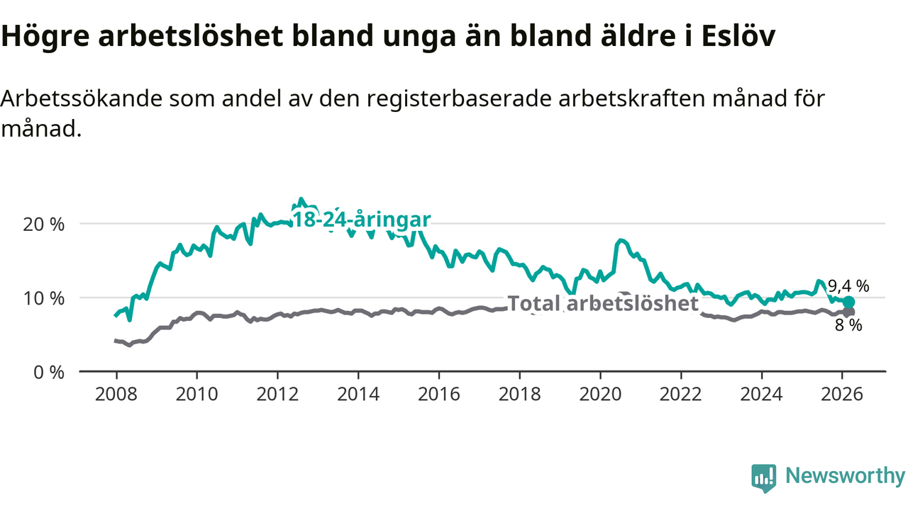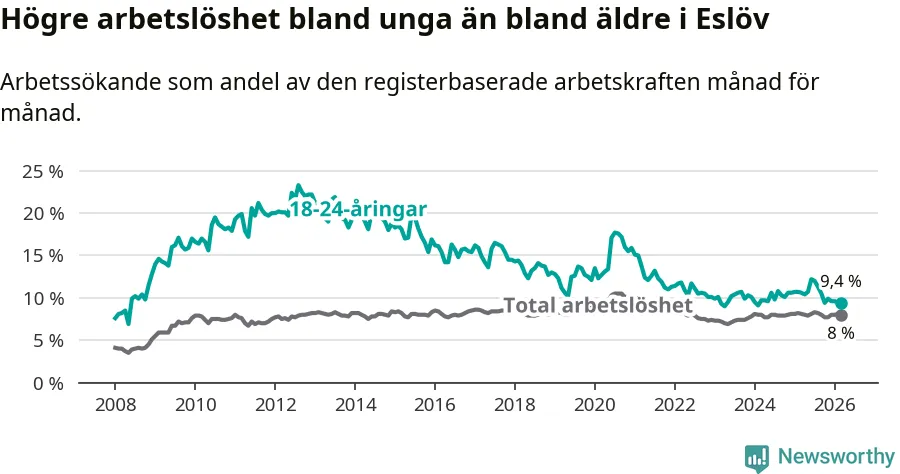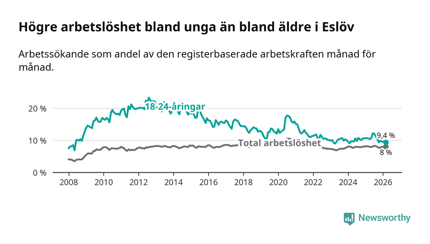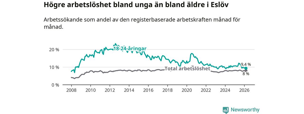 Medan Eslöv har lägre total arbetslöshet än Skåne, ligger ungdomsarbetslösheten 0,5 procentenheter högre i Eslöv.