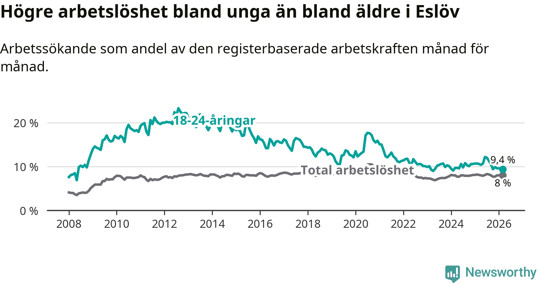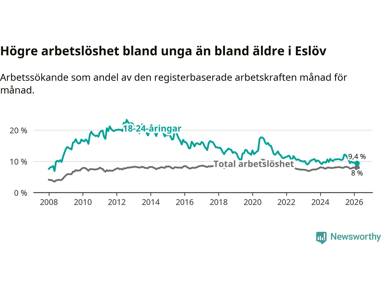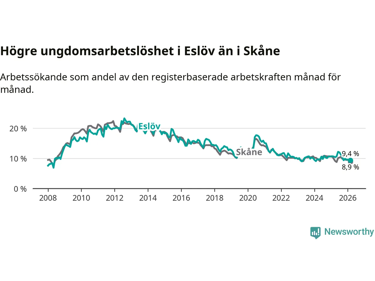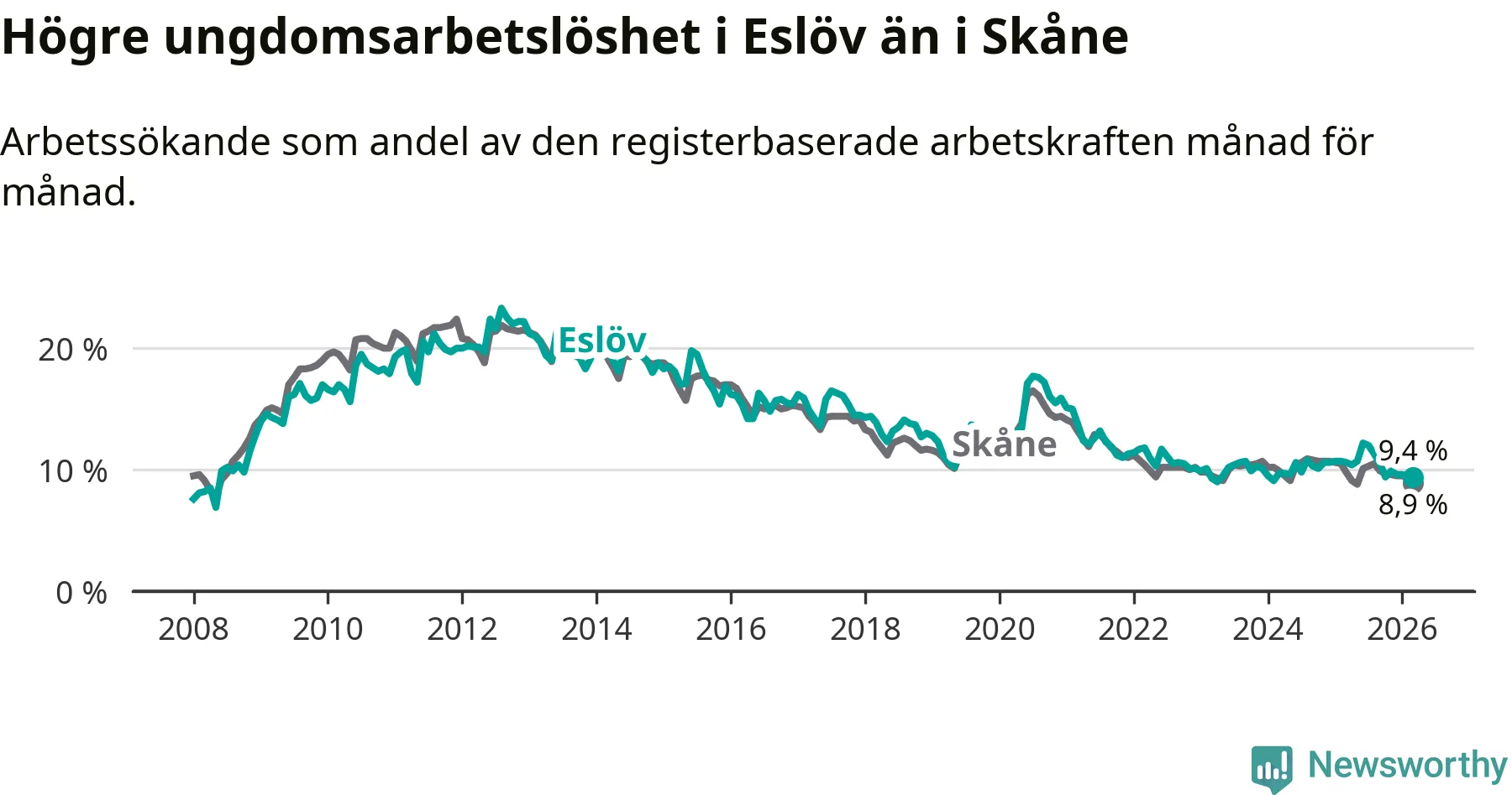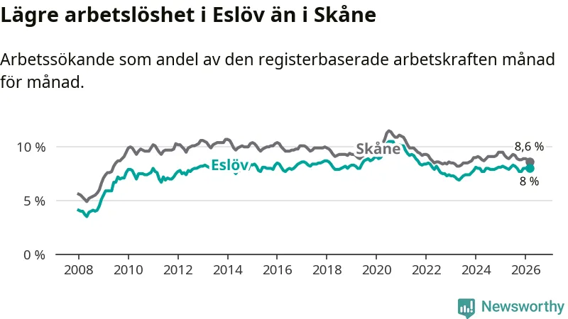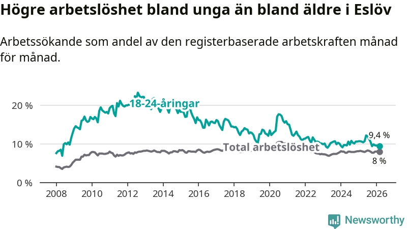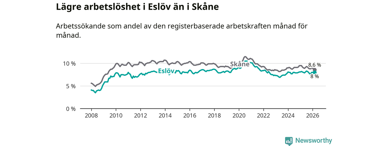 Medan Eslöv har lägre total arbetslöshet än Skåne, ligger ungdomsarbetslösheten 0,5 procentenheter högre i Eslöv.