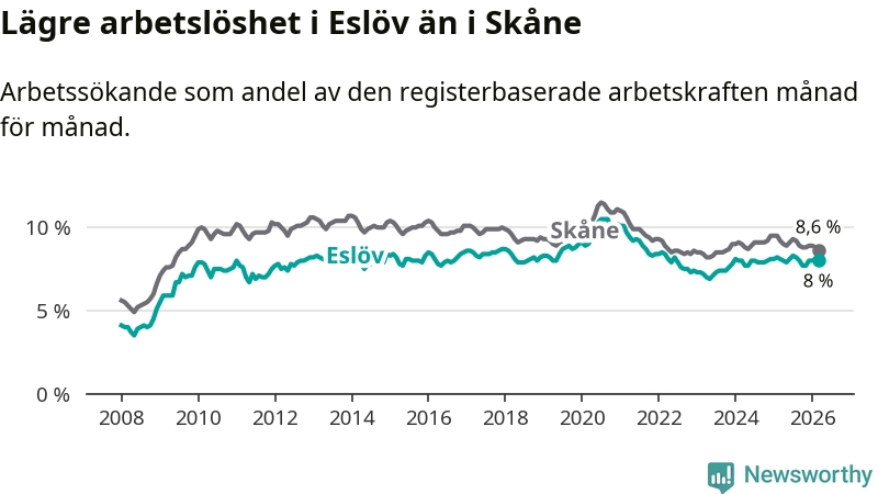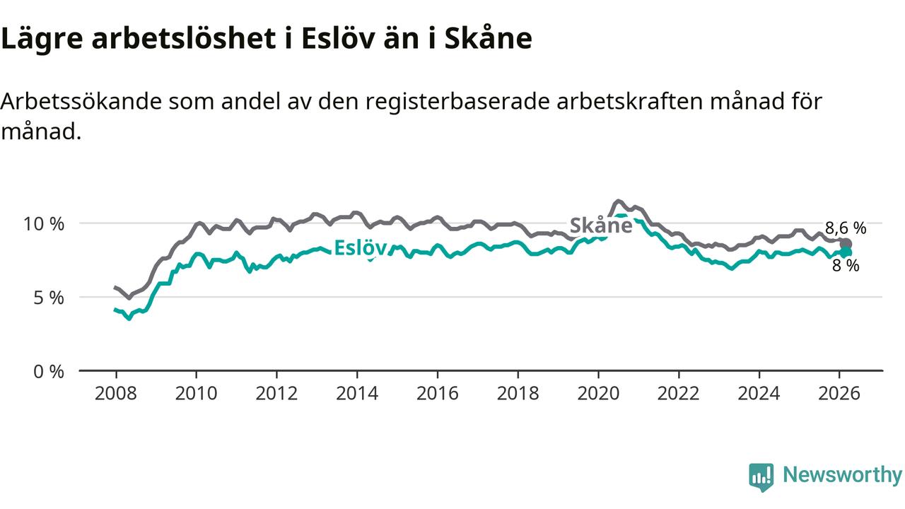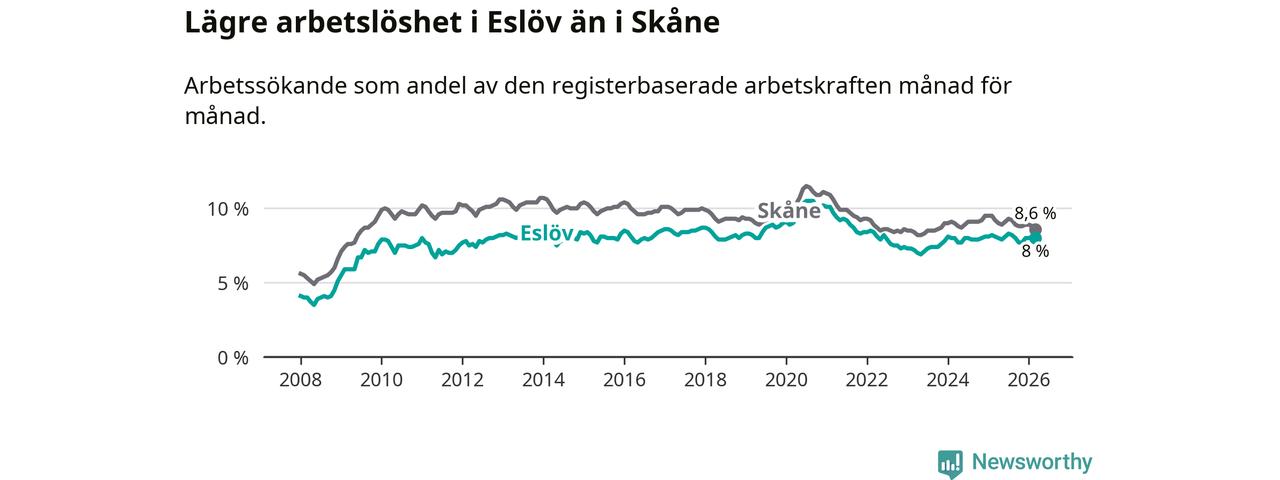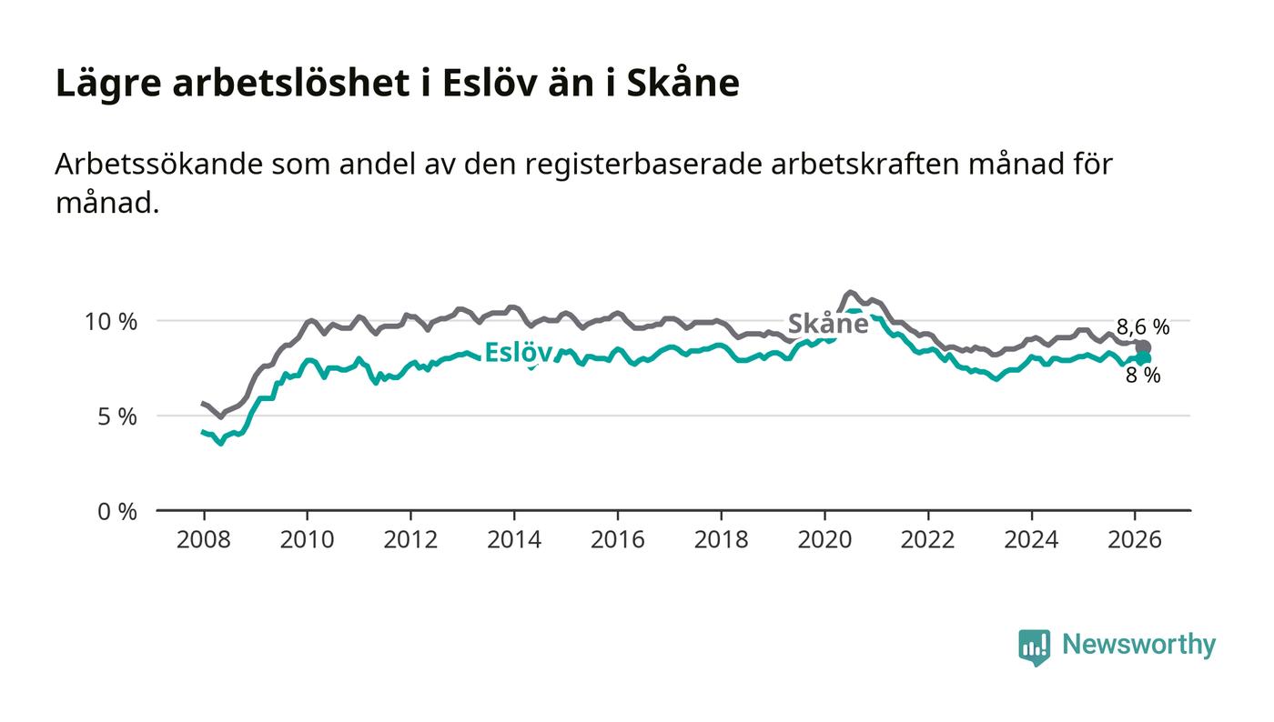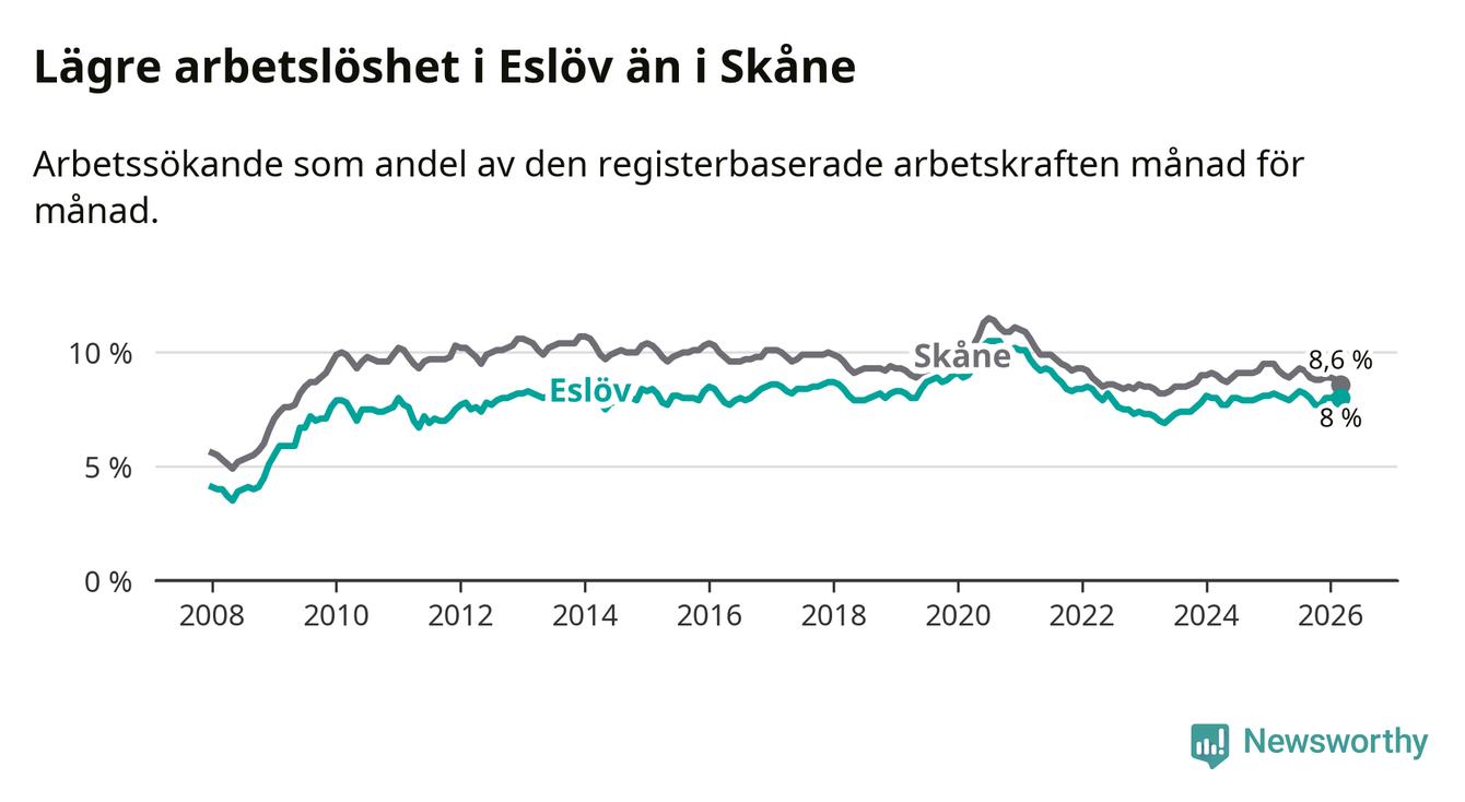 Under mars månad rapporterade Eslövs kommun en total arbetslöshet på 8,0 procent. Det är en minskning jämfört med samma tidpunkt i fjol (−0,1 procentenheter). Även i Skåne län sjunker arbetslösheten .