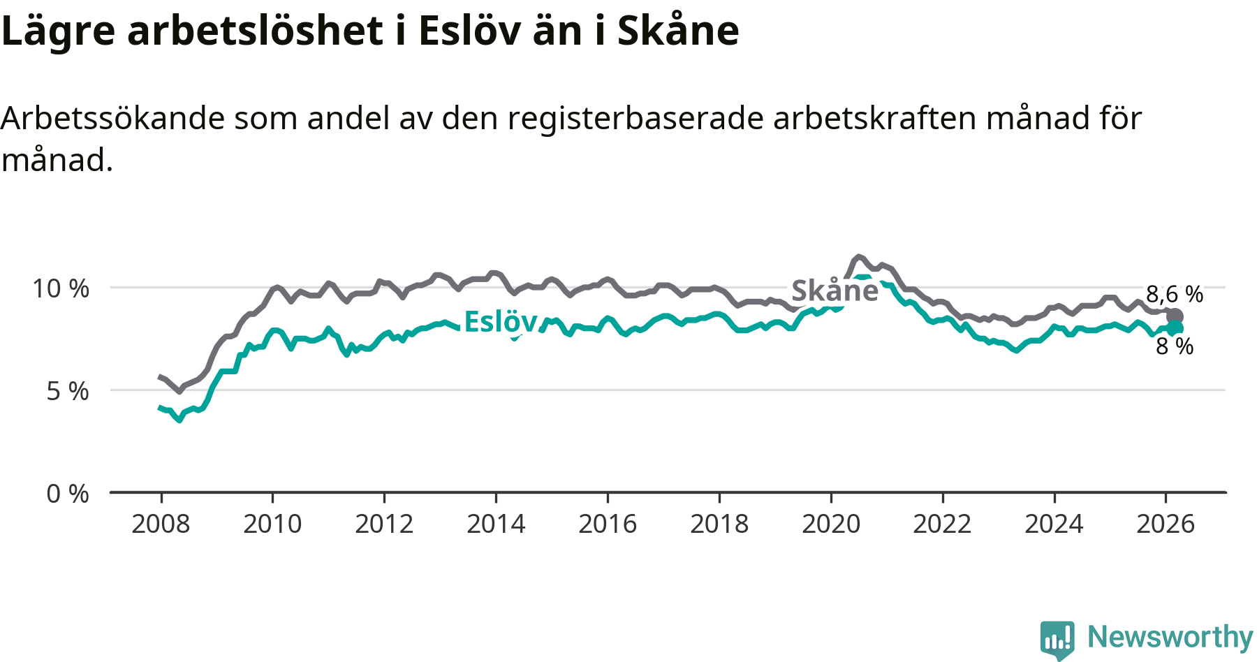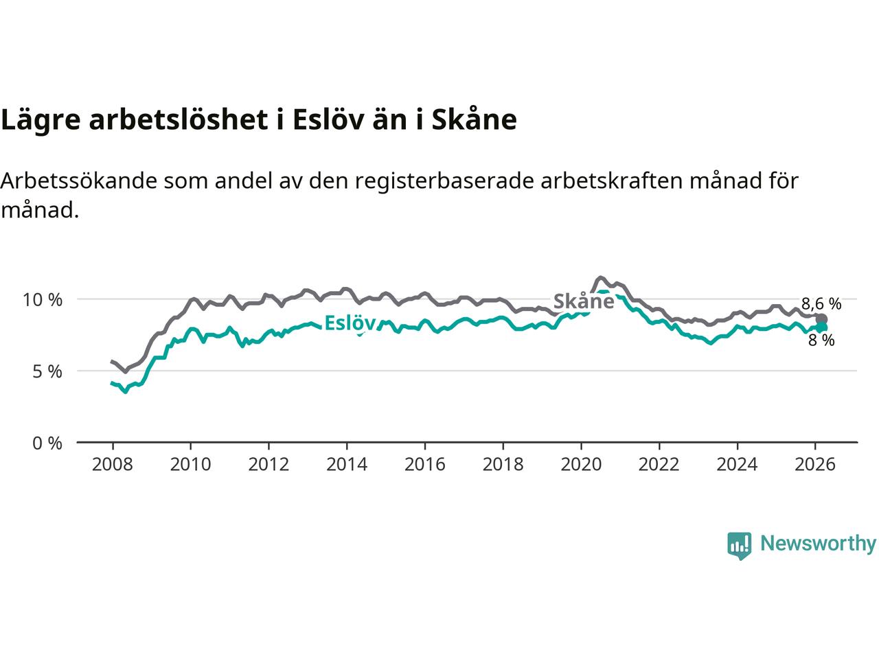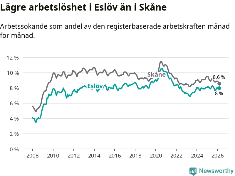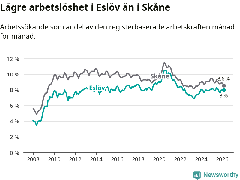 Graf: Arbetslöshet i Eslövs kommun och Skåne län