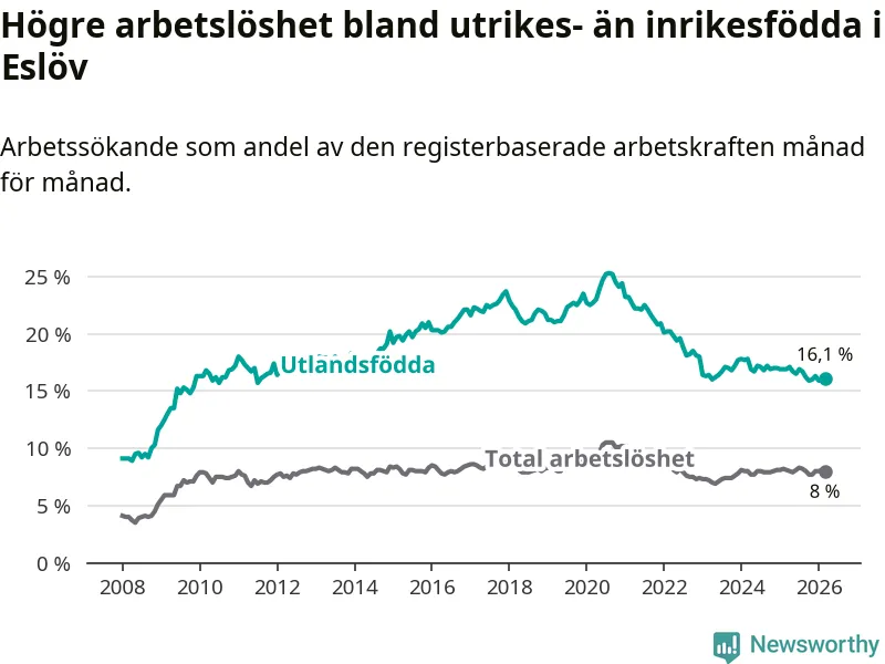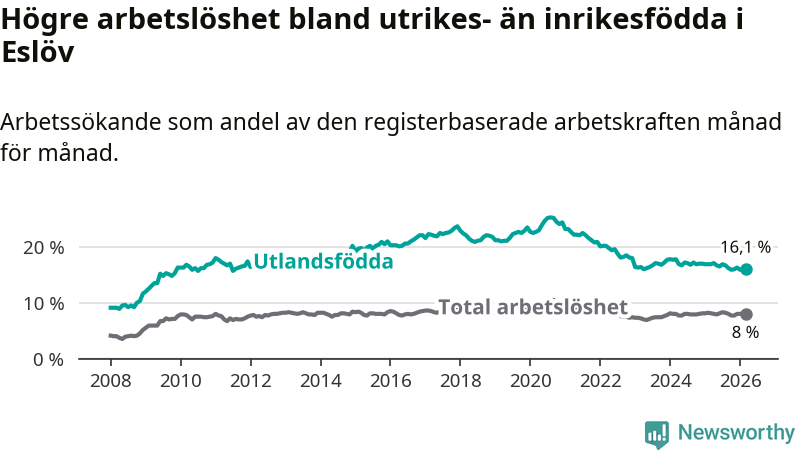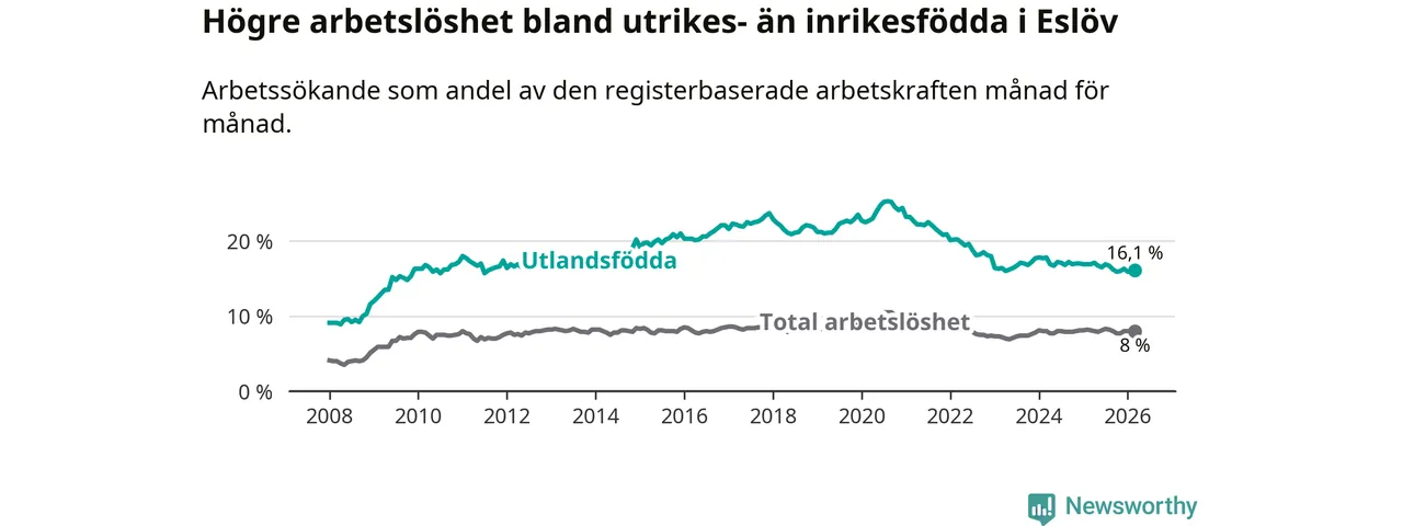 Skillnaden i arbetslöshet mellan utrikesfödda och hela befolkningen är 8,1 procentenheter i Eslöv. Det är en mindre skillnad än för ett år sedan (−0,7 procentenheter).