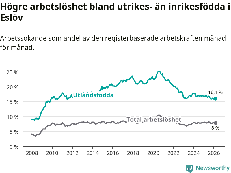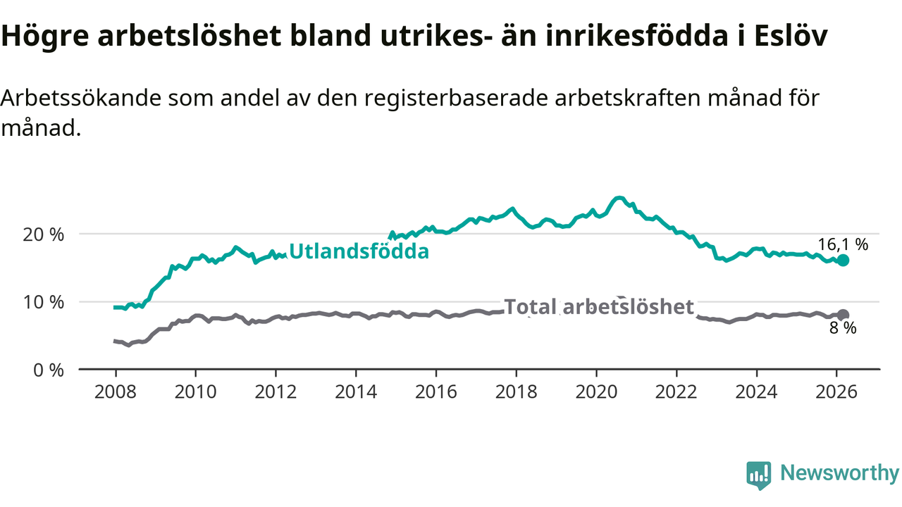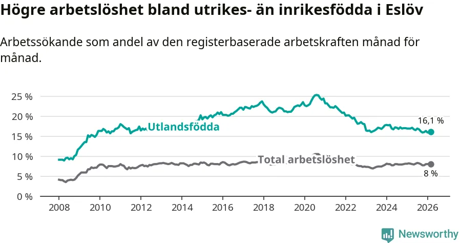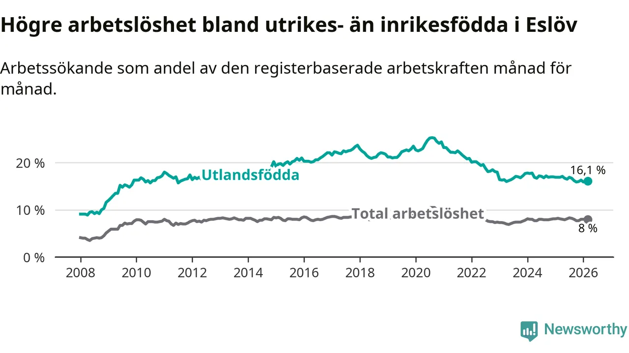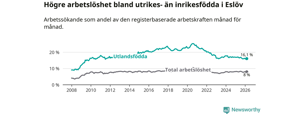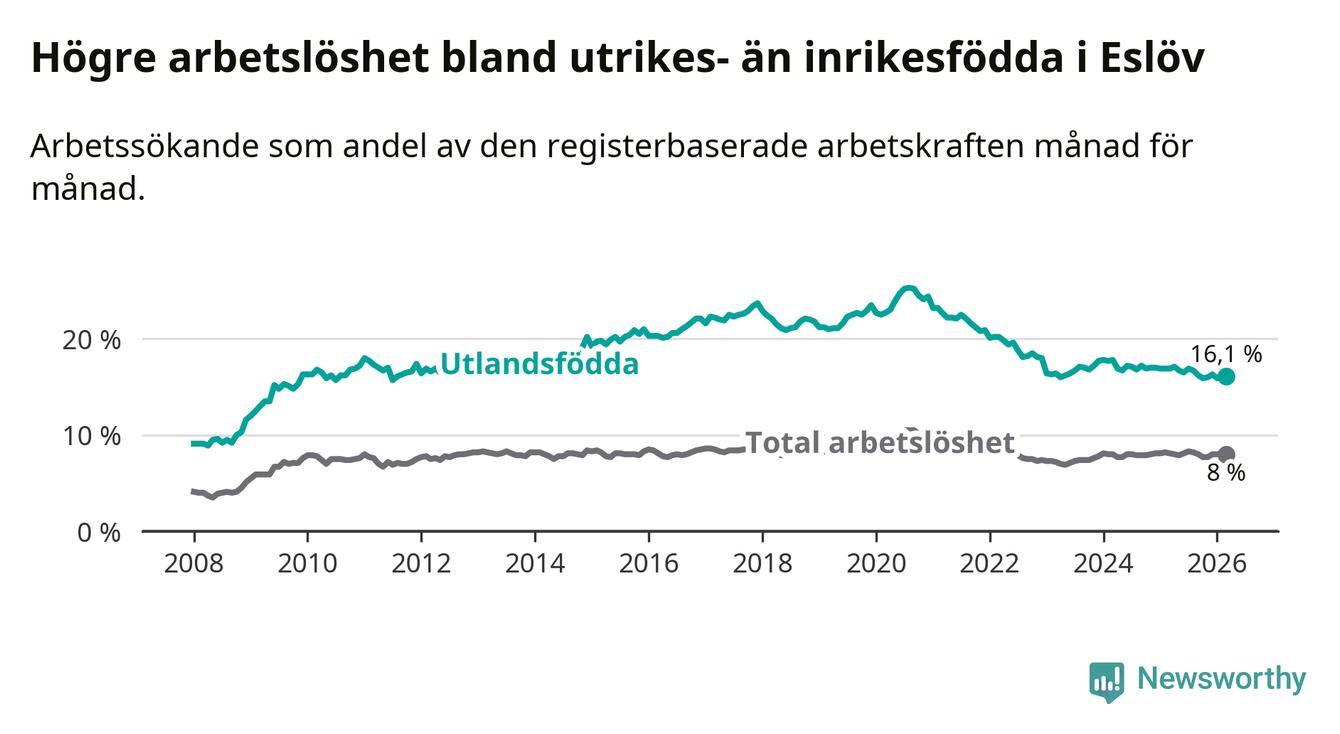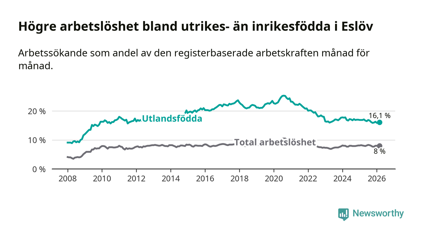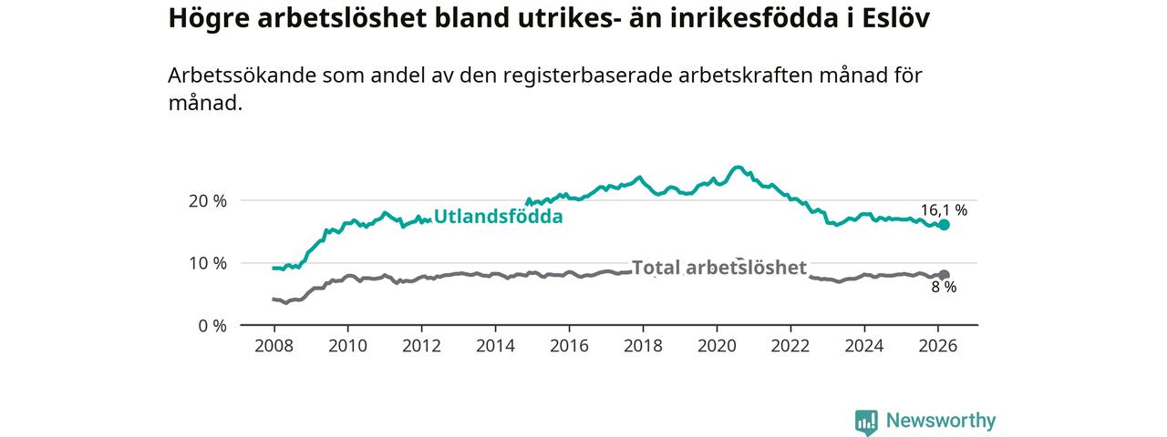 Arbetslösheten bland utlandsfödda var 16,1 procent i Eslöv under mars månad, motsvarande 728 av 4 522 personer. Det är 0,8 procentenheter färre än vid samma tidpunkt i fjol (−22 om man räknar personer). Därmed är de utlandsföddas arbetslöshet lägre än vid samma tidpunkt i fjol för tionde månaden i följd.