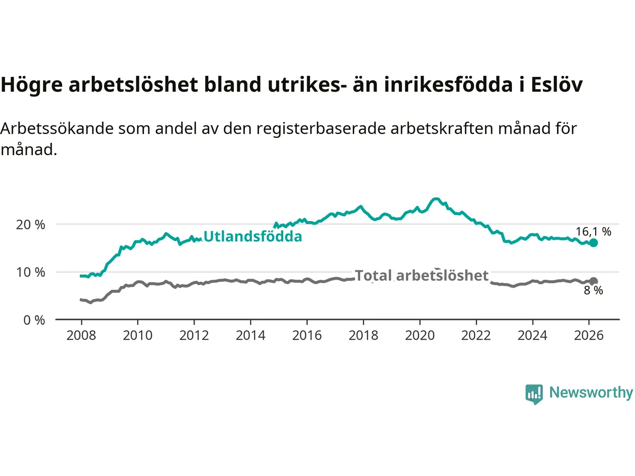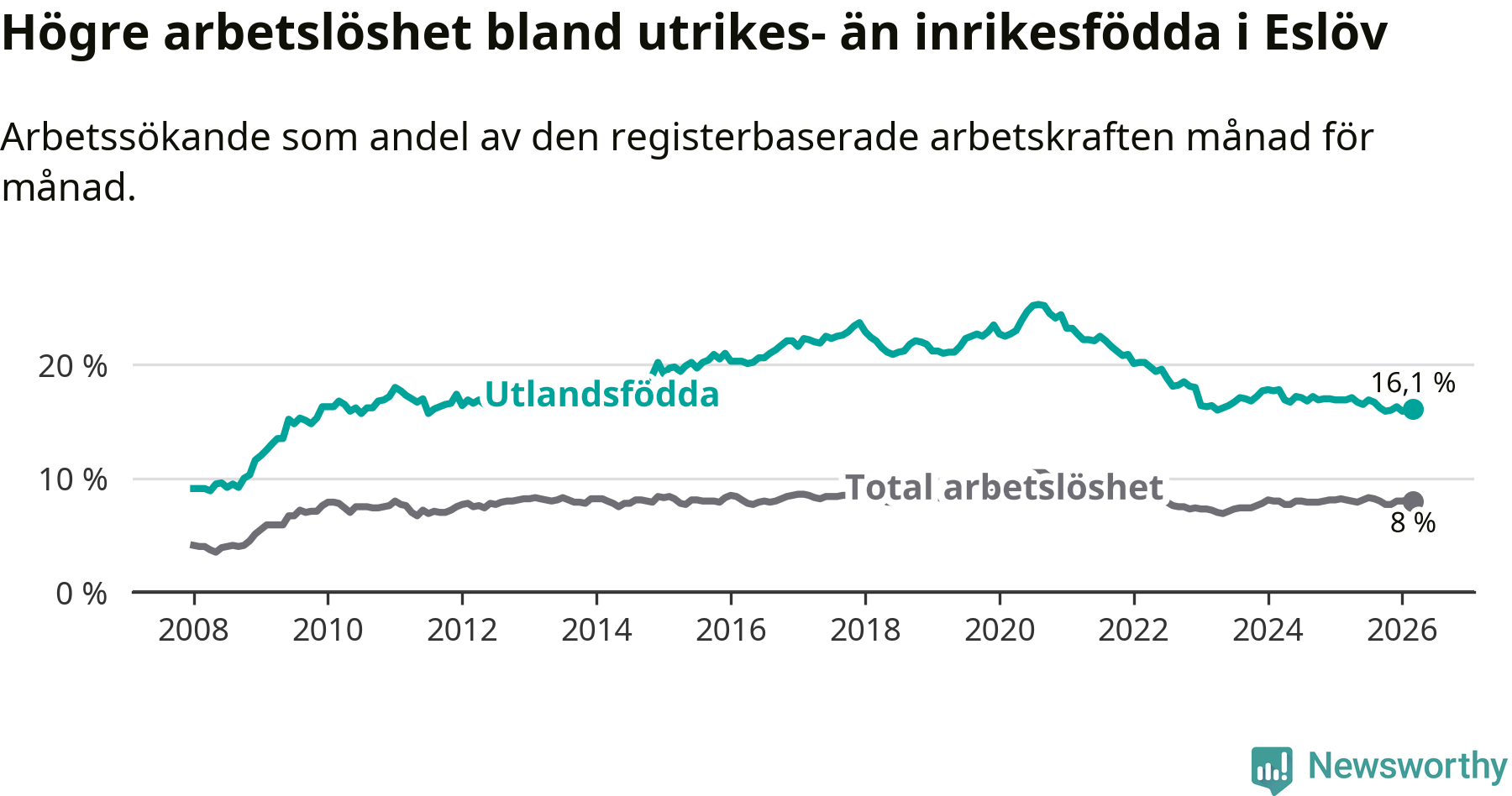 Graf: Skillnad i arbetslöshet mellan utrikesfödda och hela befolkningen i Eslövs kommun