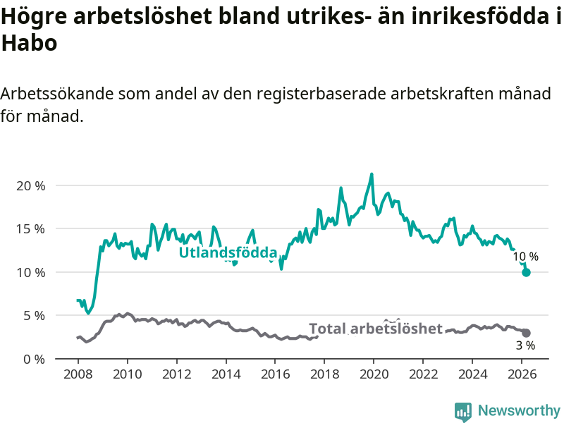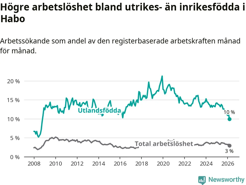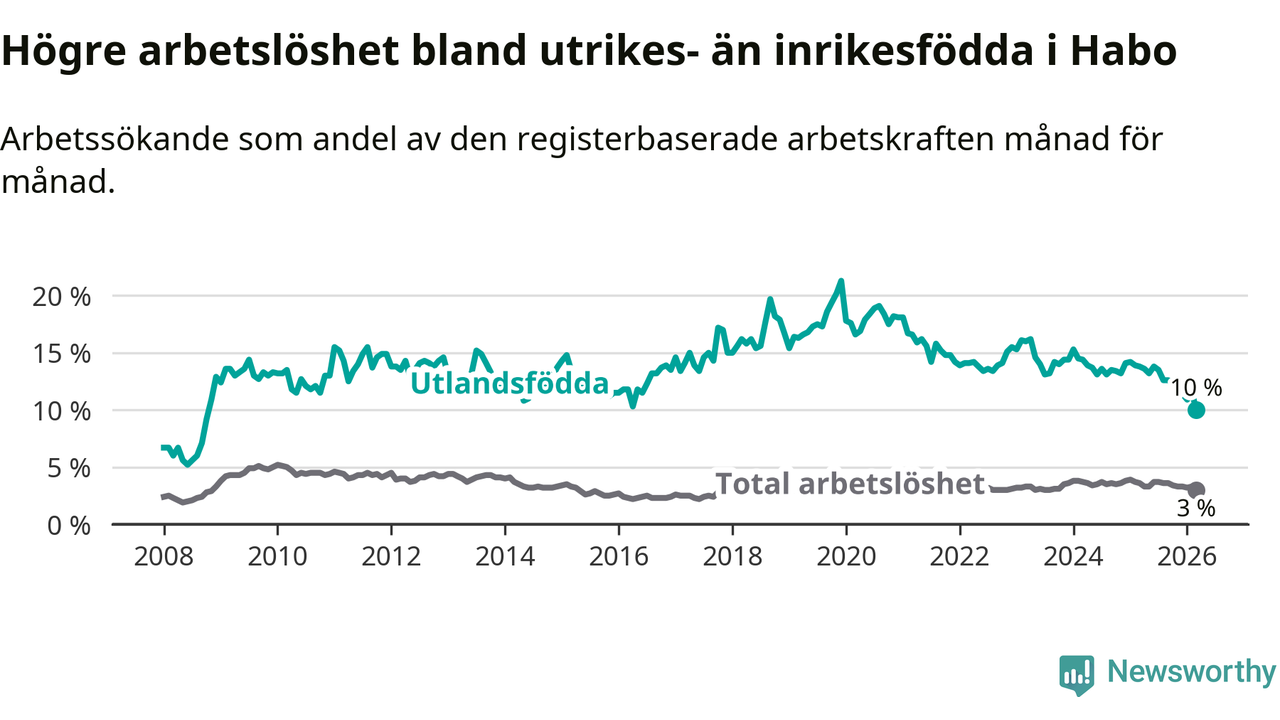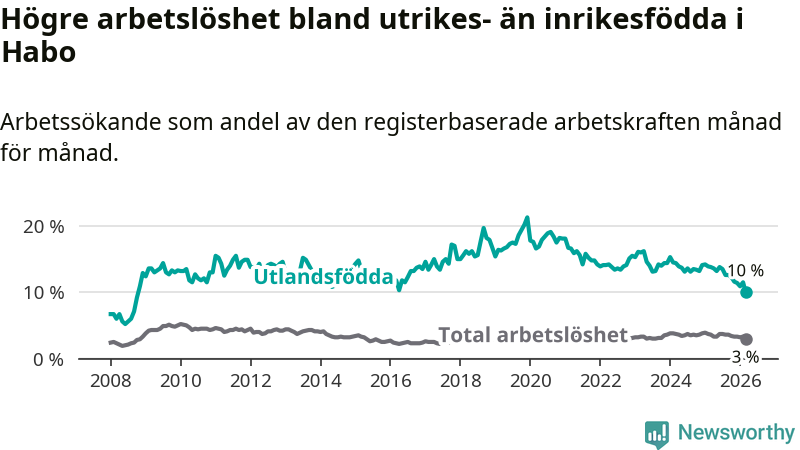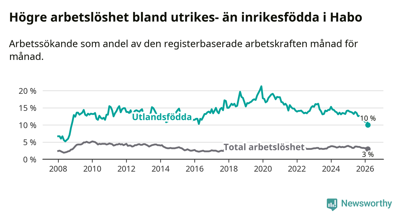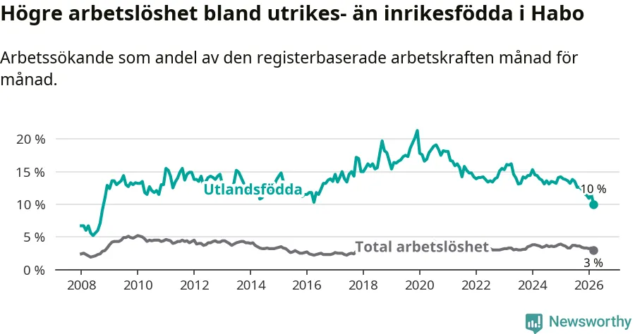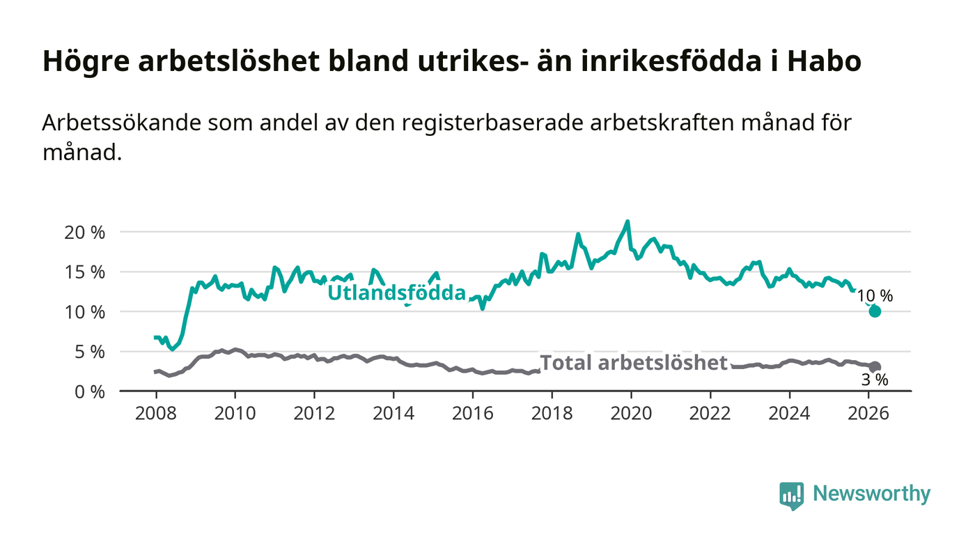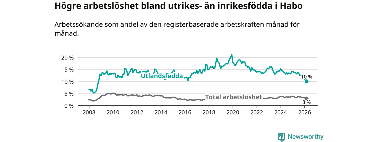 Arbetslösheten bland utlandsfödda var 10,0 procent i Habo under mars månad, motsvarande 68 av 680 personer. Det är 3,8 procentenheter färre än vid samma tidpunkt i fjol (−25 om man räknar personer). Därmed är de utlandsföddas arbetslöshet lägre än vid samma tidpunkt i fjol för nionde månaden i följd. Sedan juni 2025 har arbetslösheten bland utlandsfödda minskat från 13,8 till 10,0 procent. Den nuvarande arbetslöshetsnivån är den lägsta sedan oktober 2008.