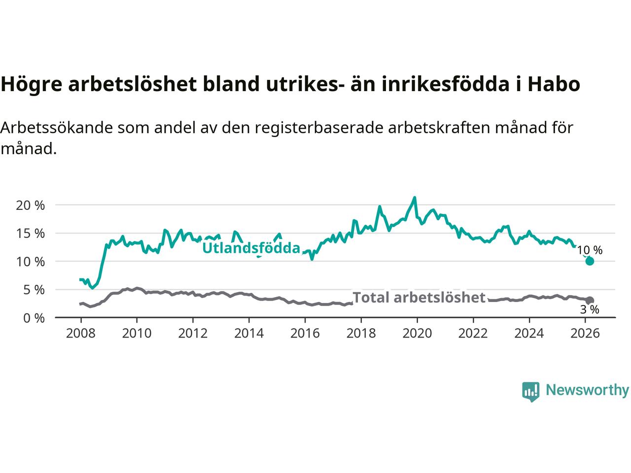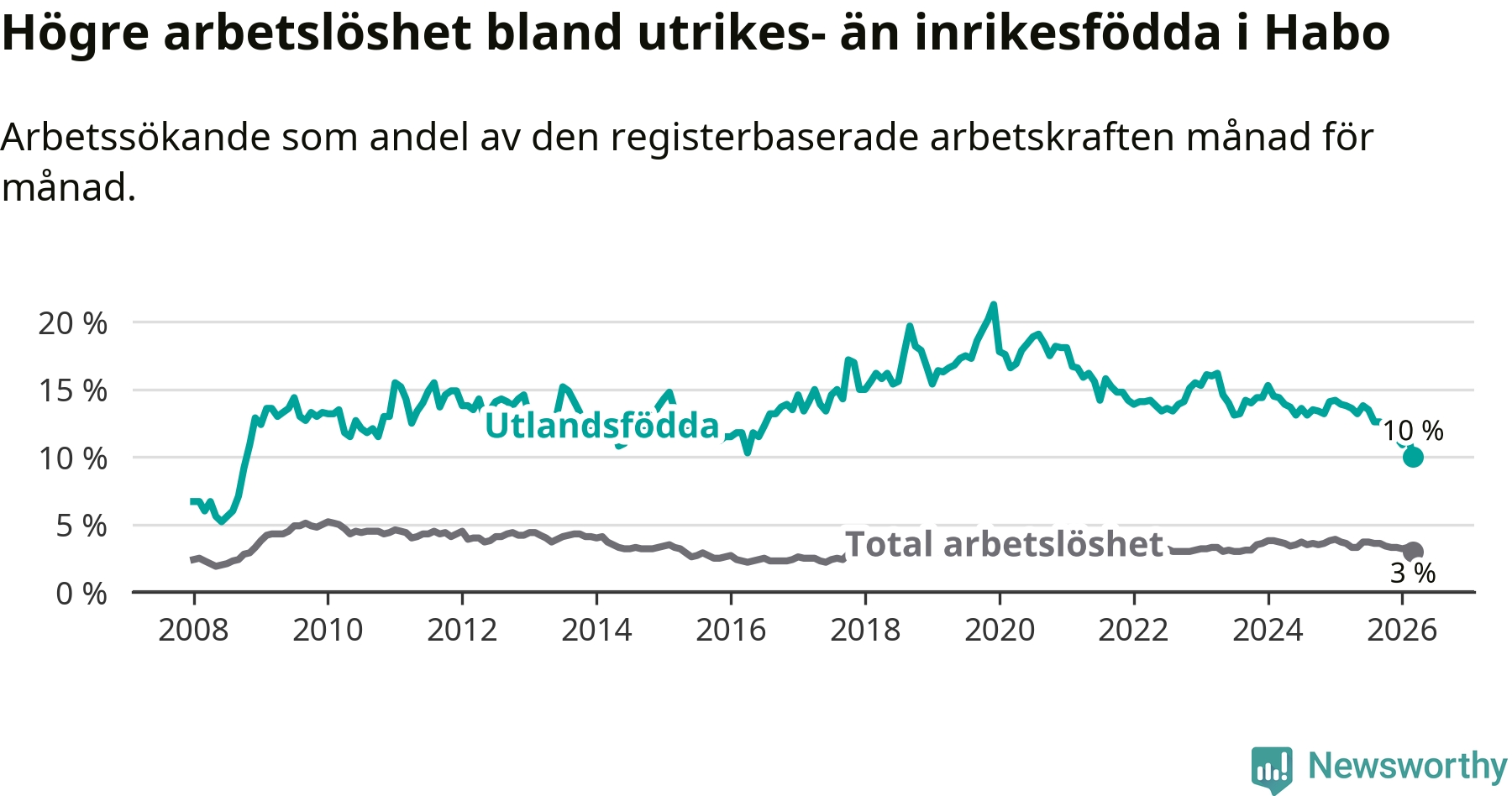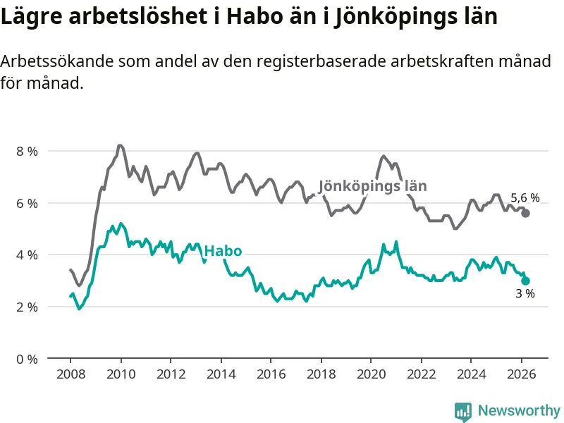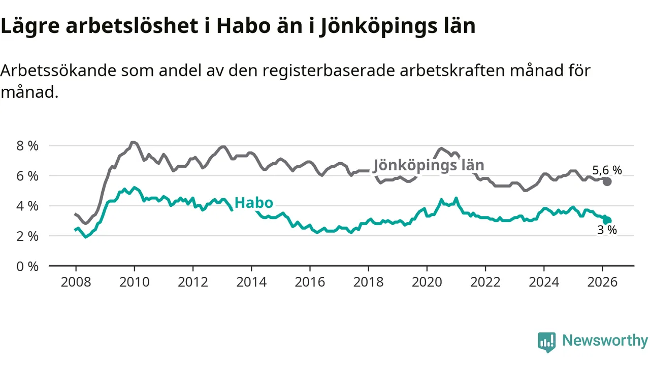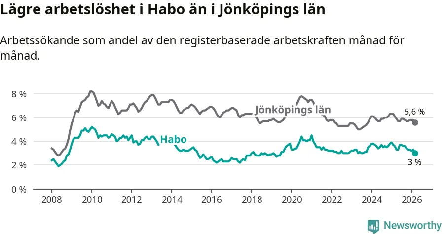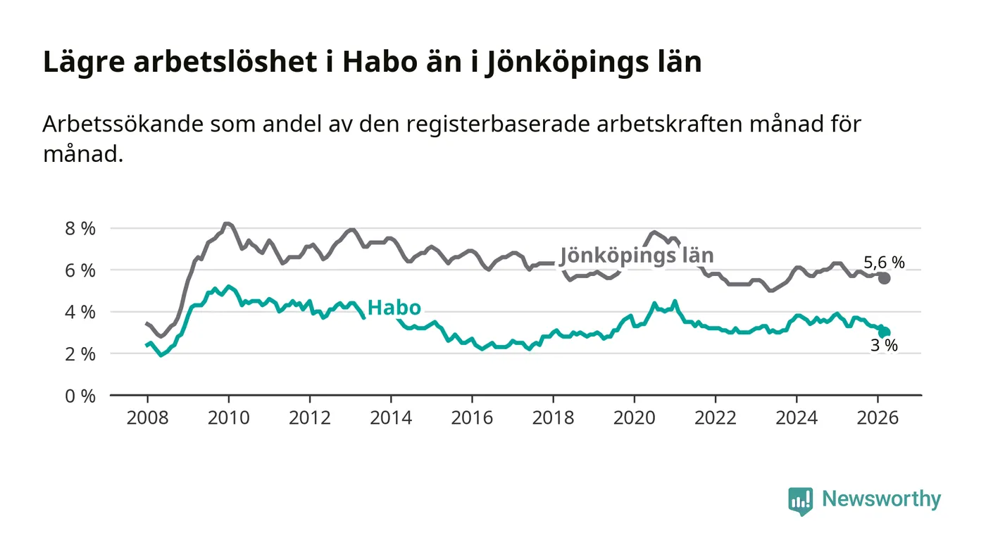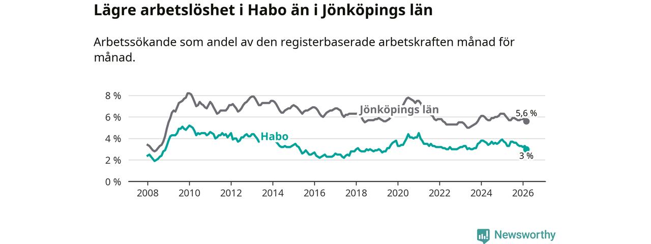 Arbetslösheten bland utlandsfödda var 10,0 procent i Habo under mars månad, motsvarande 68 av 680 personer. Det är 3,8 procentenheter färre än vid samma tidpunkt i fjol (−25 om man räknar personer). Därmed är de utlandsföddas arbetslöshet lägre än vid samma tidpunkt i fjol för nionde månaden i följd. Sedan juni 2025 har arbetslösheten bland utlandsfödda minskat från 13,8 till 10,0 procent. Den nuvarande arbetslöshetsnivån är den lägsta sedan oktober 2008.