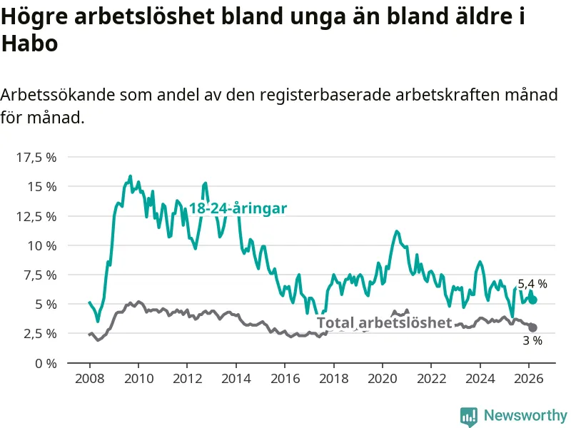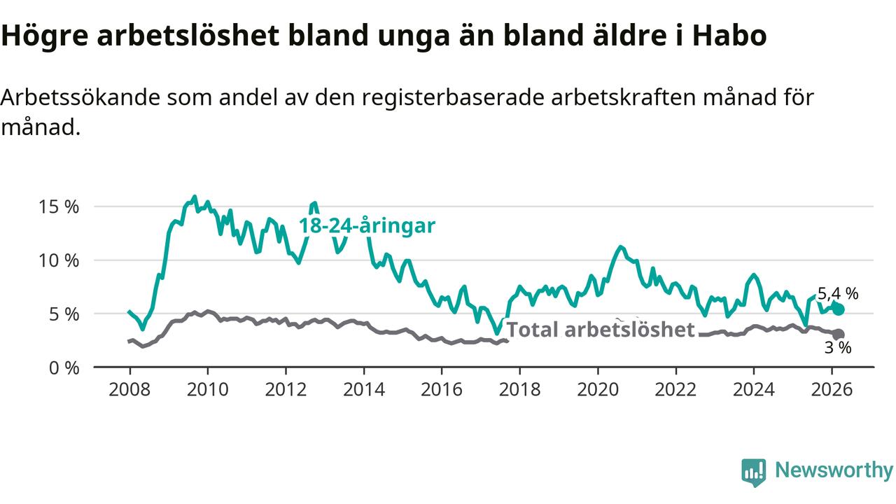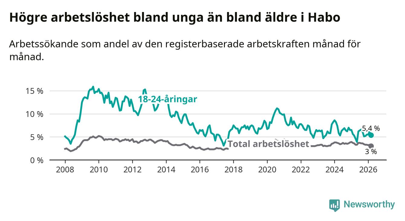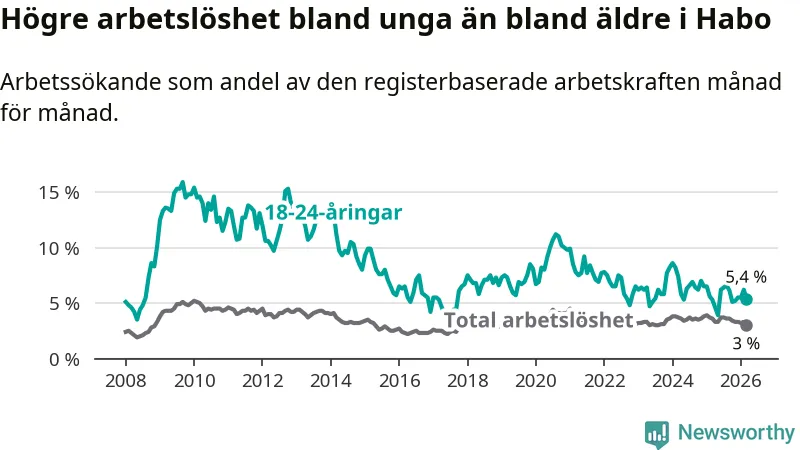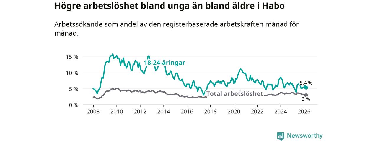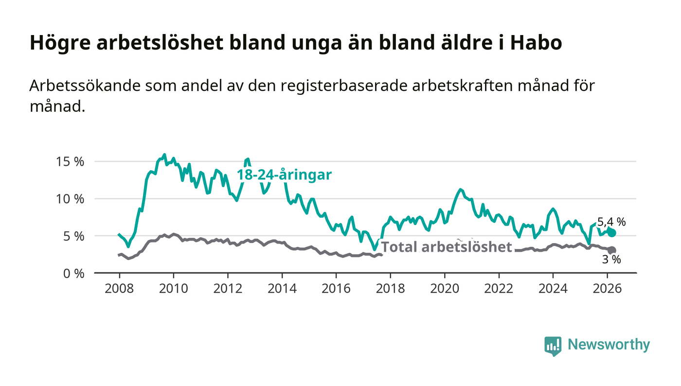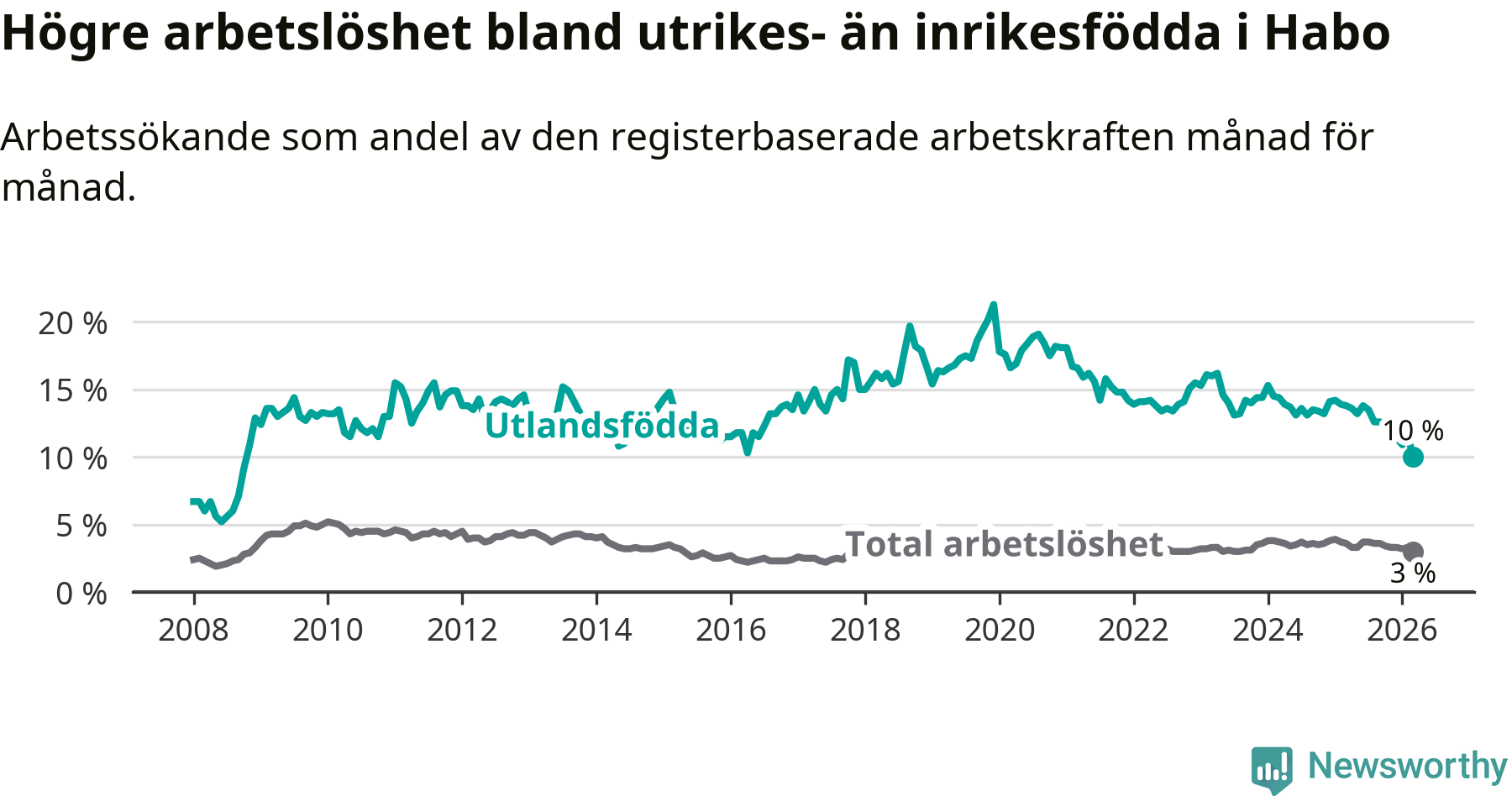 Arbetslösheten bland utlandsfödda var 10,0 procent i Habo under mars månad, motsvarande 68 av 680 personer. Det är 3,8 procentenheter färre än vid samma tidpunkt i fjol (−25 om man räknar personer). Därmed är de utlandsföddas arbetslöshet lägre än vid samma tidpunkt i fjol för nionde månaden i följd. Sedan juni 2025 har arbetslösheten bland utlandsfödda minskat från 13,8 till 10,0 procent. Den nuvarande arbetslöshetsnivån är den lägsta sedan oktober 2008.