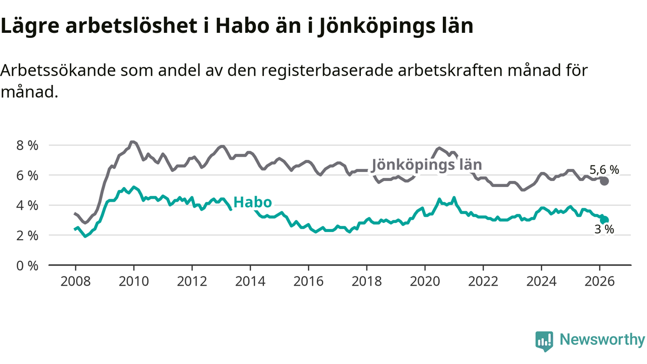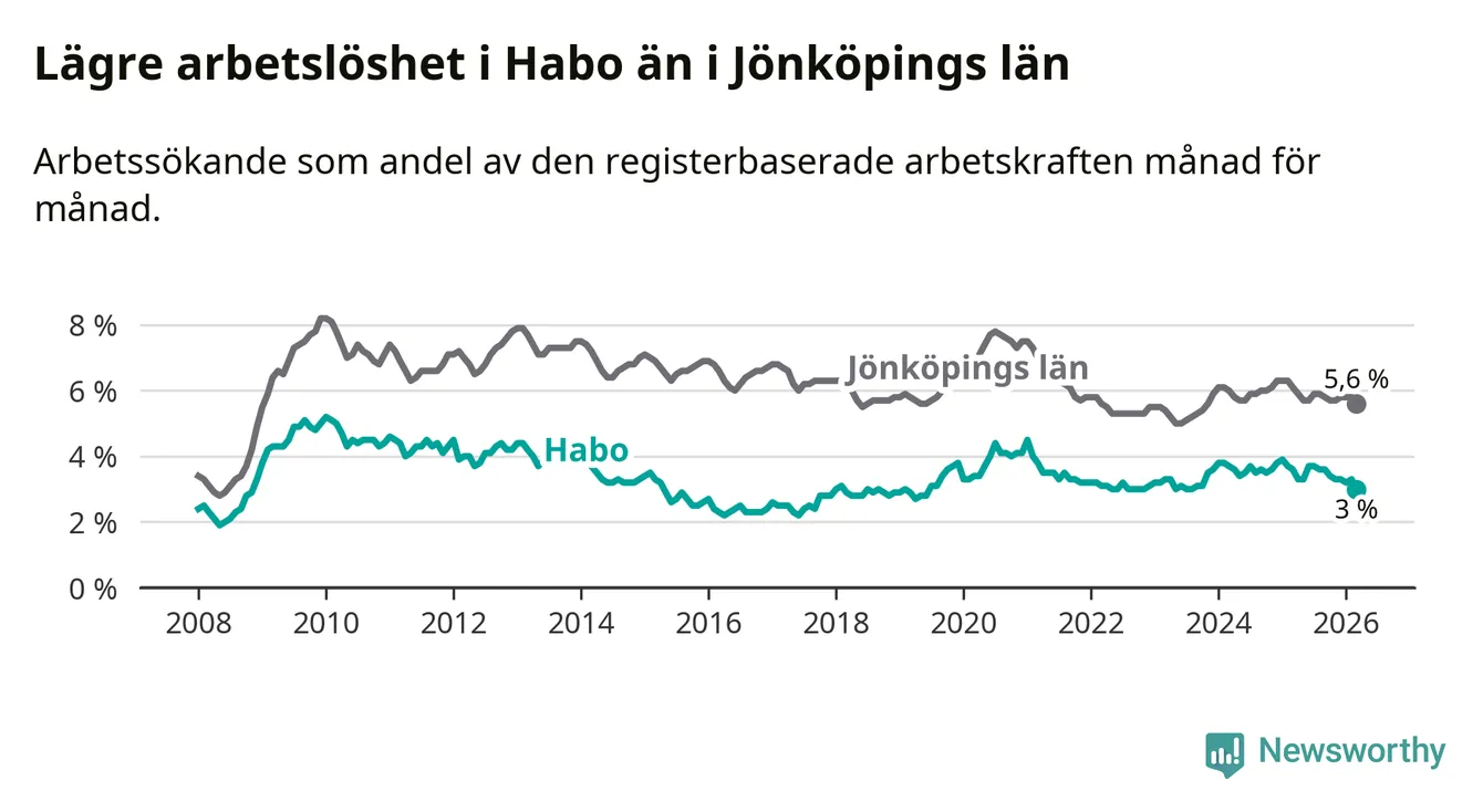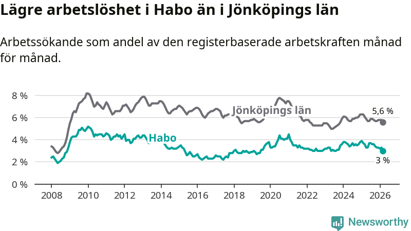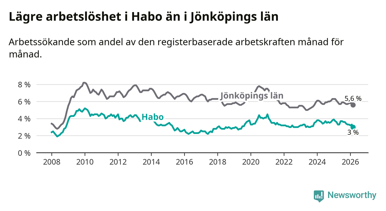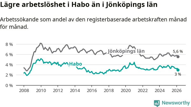 Habo hade redan tidigare lägre arbetslöshet än snittet i hela Jönköpings län och nu växer klyftan (3,0 procent i kommunen, jämfört med 5,6 procent i hela länet). Habo har därmed även den lägsta arbetslöshetsnivån i länet. Nässjö har den högsta (7,3 procent).