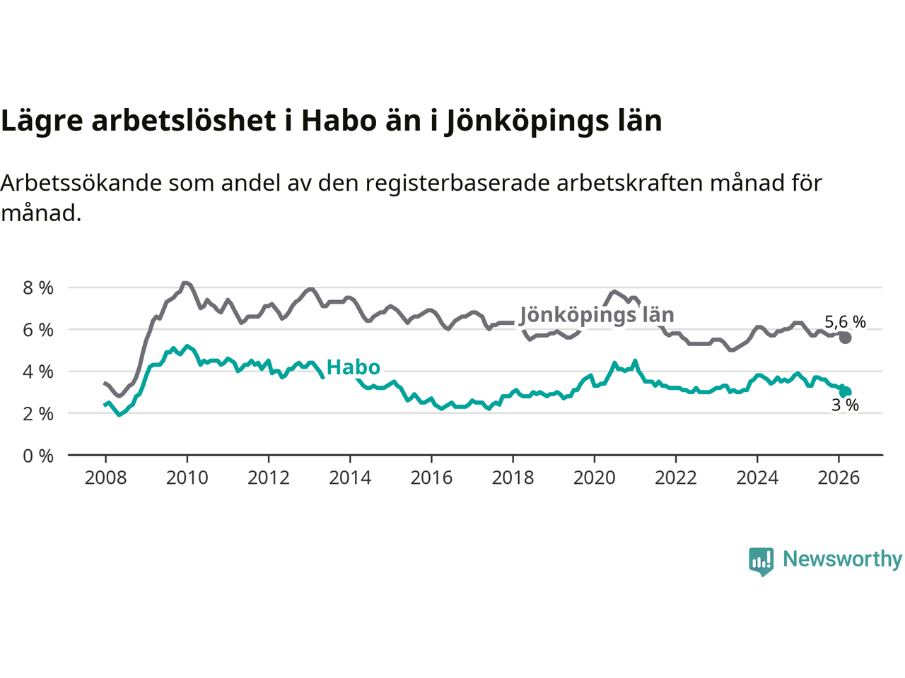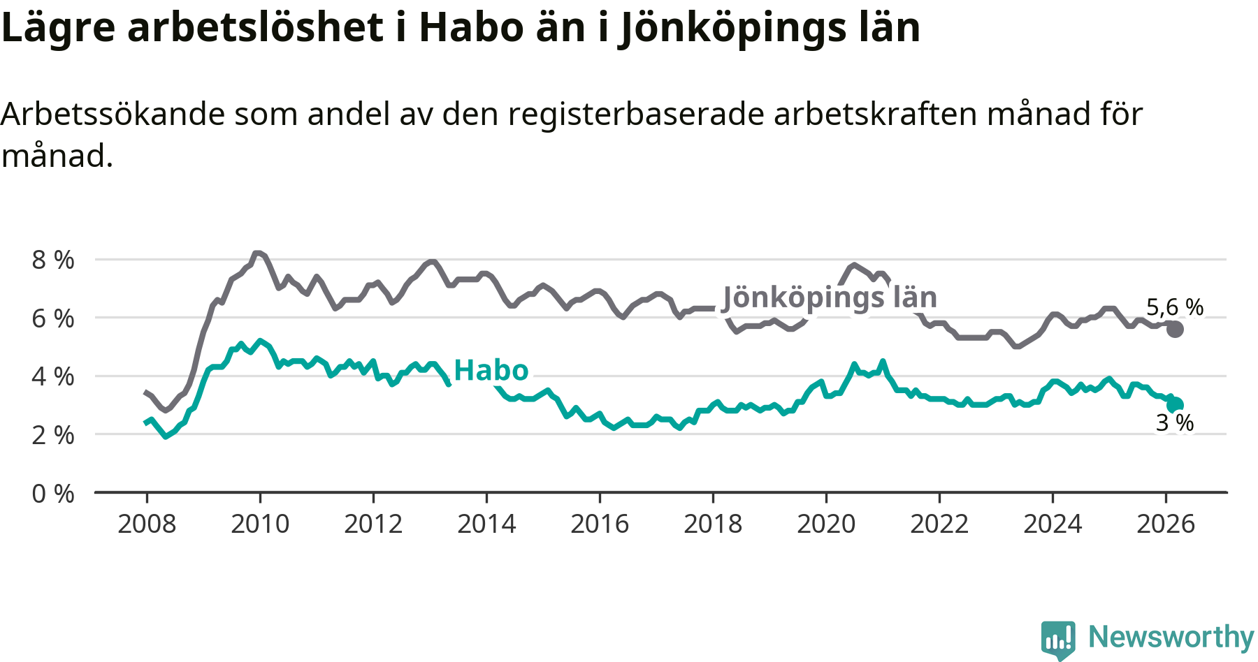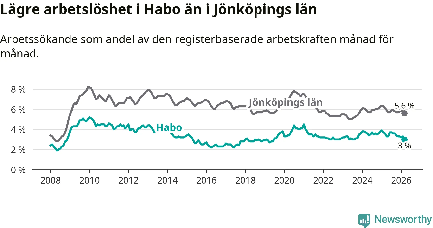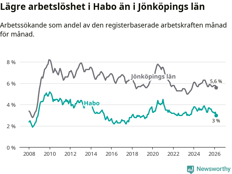 Habo hade redan tidigare lägre arbetslöshet än snittet i hela Jönköpings län och nu växer klyftan (3,0 procent i kommunen, jämfört med 5,6 procent i hela länet). Habo har därmed även den lägsta arbetslöshetsnivån i länet. Nässjö har den högsta (7,3 procent).