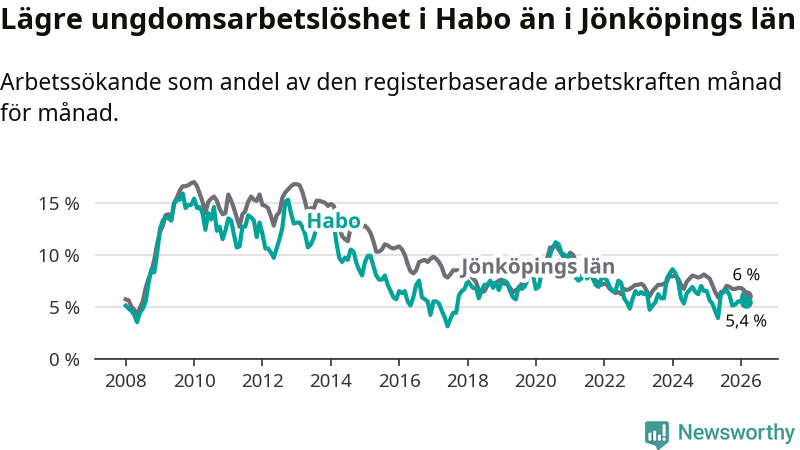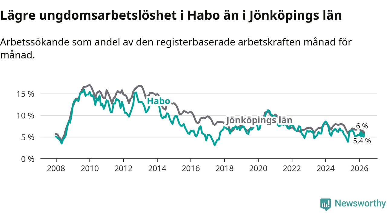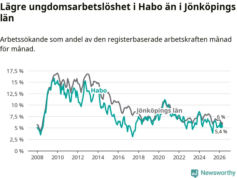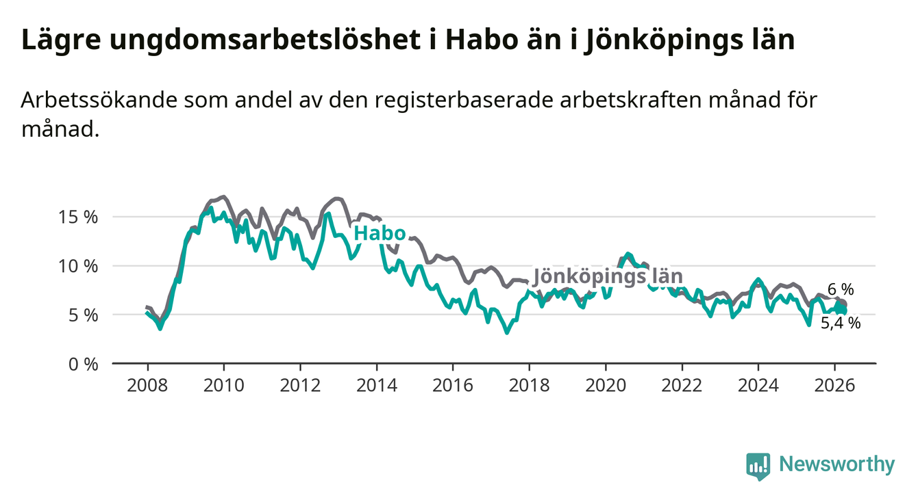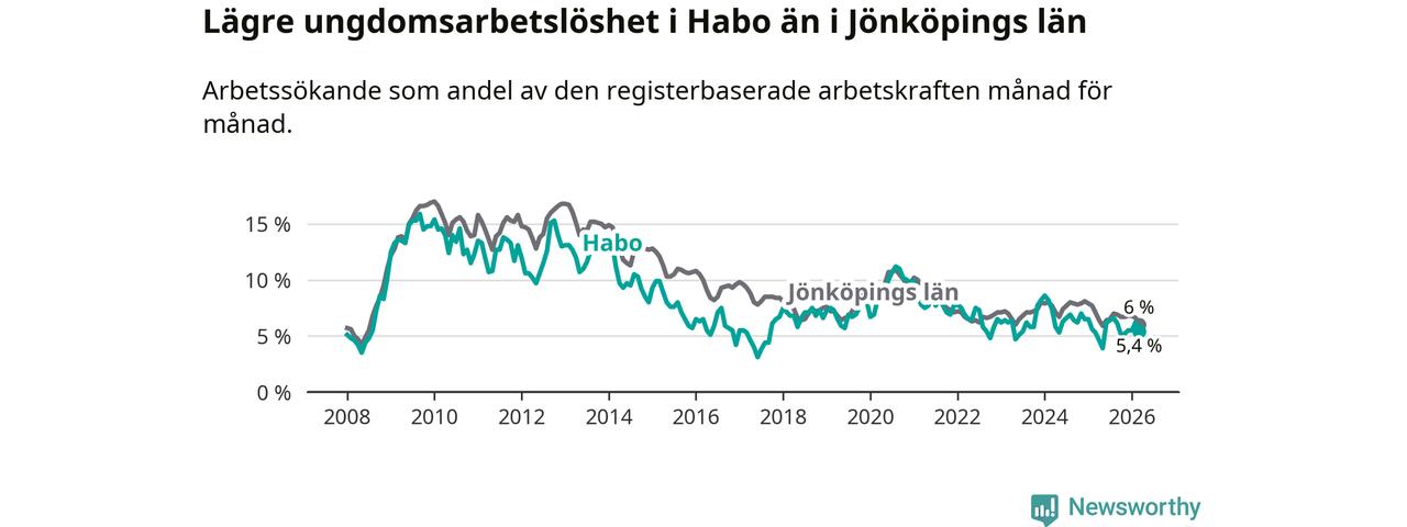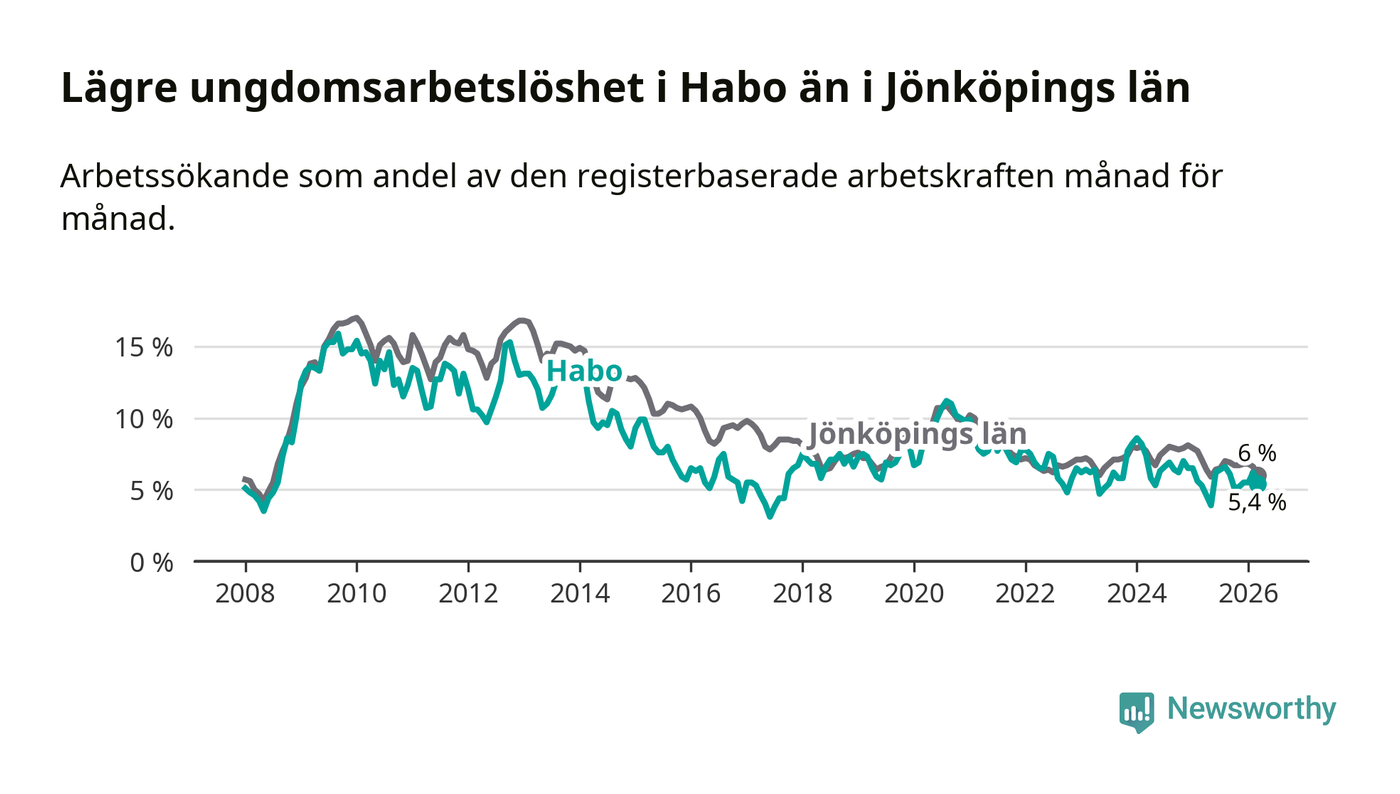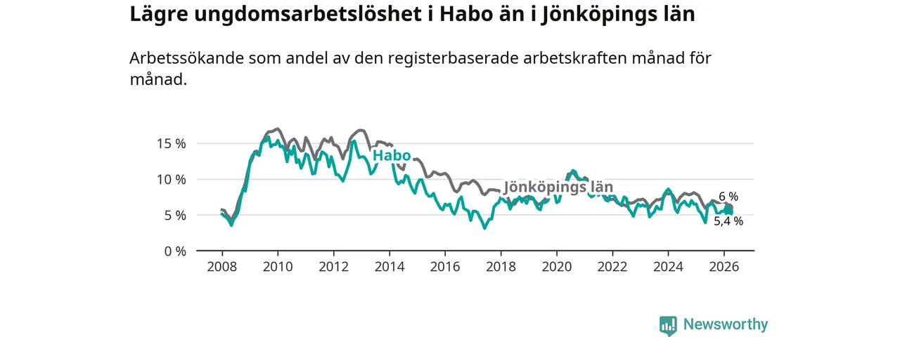 Precis som den totala arbetslösheten ligger ungdomsarbetslösheten i Habo lägre än i Jönköpings län som helhet. Skillnaden mellan kommunen och länet är 0,6 procentenheter.