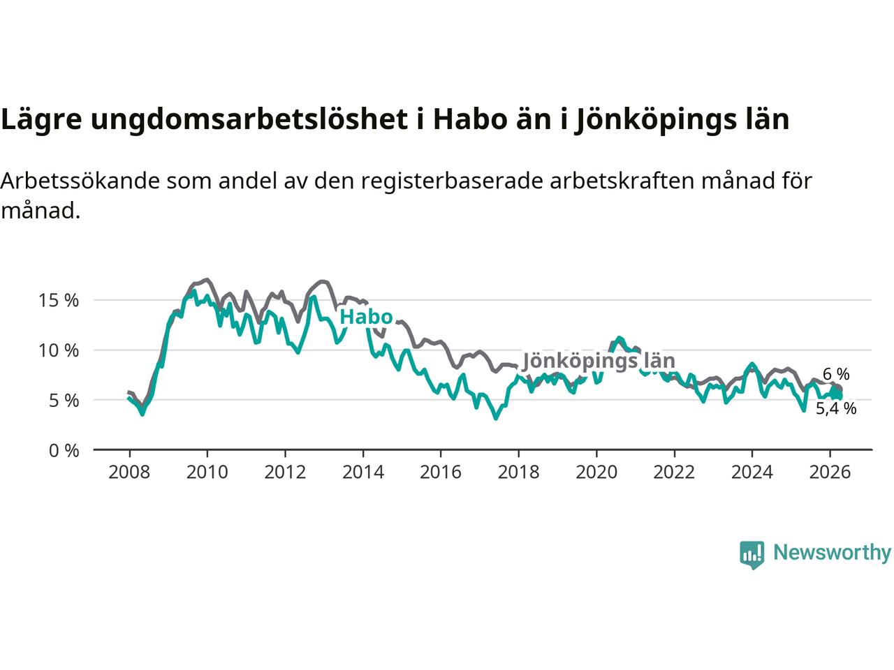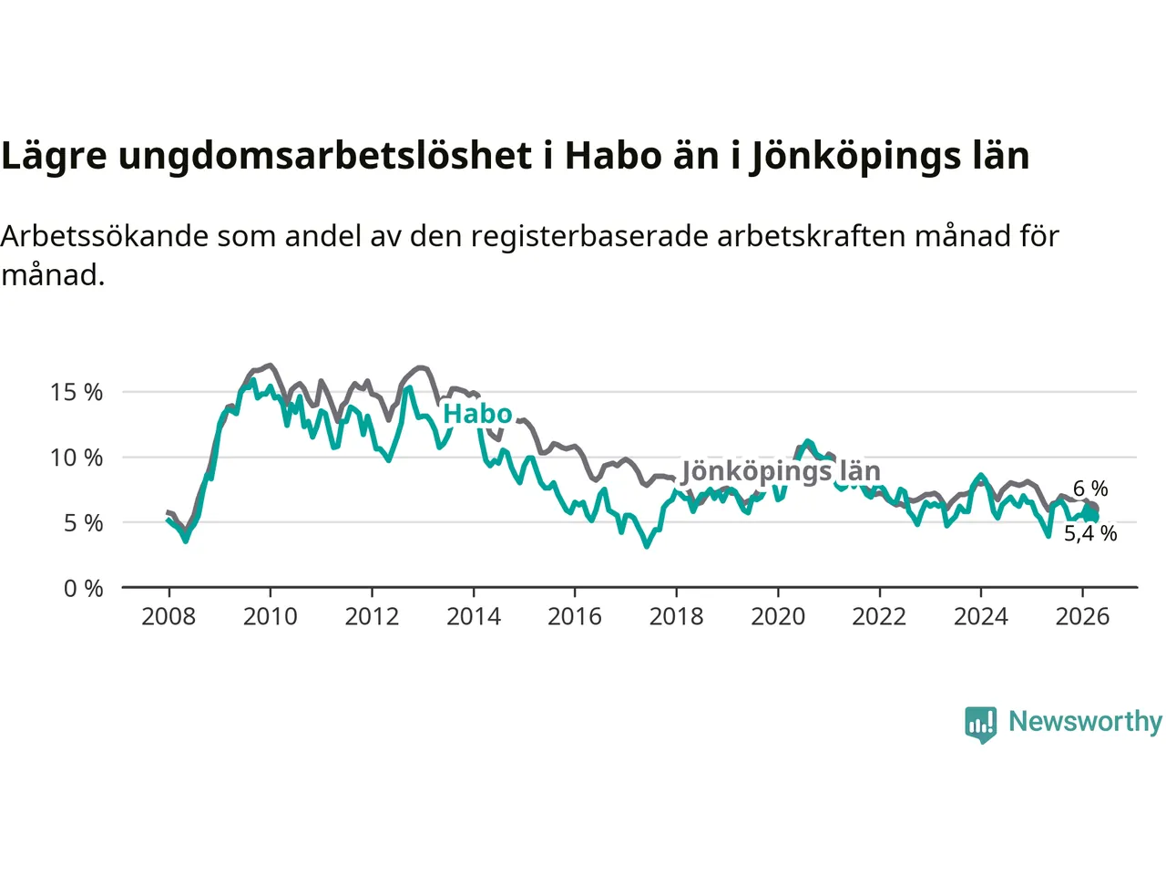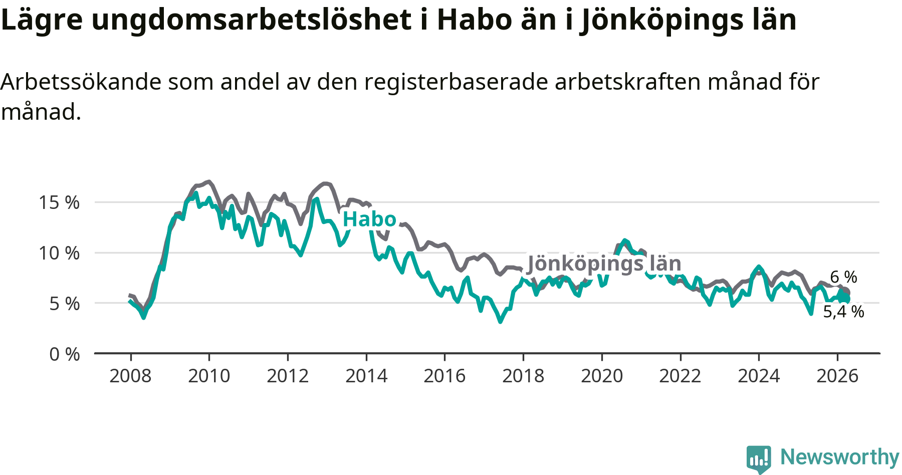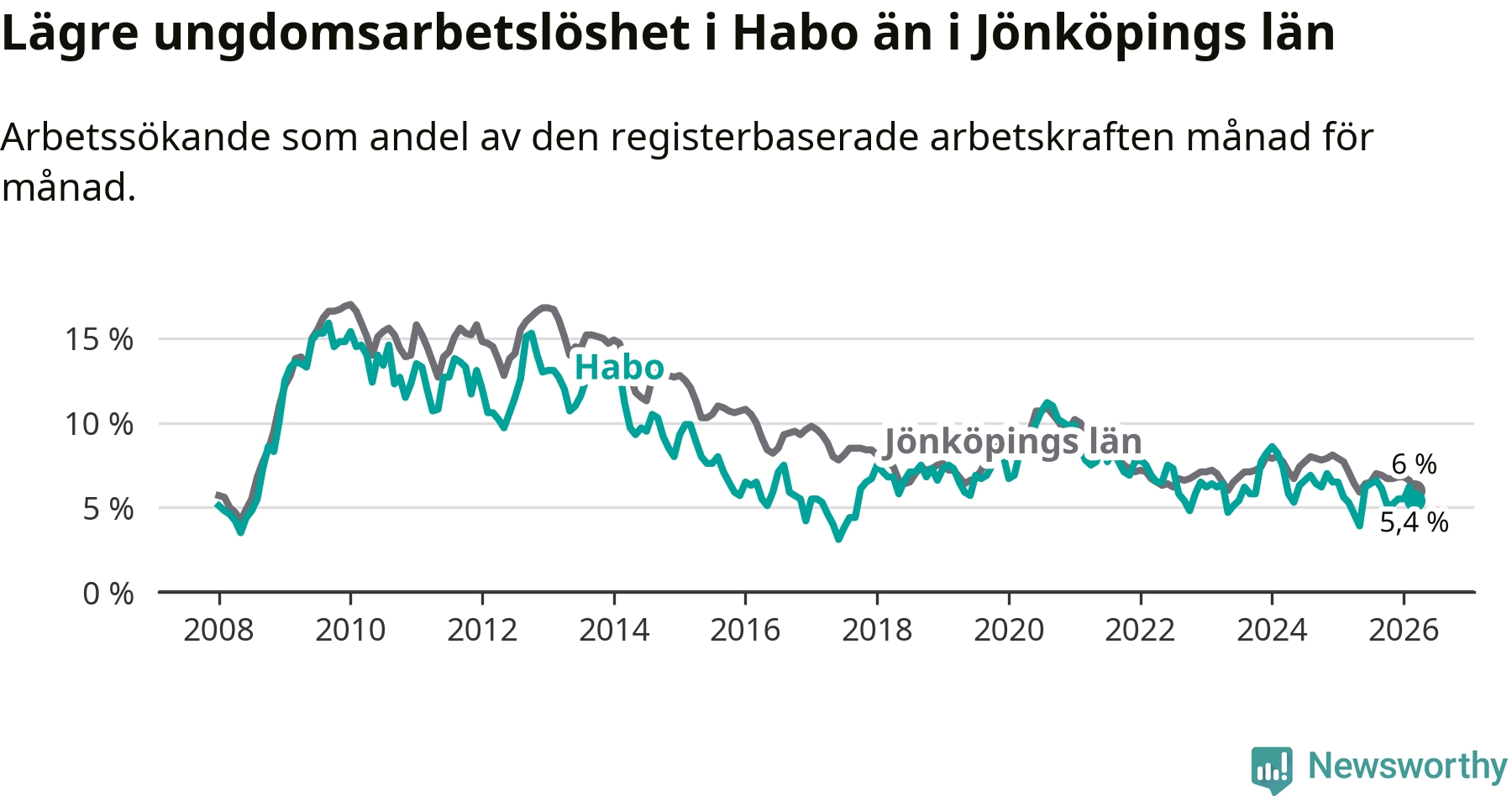 Precis som den totala arbetslösheten ligger ungdomsarbetslösheten i Habo lägre än i Jönköpings län som helhet. Skillnaden mellan kommunen och länet är 0,6 procentenheter.