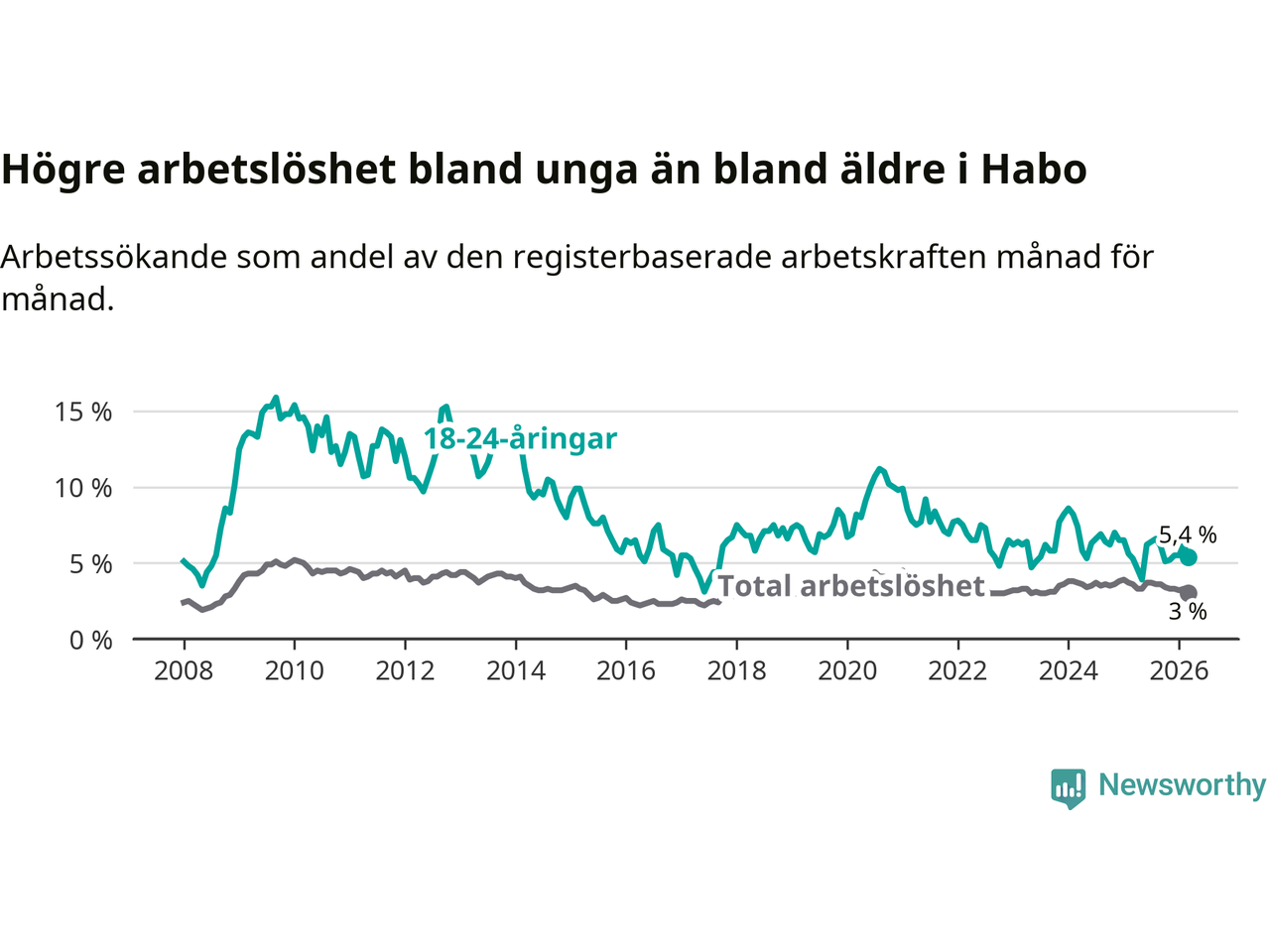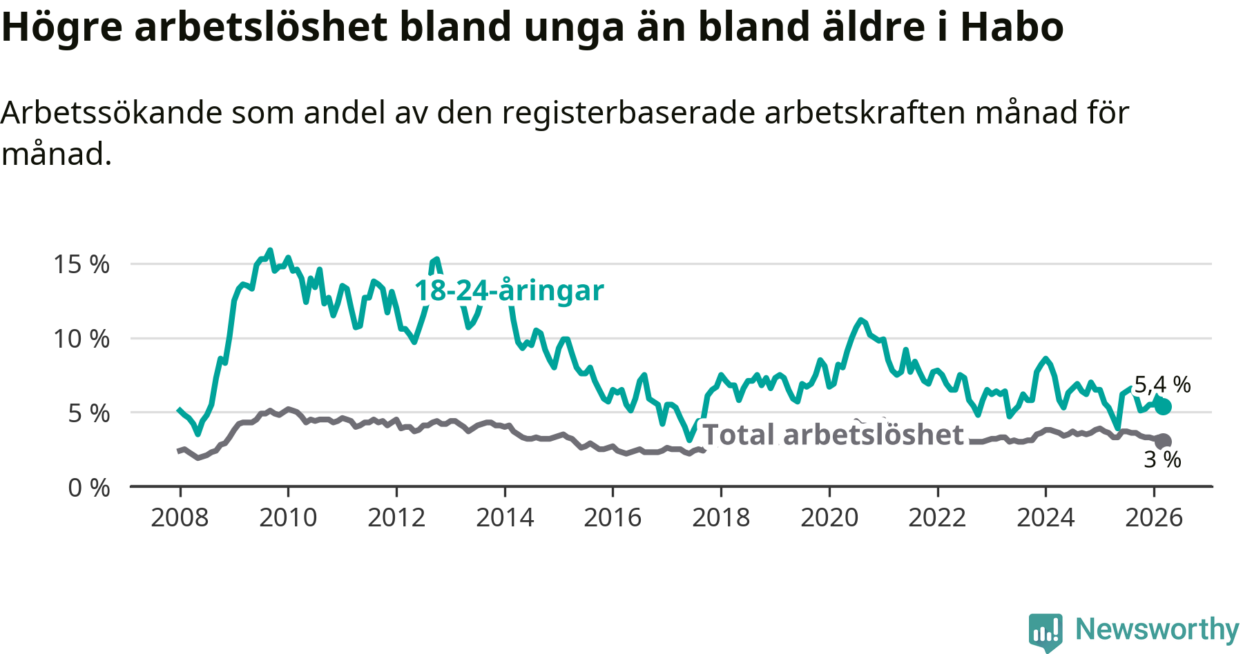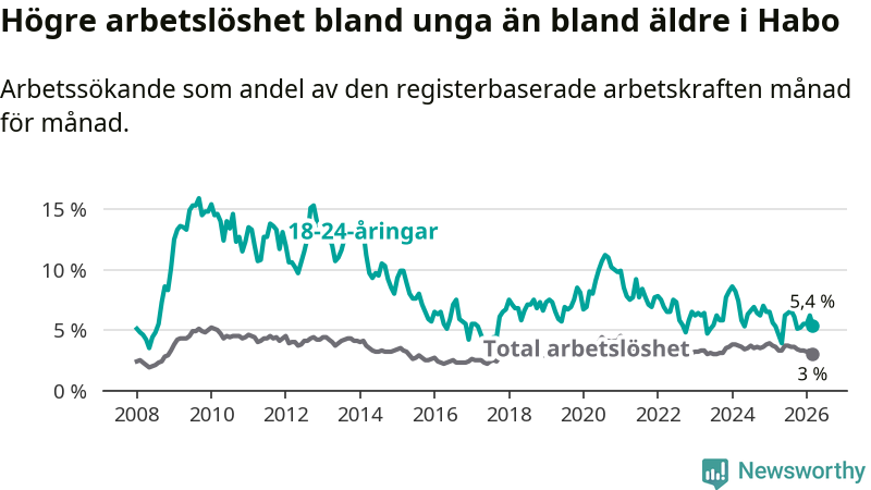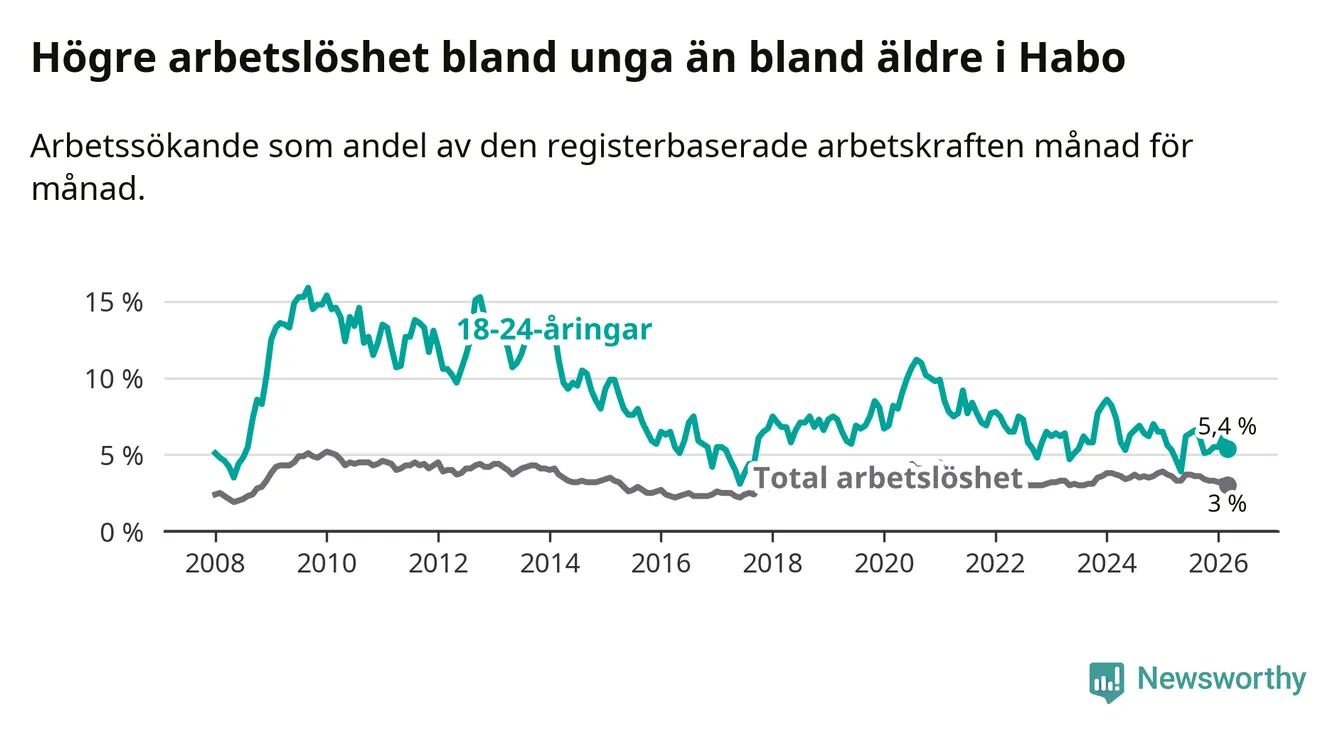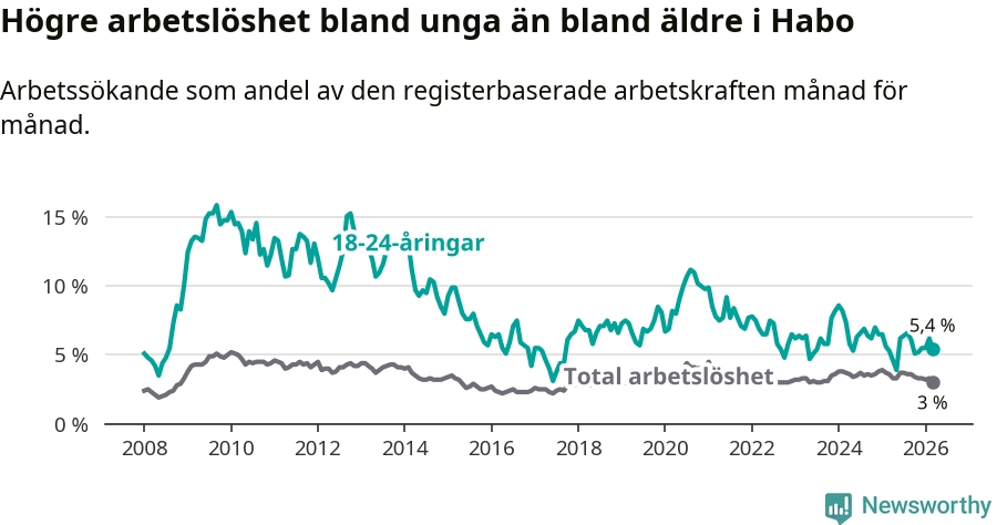 Till skillnad från den totala arbetslösheten stiger arbetslösheten bland unga (+0,1 procentenheter). I mars var 5,4 procent av 18–24-åringarna inskrivna som arbetssökande (motsvarande 35 personer). Mäter vi antalet inskrivna ser vi en ökning med tre personer på ett års sikt.