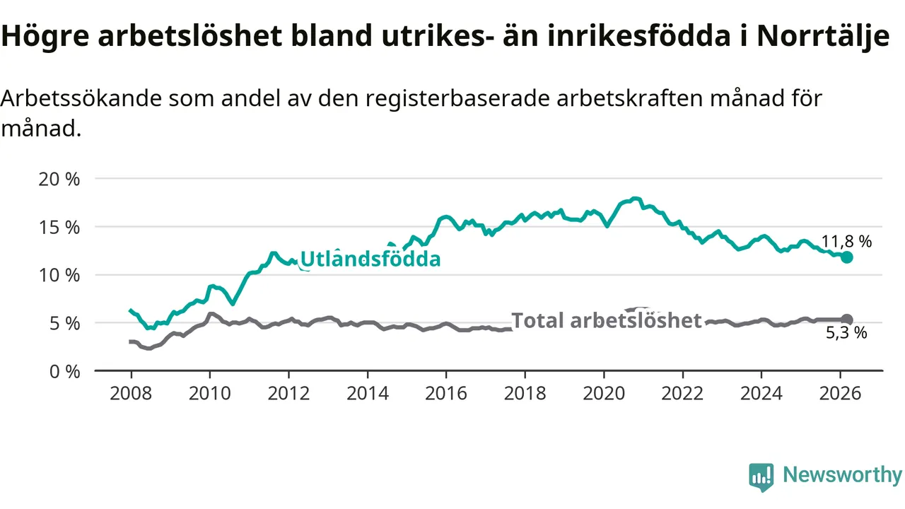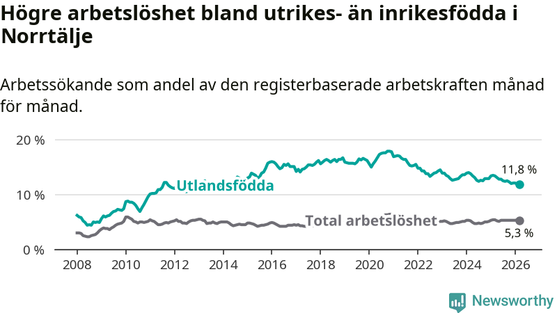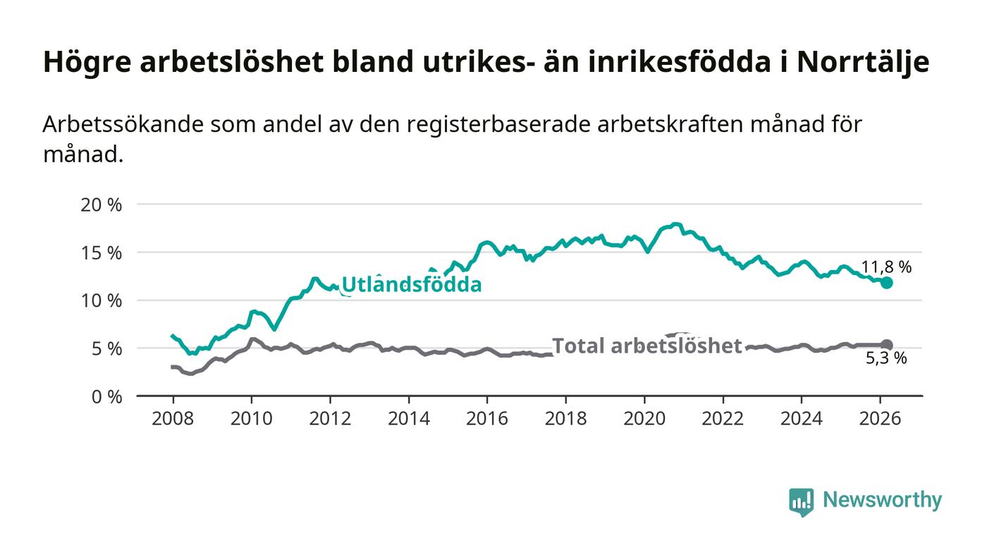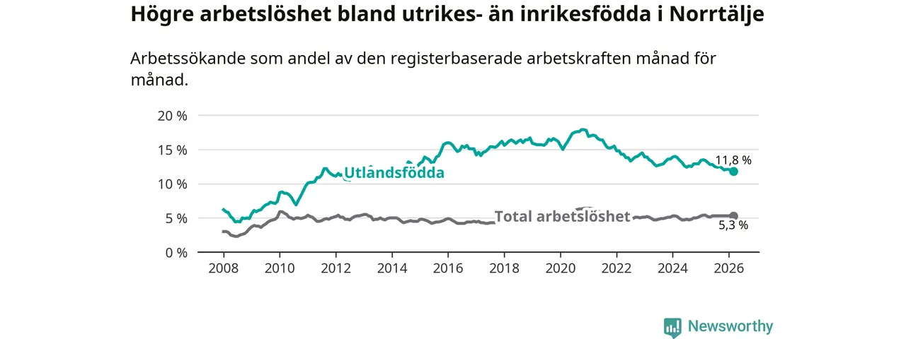 Skillnaden i arbetslöshet mellan utrikesfödda och hela befolkningen är 6,5 procentenheter i Norrtälje. Det är en betydligt mindre skillnad än för ett år sedan (−1,5 procentenheter).