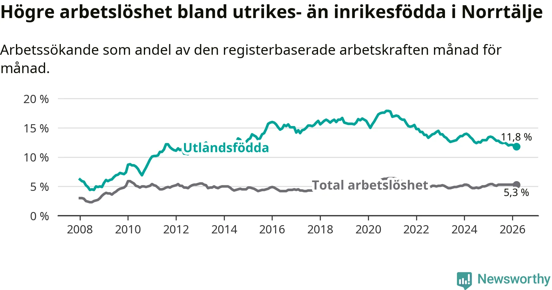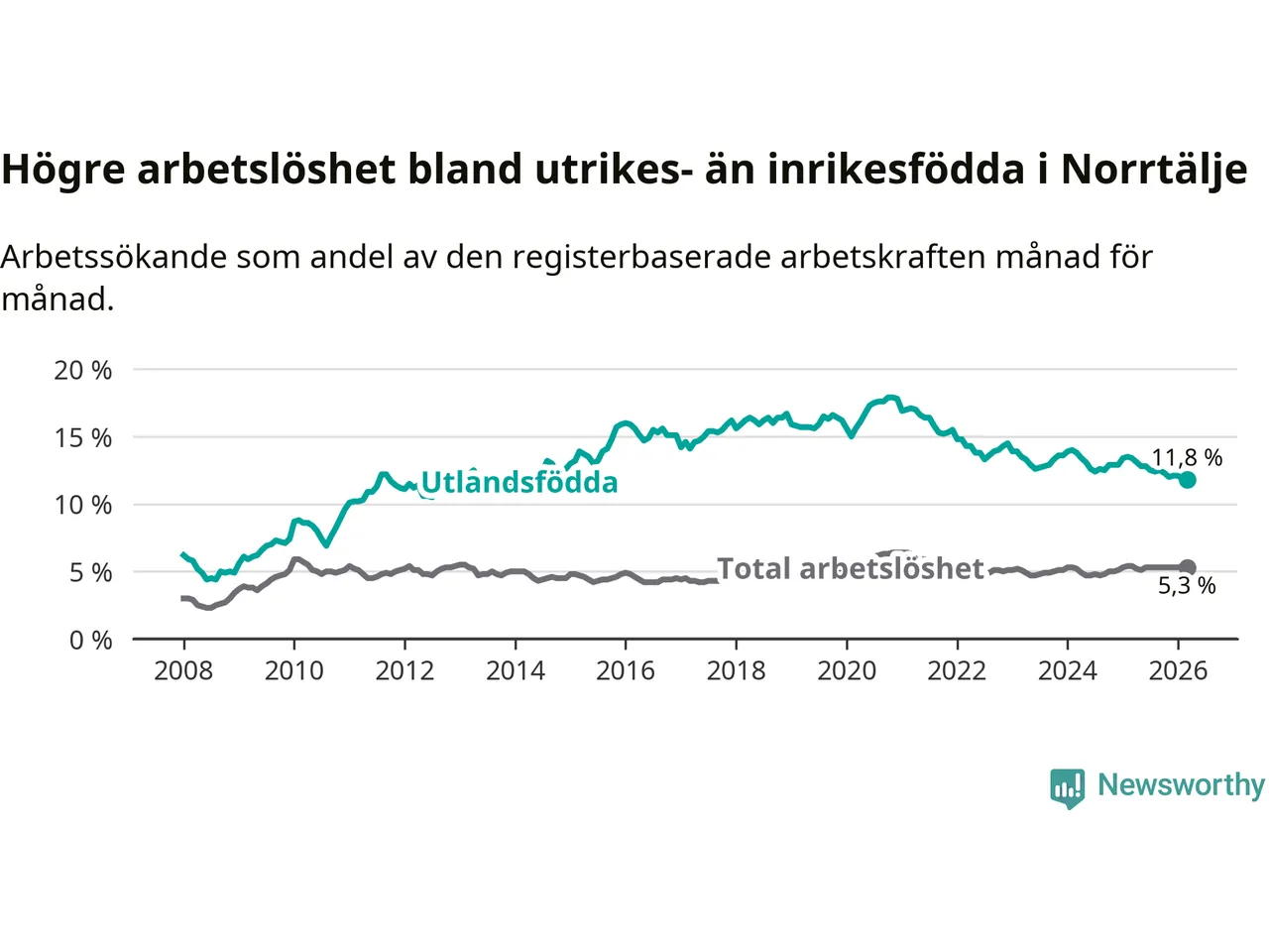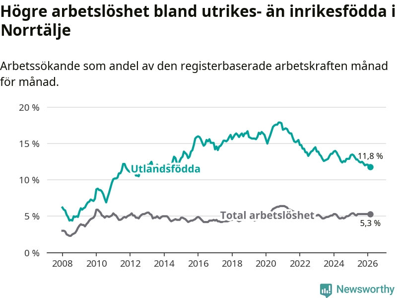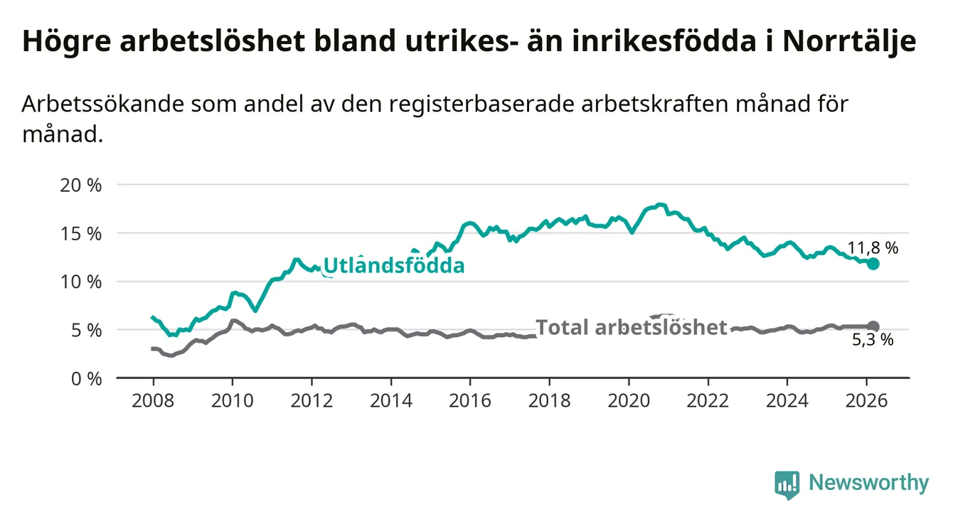 Skillnaden i arbetslöshet mellan utrikesfödda och hela befolkningen är 6,5 procentenheter i Norrtälje. Det är en betydligt mindre skillnad än för ett år sedan (−1,5 procentenheter).