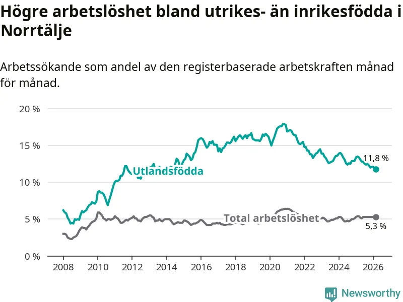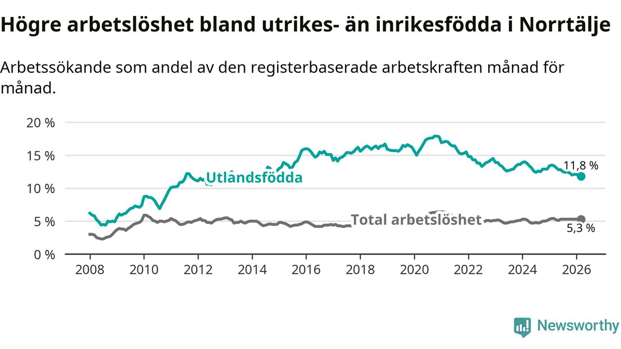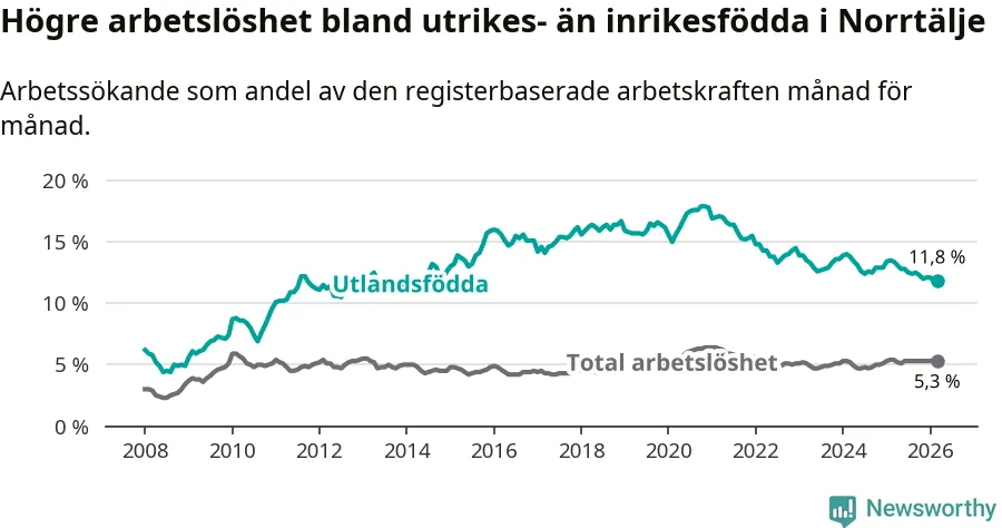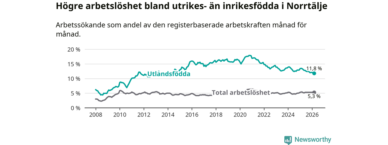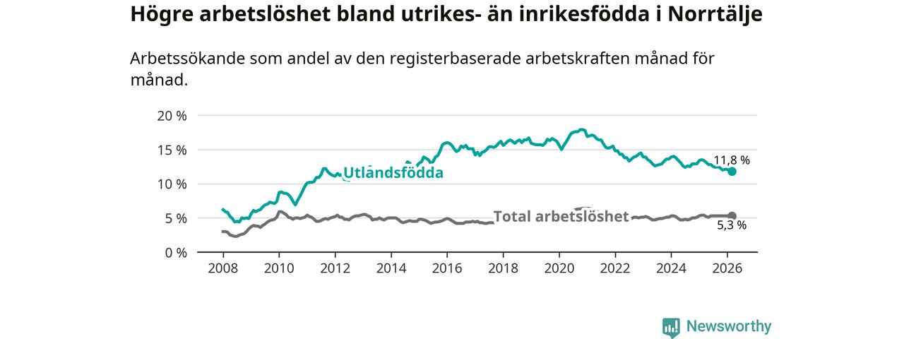 Arbetslösheten bland utlandsfödda var 11,8 procent i Norrtälje under mars månad, motsvarande 597 av 5 059 personer. Det är 1,6 procentenheter färre än vid samma tidpunkt i fjol (−55 om man räknar personer). Därmed är de utlandsföddas arbetslöshet lägre än vid samma tidpunkt i fjol för sjätte månaden i följd.