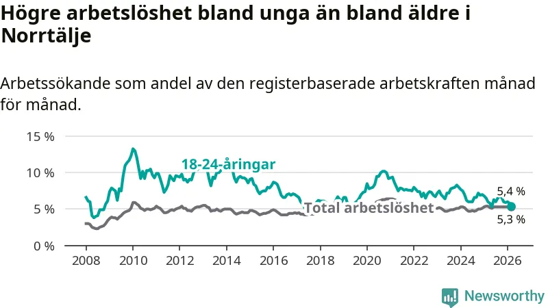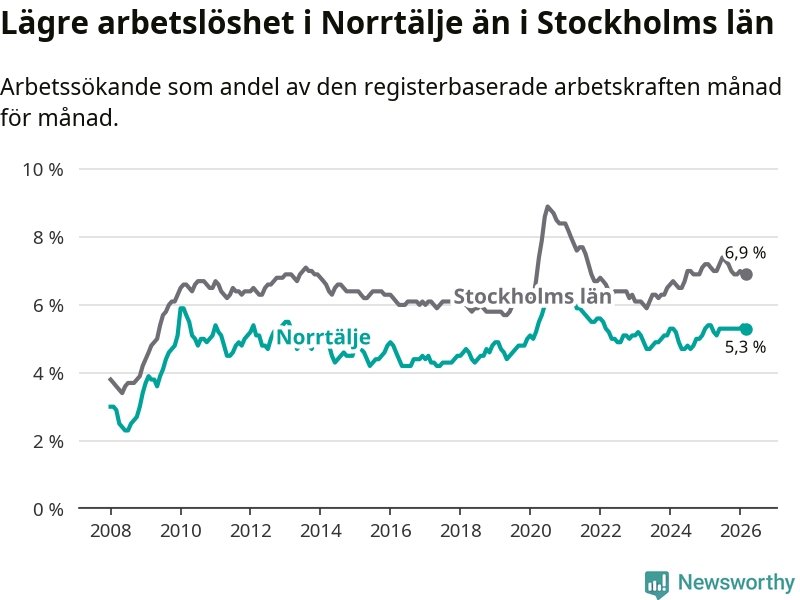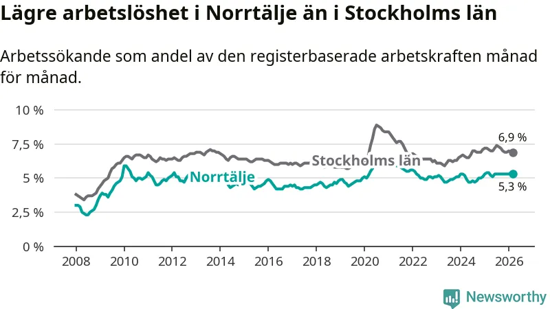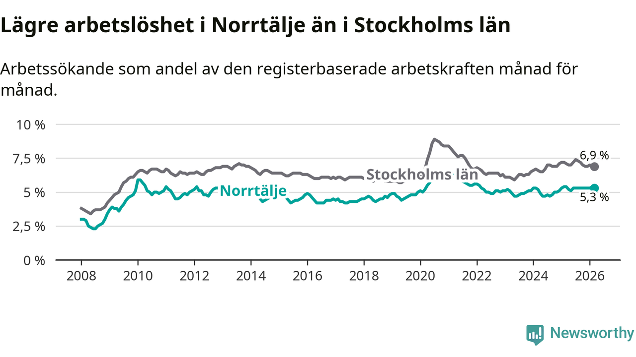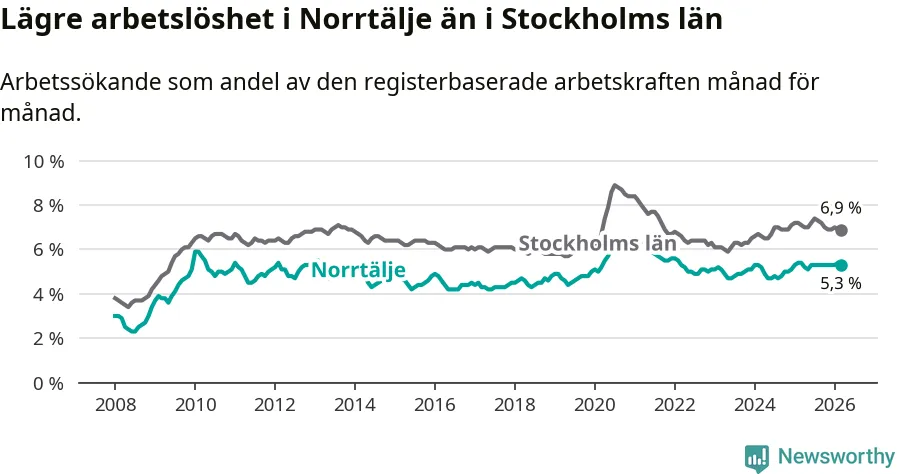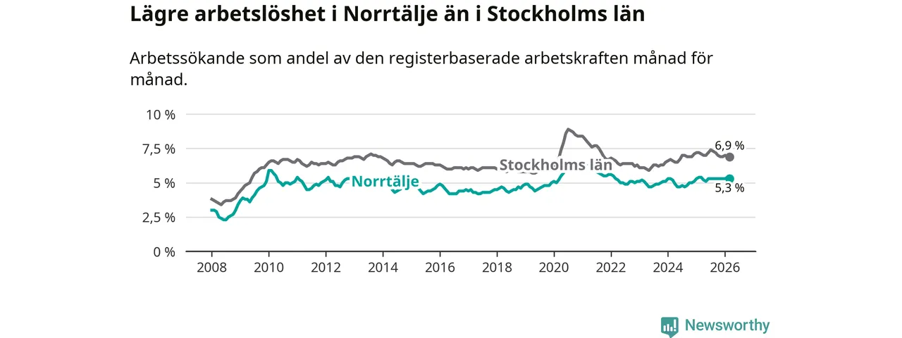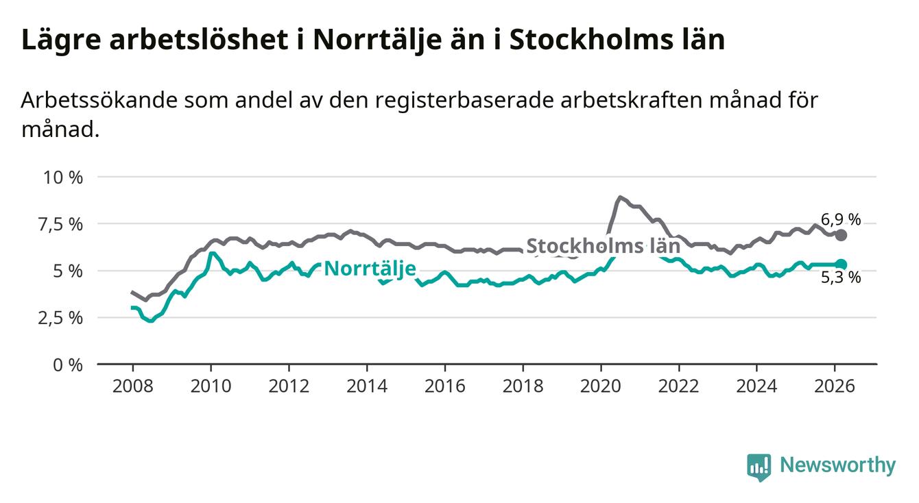 Under mars månad rapporterade Norrtälje kommun en total arbetslöshet på 5,3 procent. Det är en minskning jämfört med samma tidpunkt i fjol (−0,1 procentenheter). Även i Stockholms län sjunker arbetslösheten något.