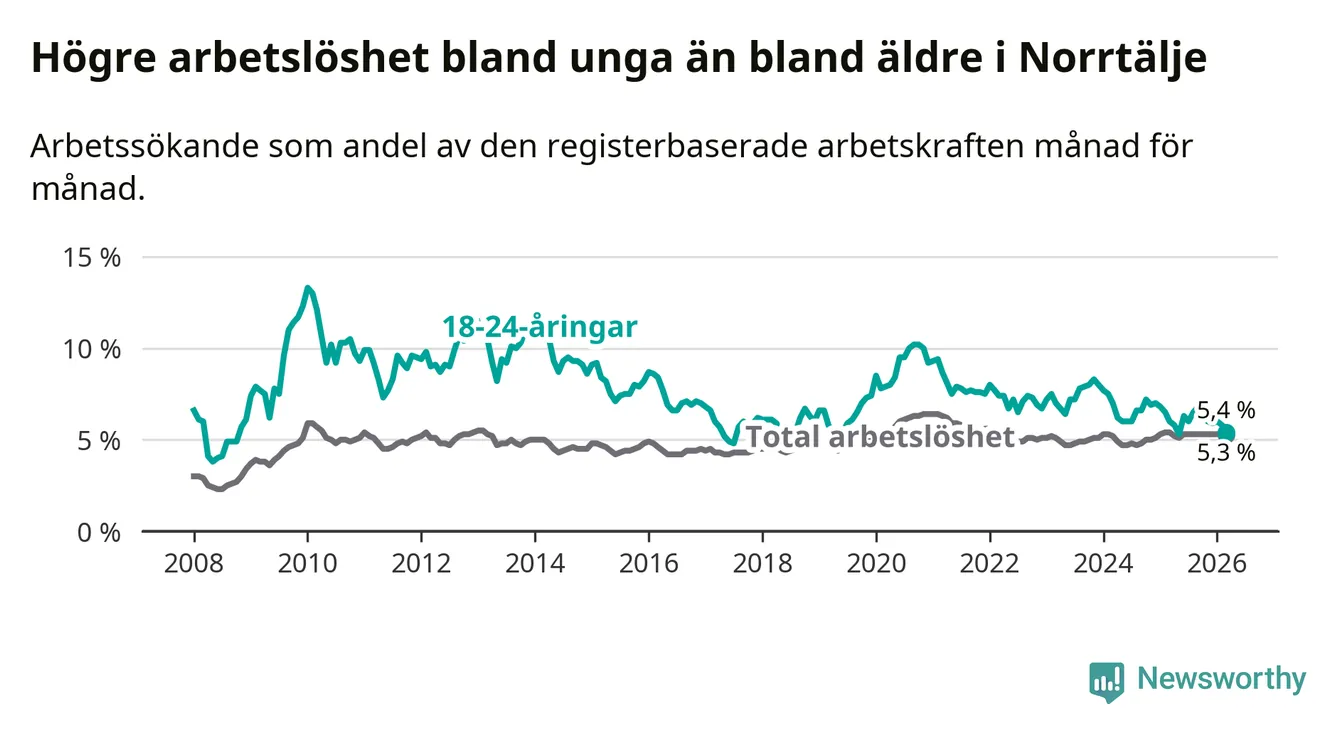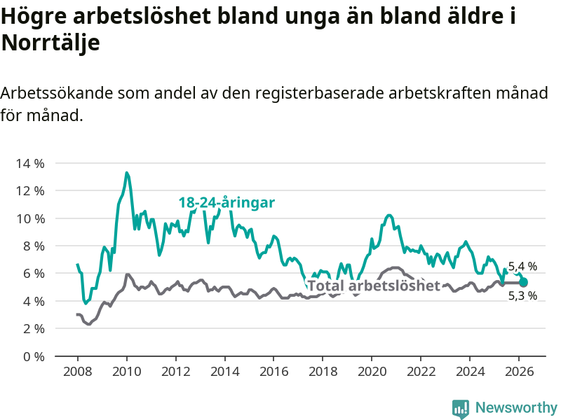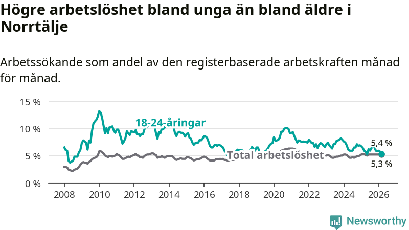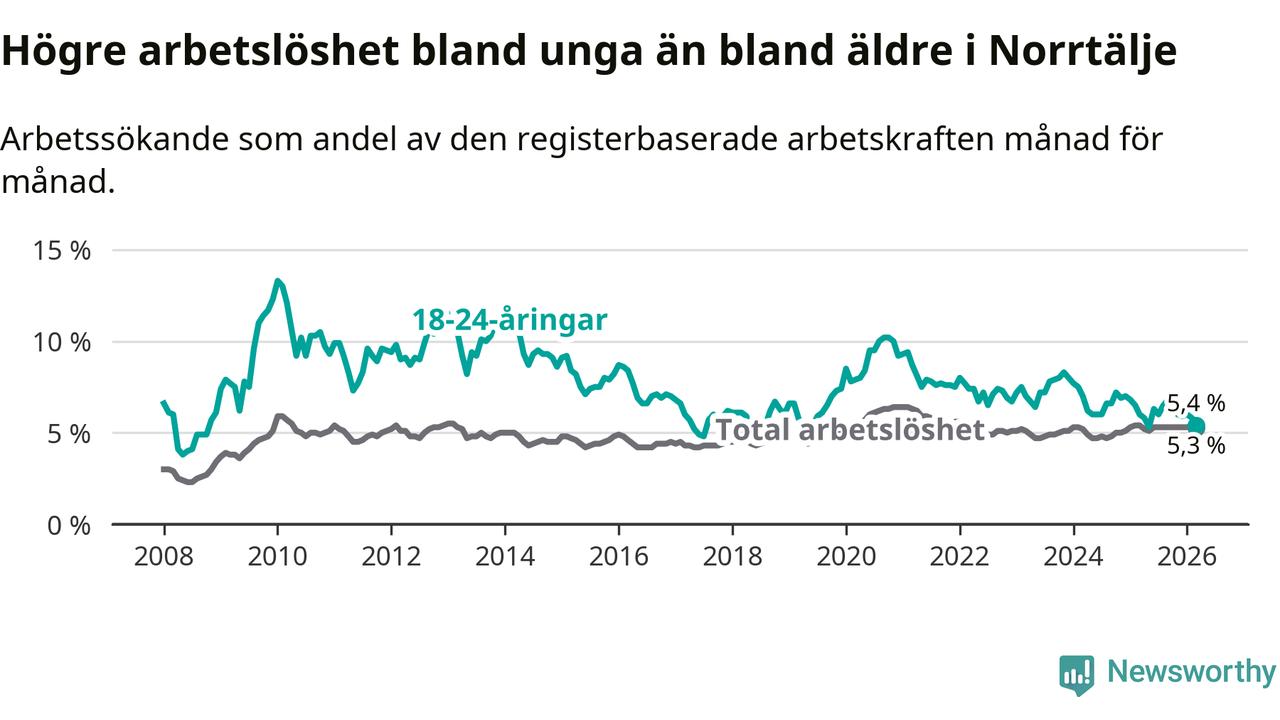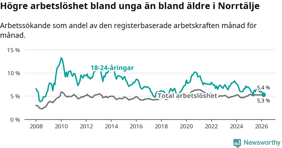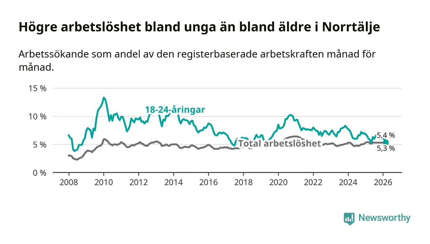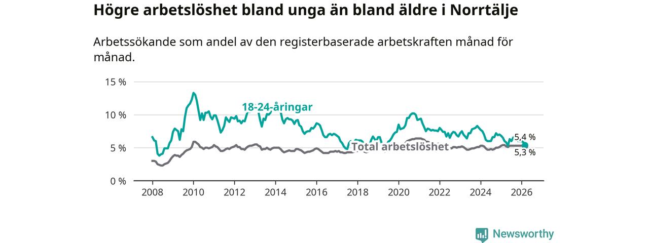 Under mars månad rapporterade Norrtälje kommun en total arbetslöshet på 5,3 procent. Det är en minskning jämfört med samma tidpunkt i fjol (−0,1 procentenheter). Även i Stockholms län sjunker arbetslösheten något.