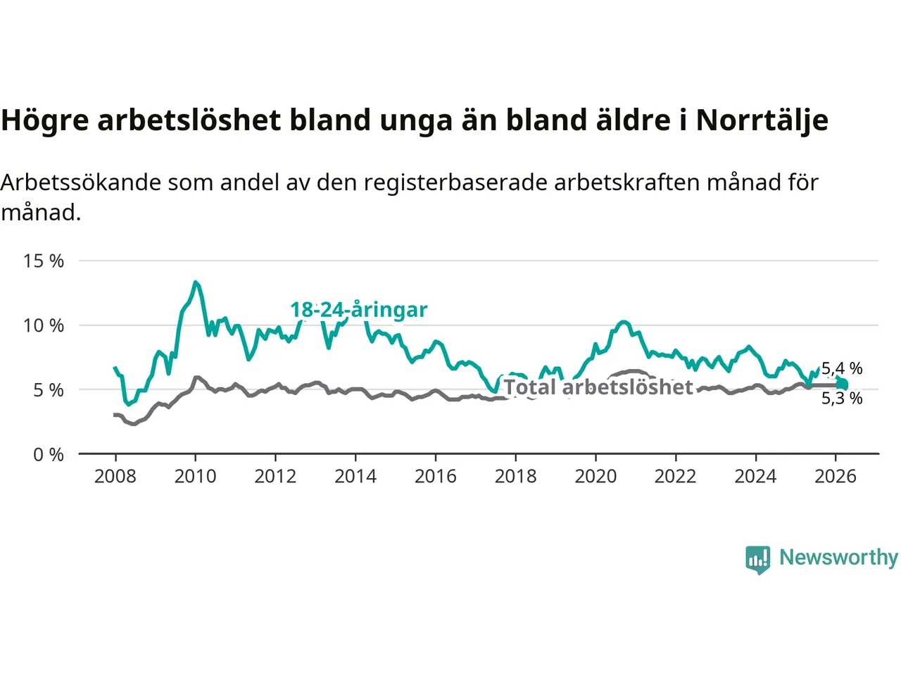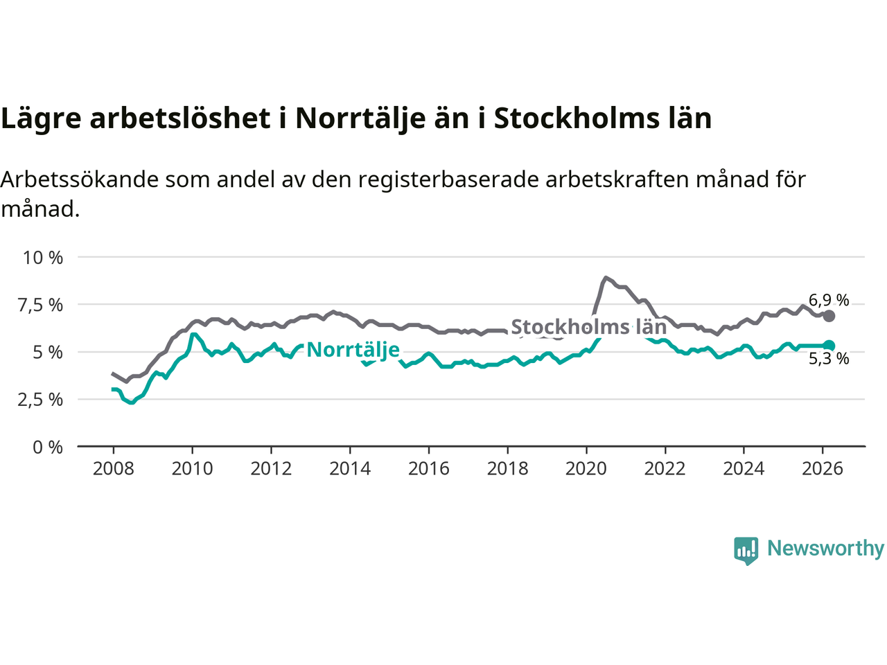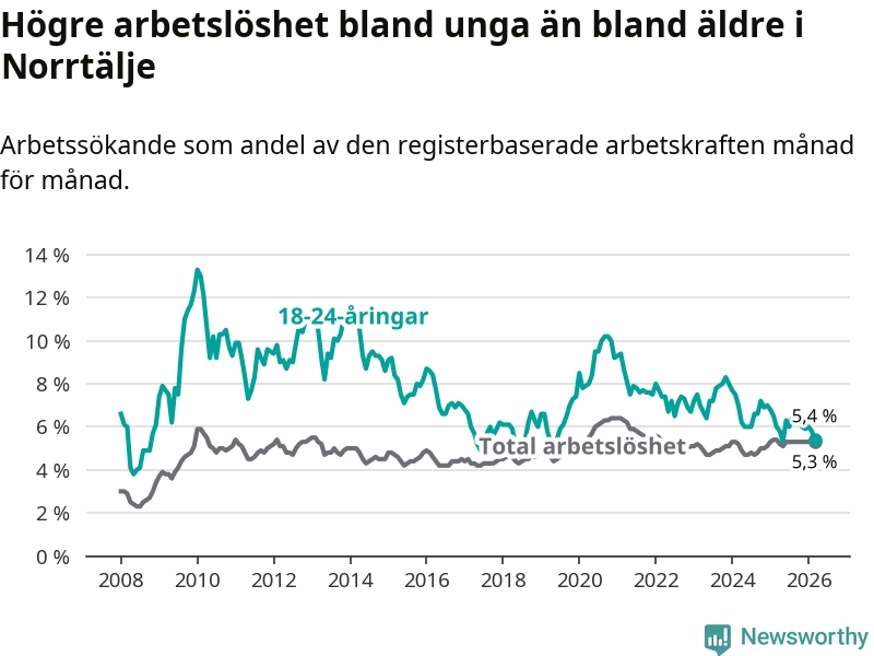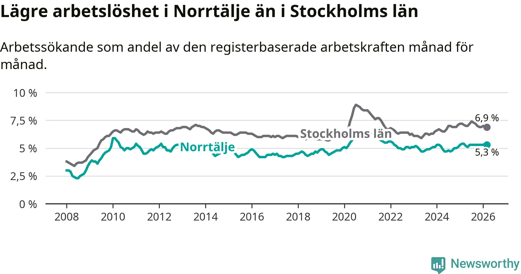 Under mars månad rapporterade Norrtälje kommun en total arbetslöshet på 5,3 procent. Det är en minskning jämfört med samma tidpunkt i fjol (−0,1 procentenheter). Även i Stockholms län sjunker arbetslösheten något.
