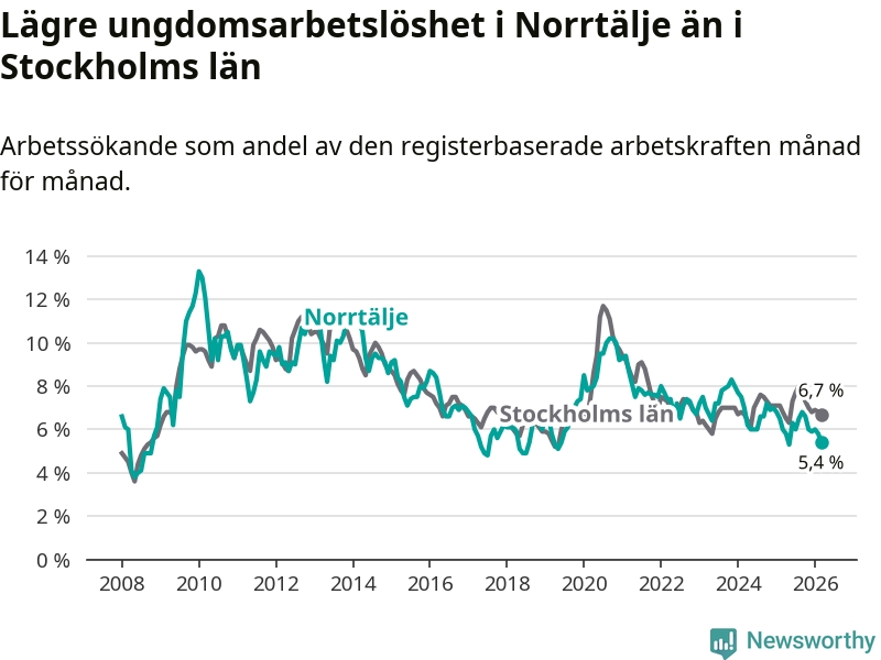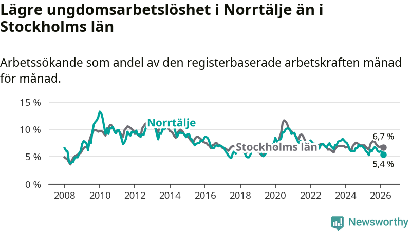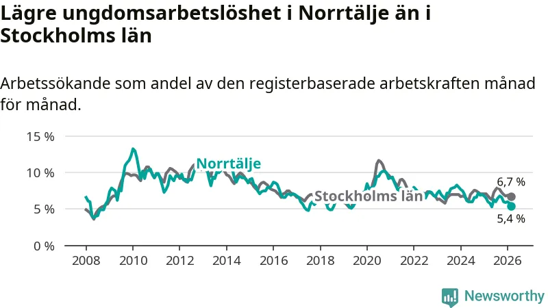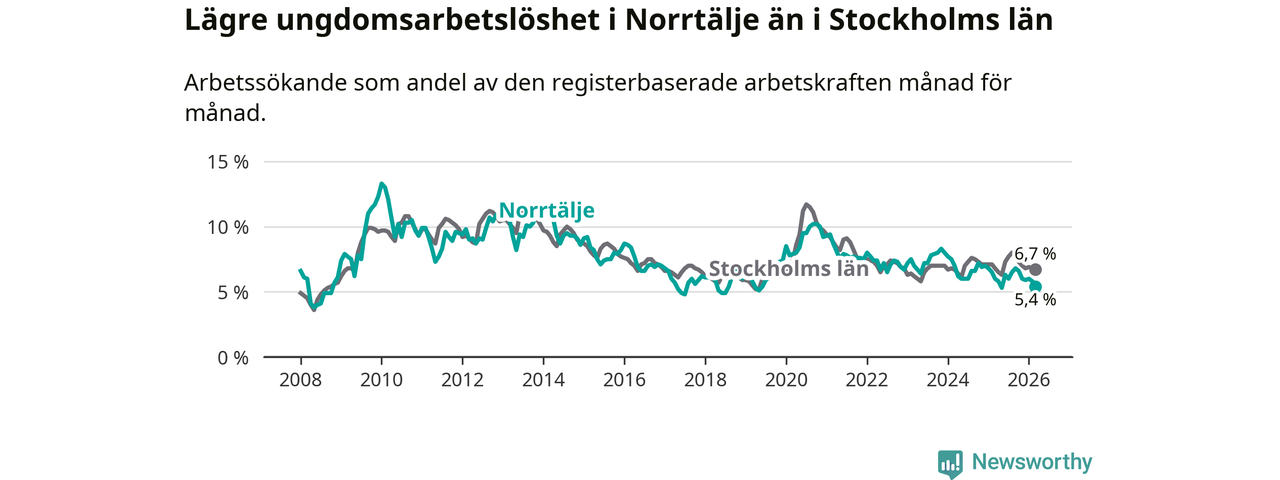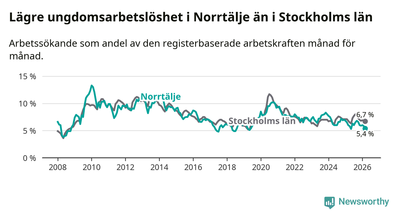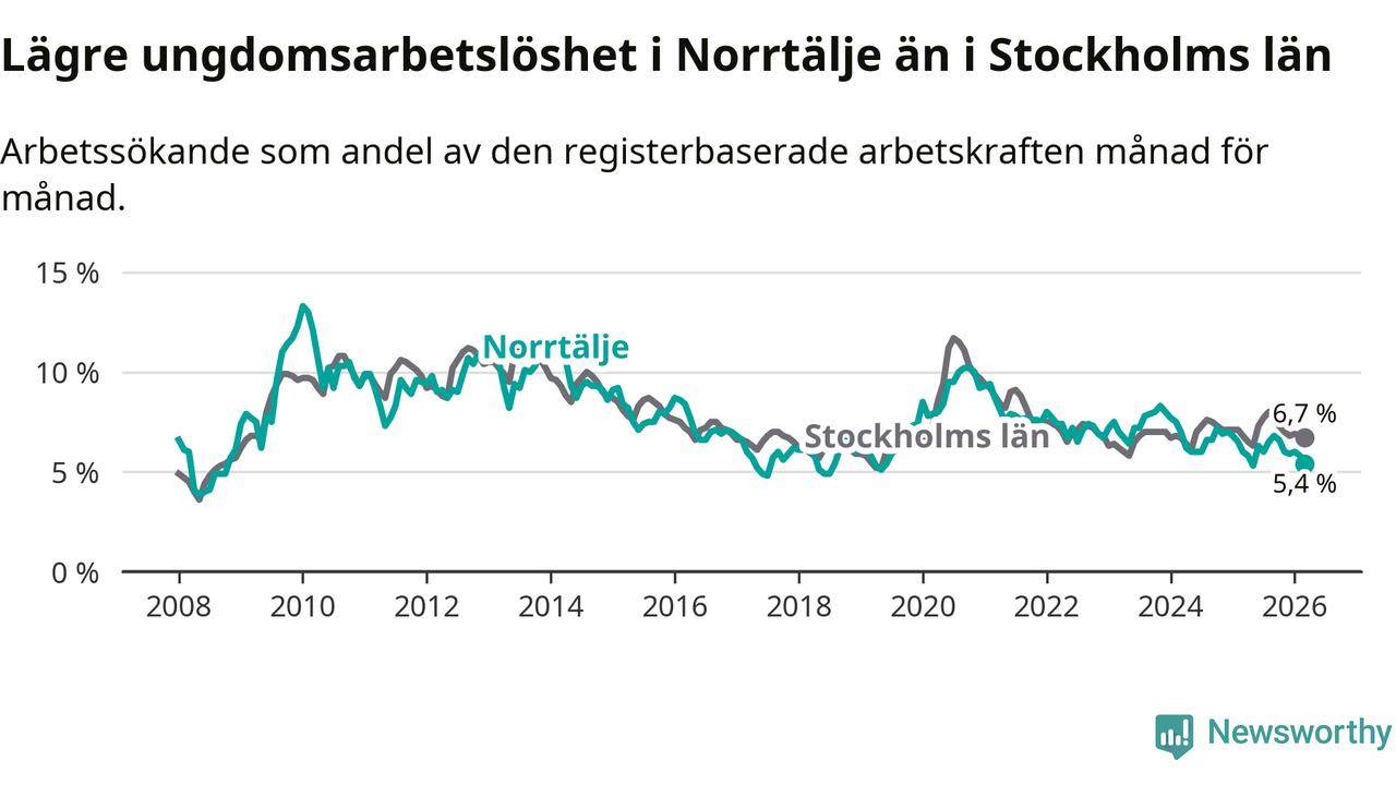 Precis som den totala arbetslösheten ligger ungdomsarbetslösheten i Norrtälje lägre än i Stockholms län som helhet. Skillnaden mellan kommunen och länet är 1,3 procentenheter.