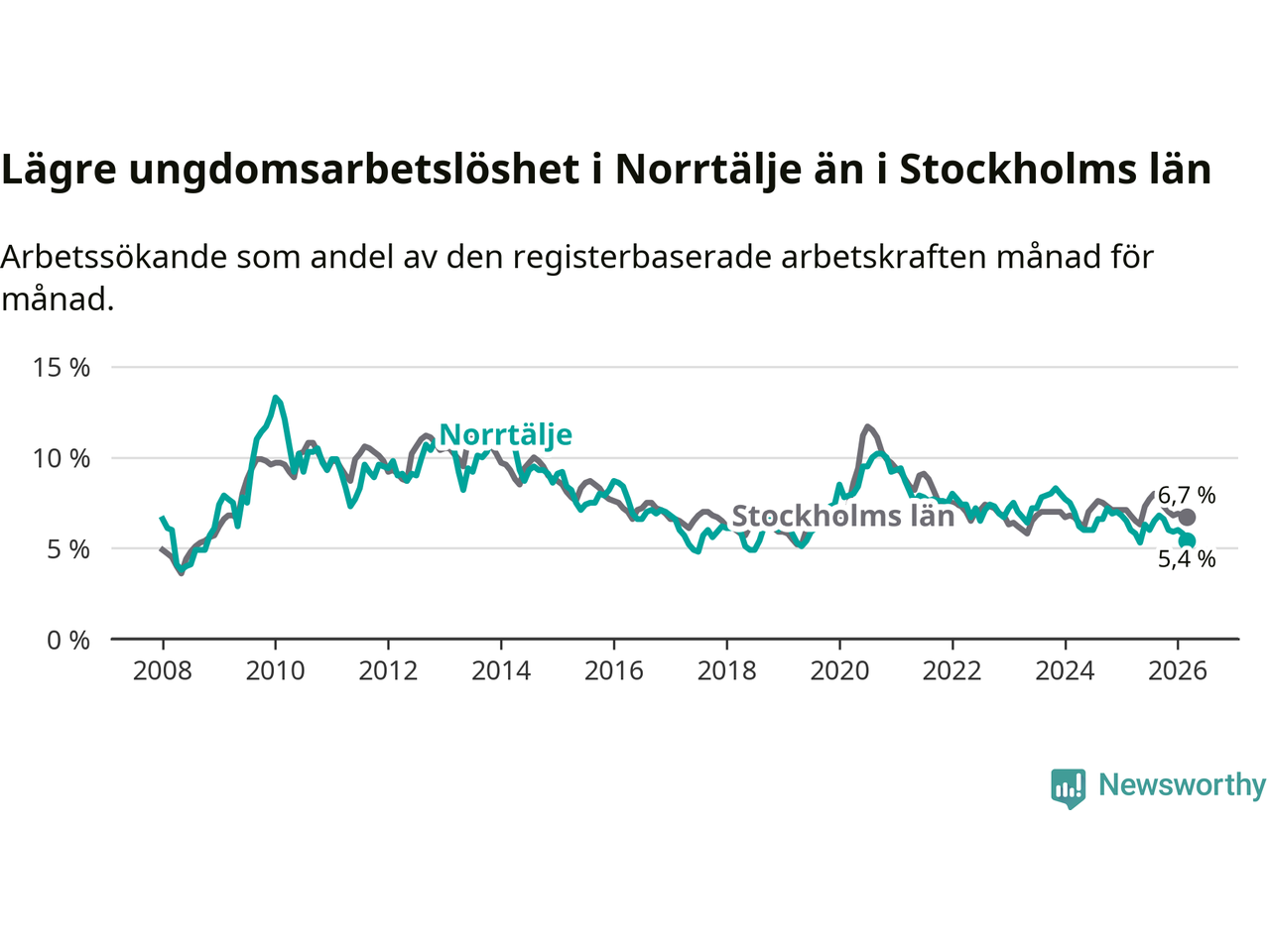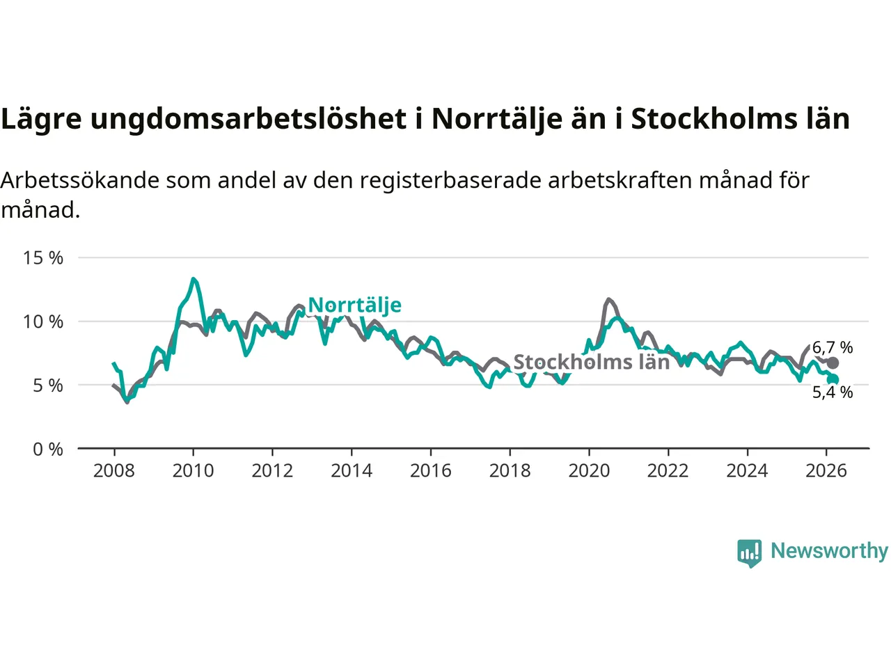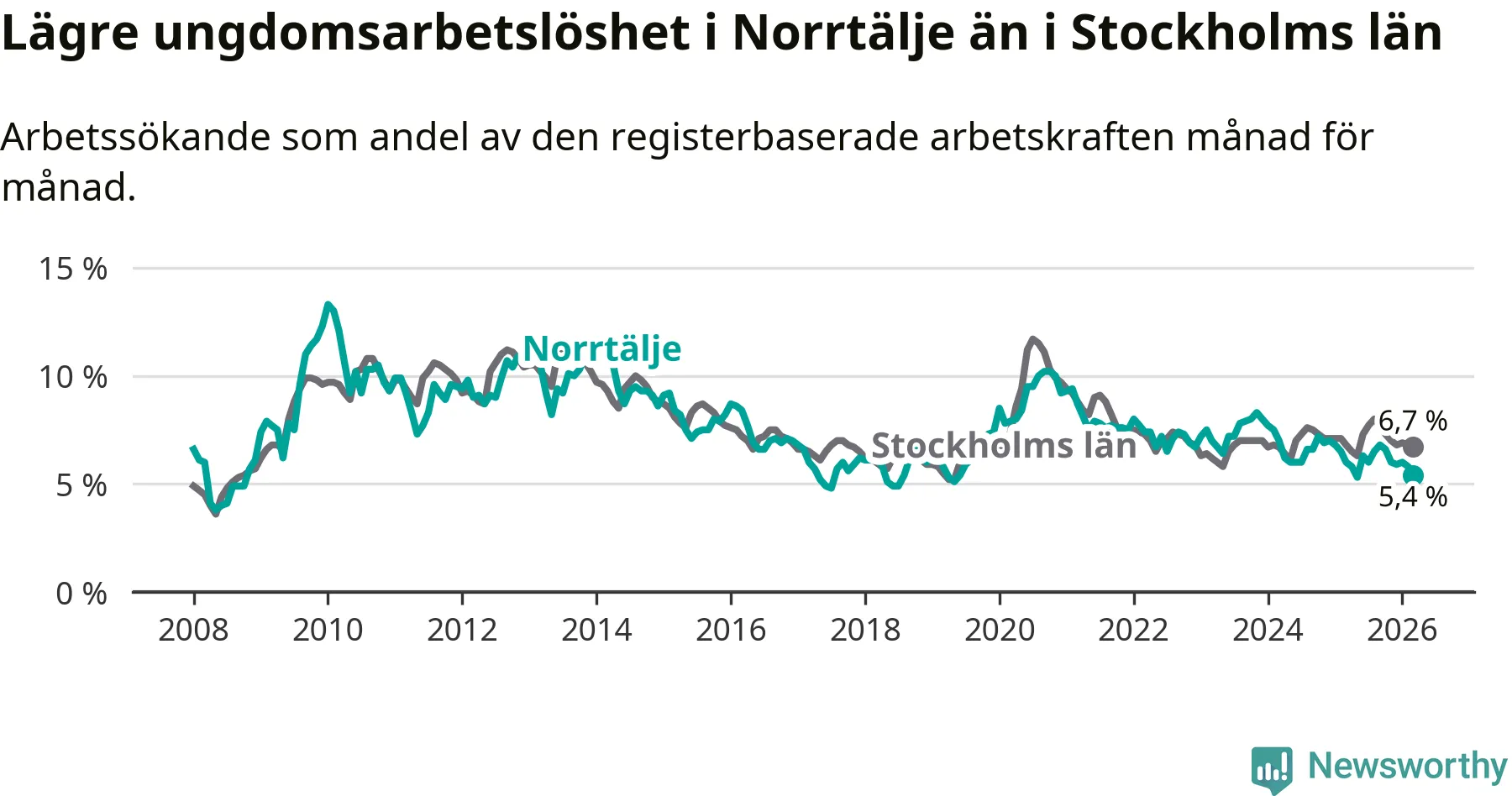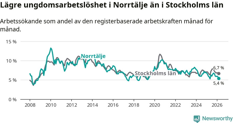 Precis som den totala arbetslösheten ligger ungdomsarbetslösheten i Norrtälje lägre än i Stockholms län som helhet. Skillnaden mellan kommunen och länet är 1,3 procentenheter.